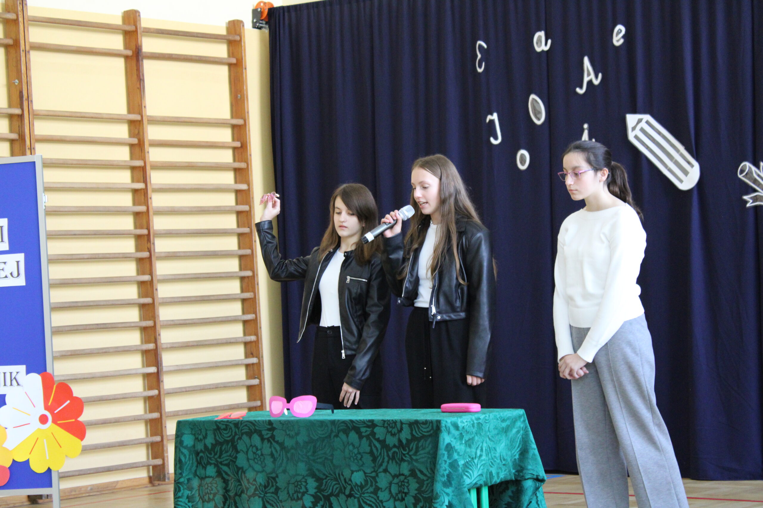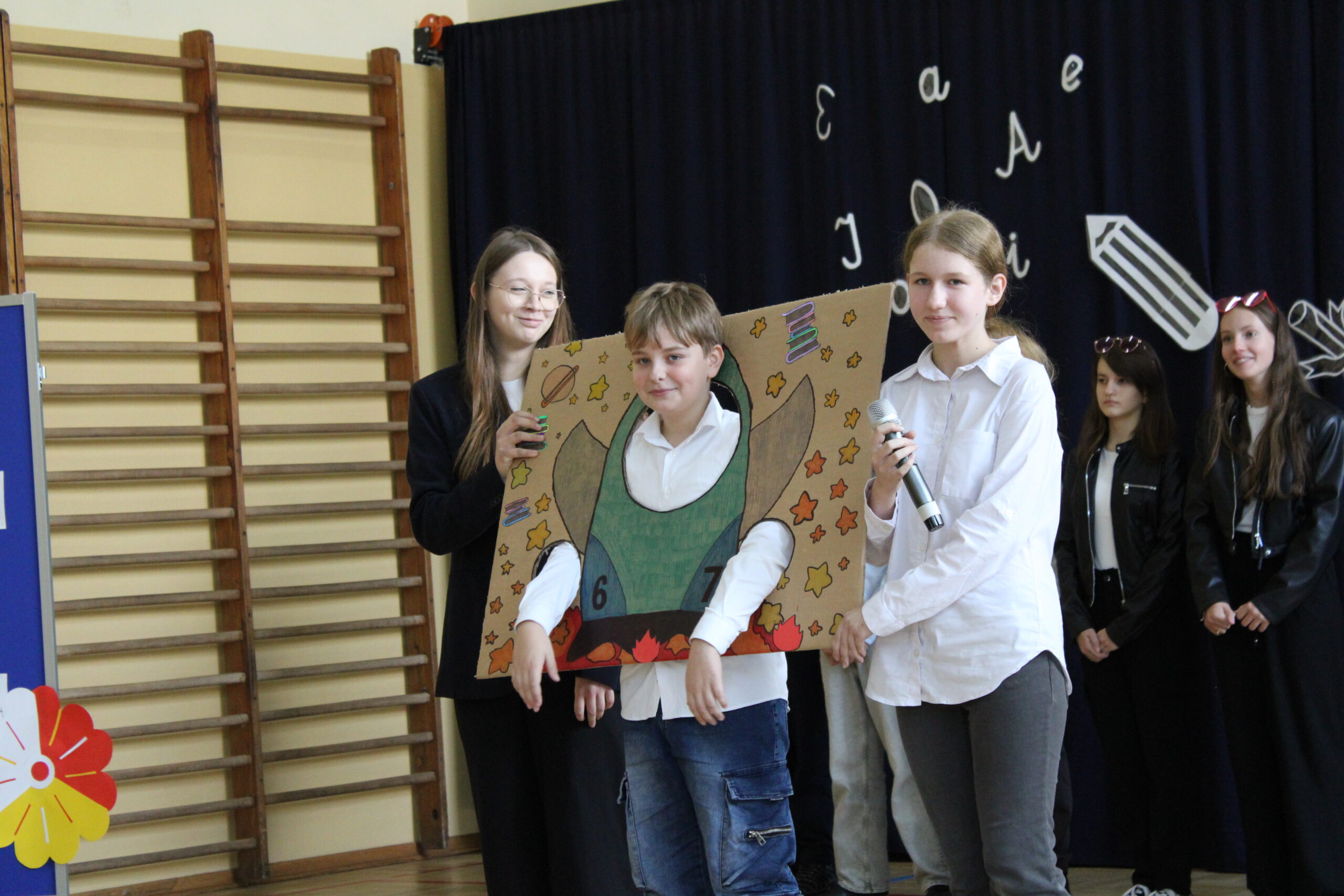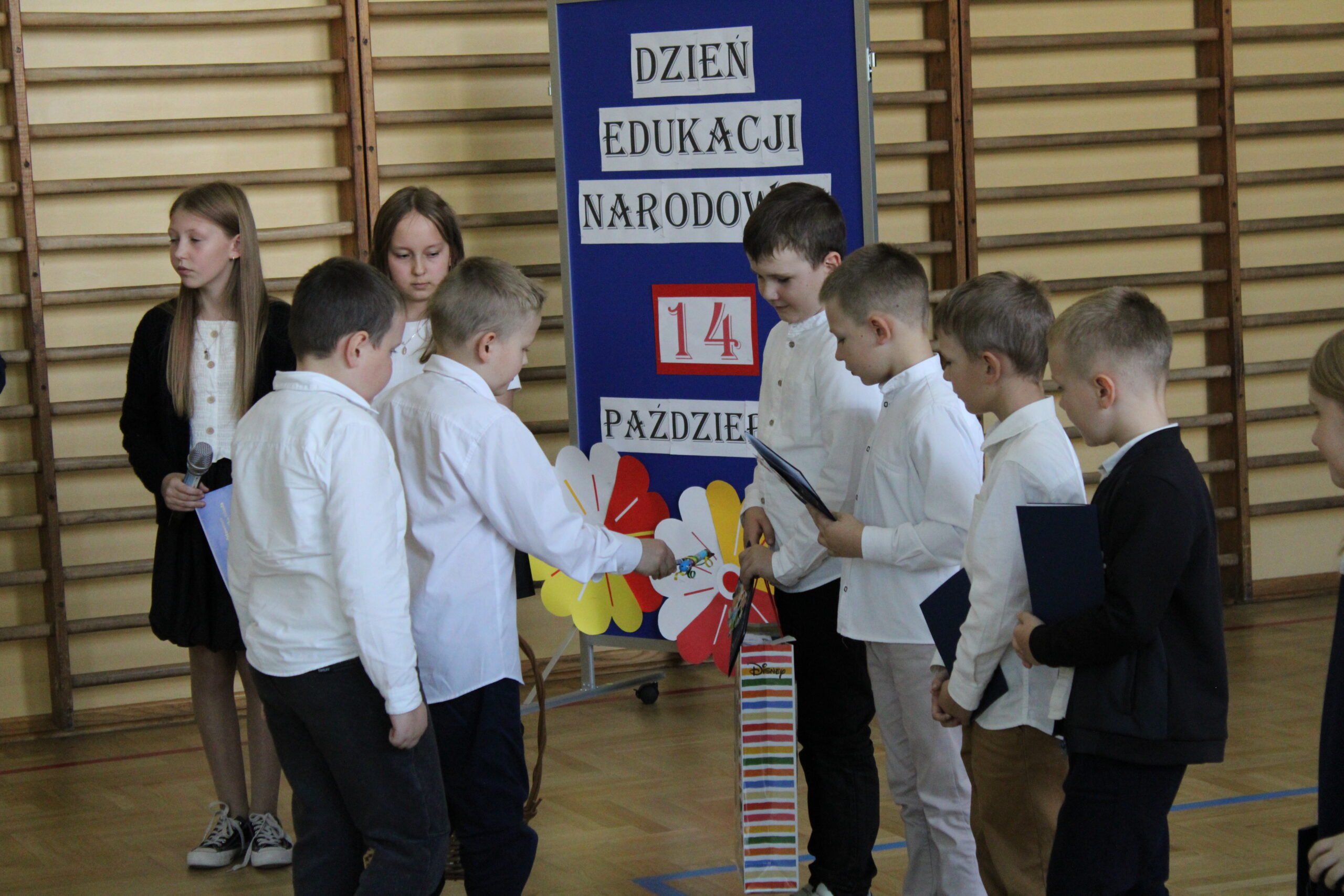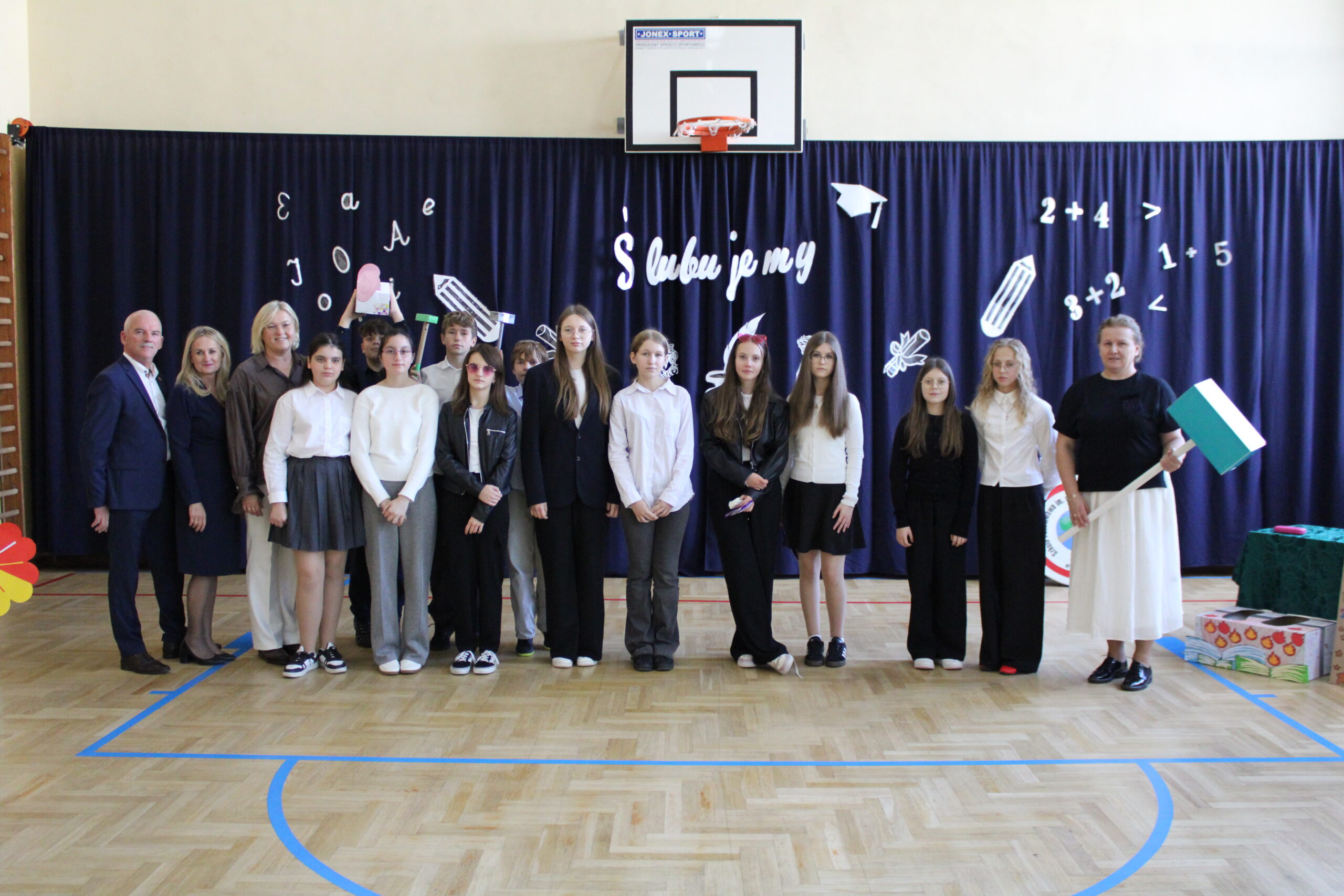 Kolejnym punktem uroczystości było przedstawienie pt.” Pokaz pomocy szkolnych” przygotowane przez uczniów klasy VII, którzy w zabawny sposób zaprezentowali codzienność szkolnego życia. Całość dopełniała oprawa muzyczna – uczniowie starszych klas zaśpiewali piosenkę dedykowaną nauczycielom, po czym przedstawiciele Samorządu Uczniowskiego wręczyli słodki upominek z dedykacją, dziękując za ich pracę i zaangażowanie.