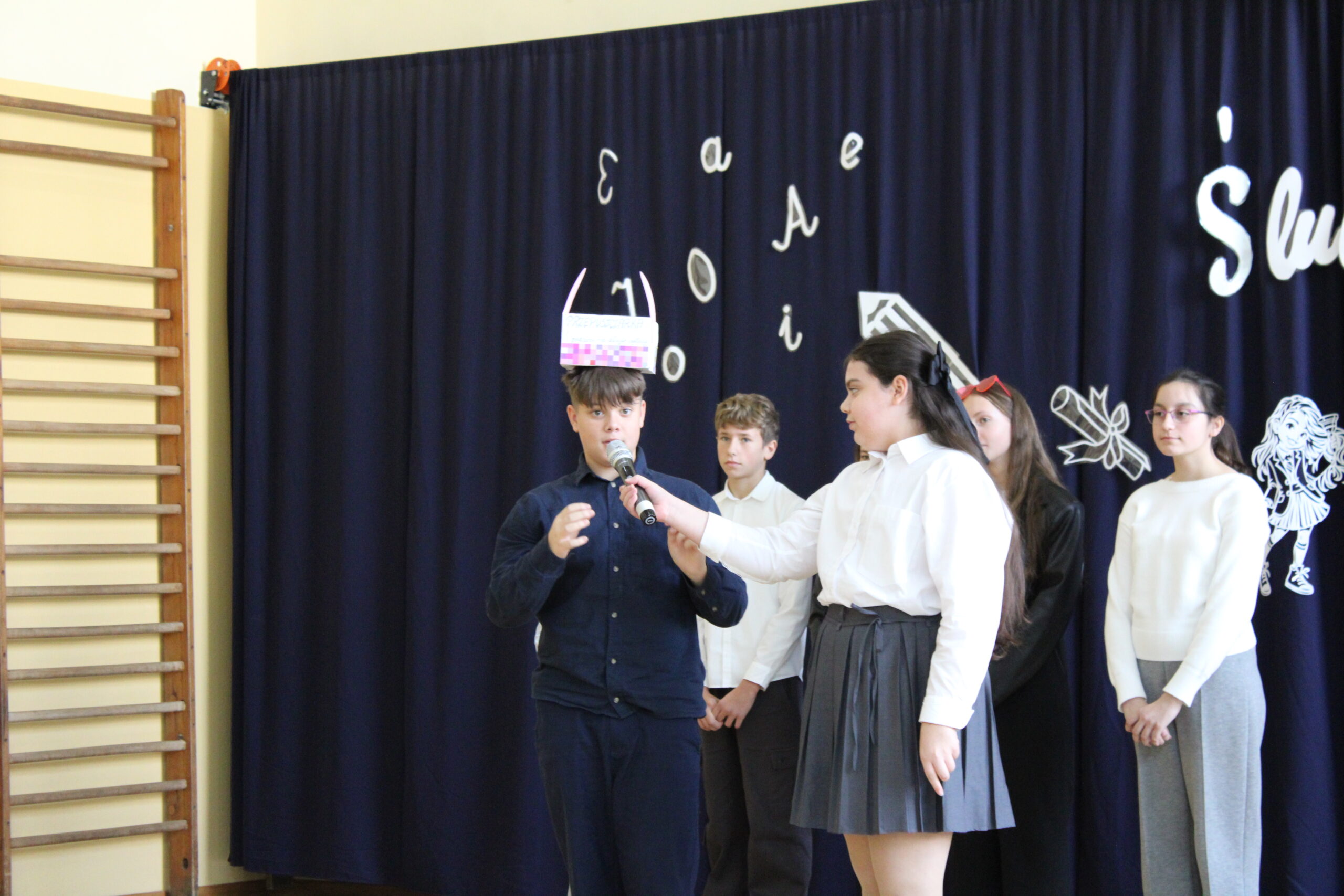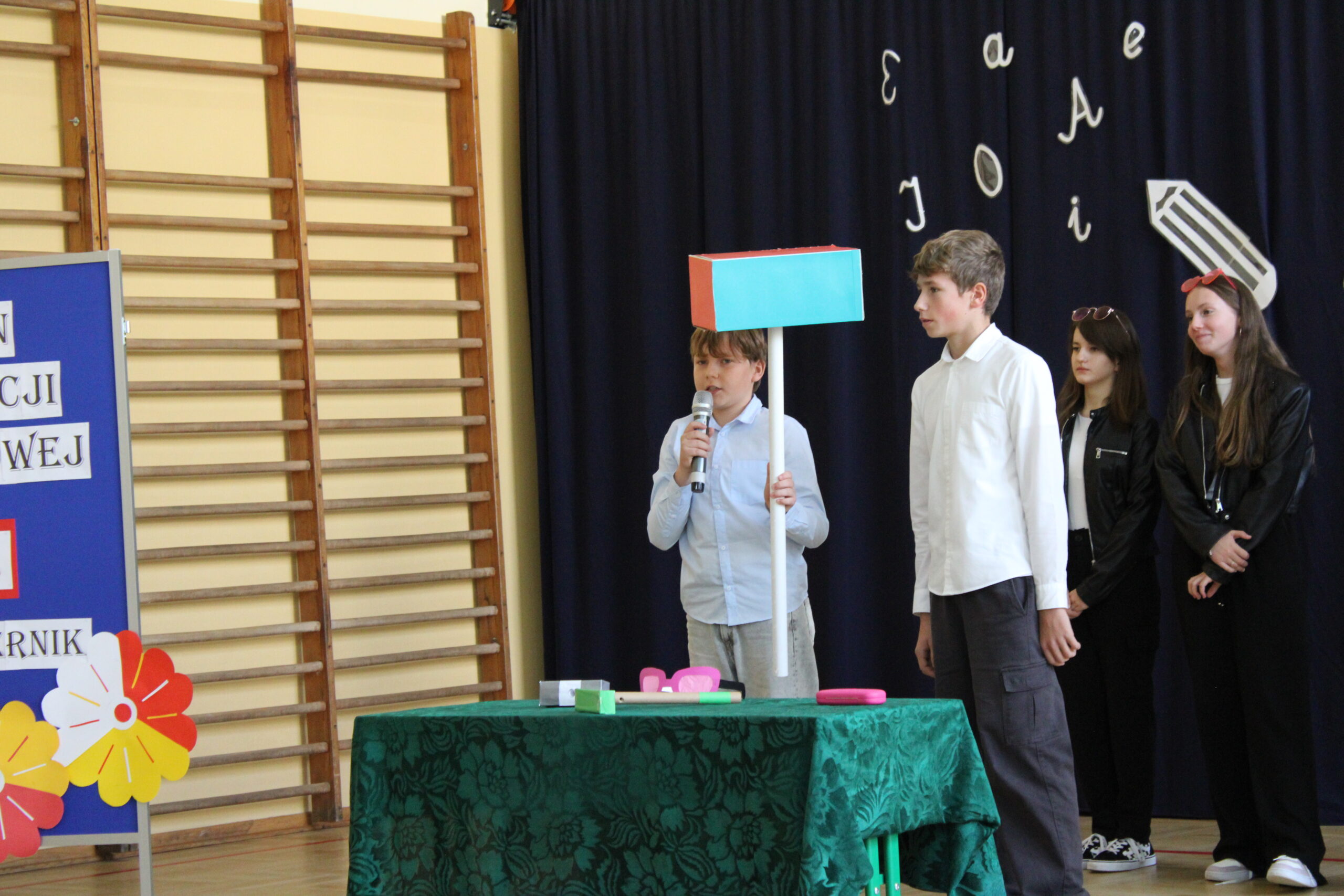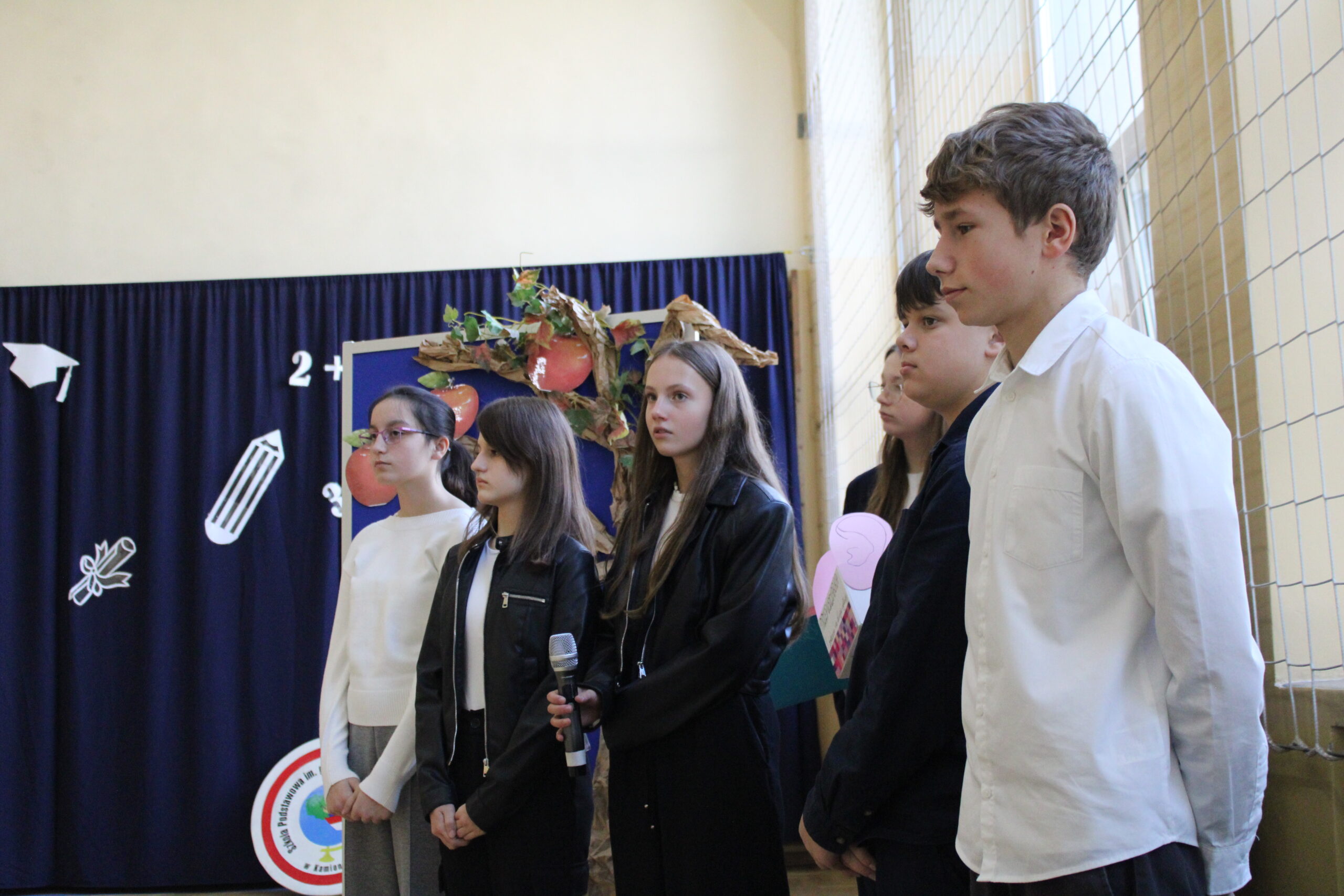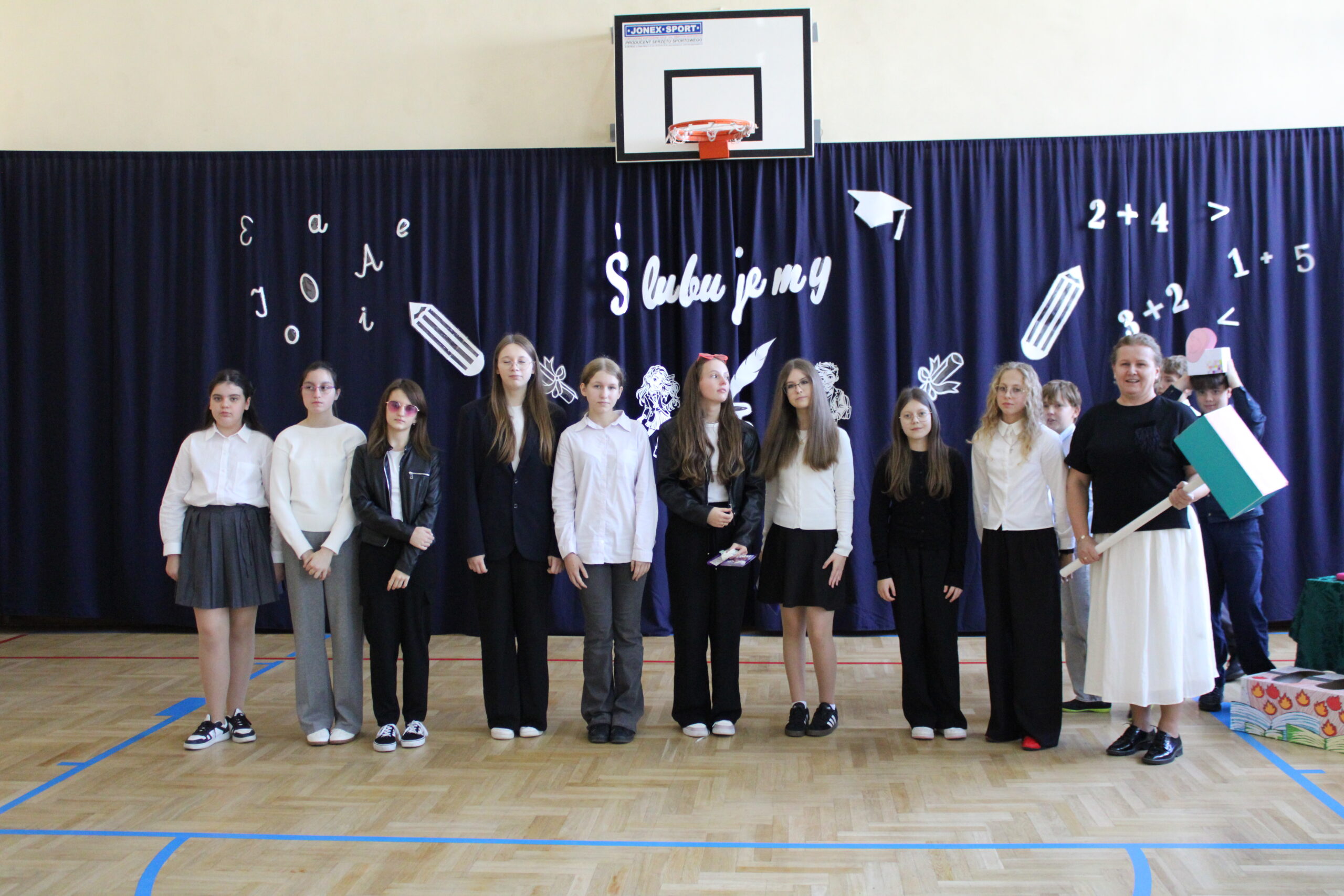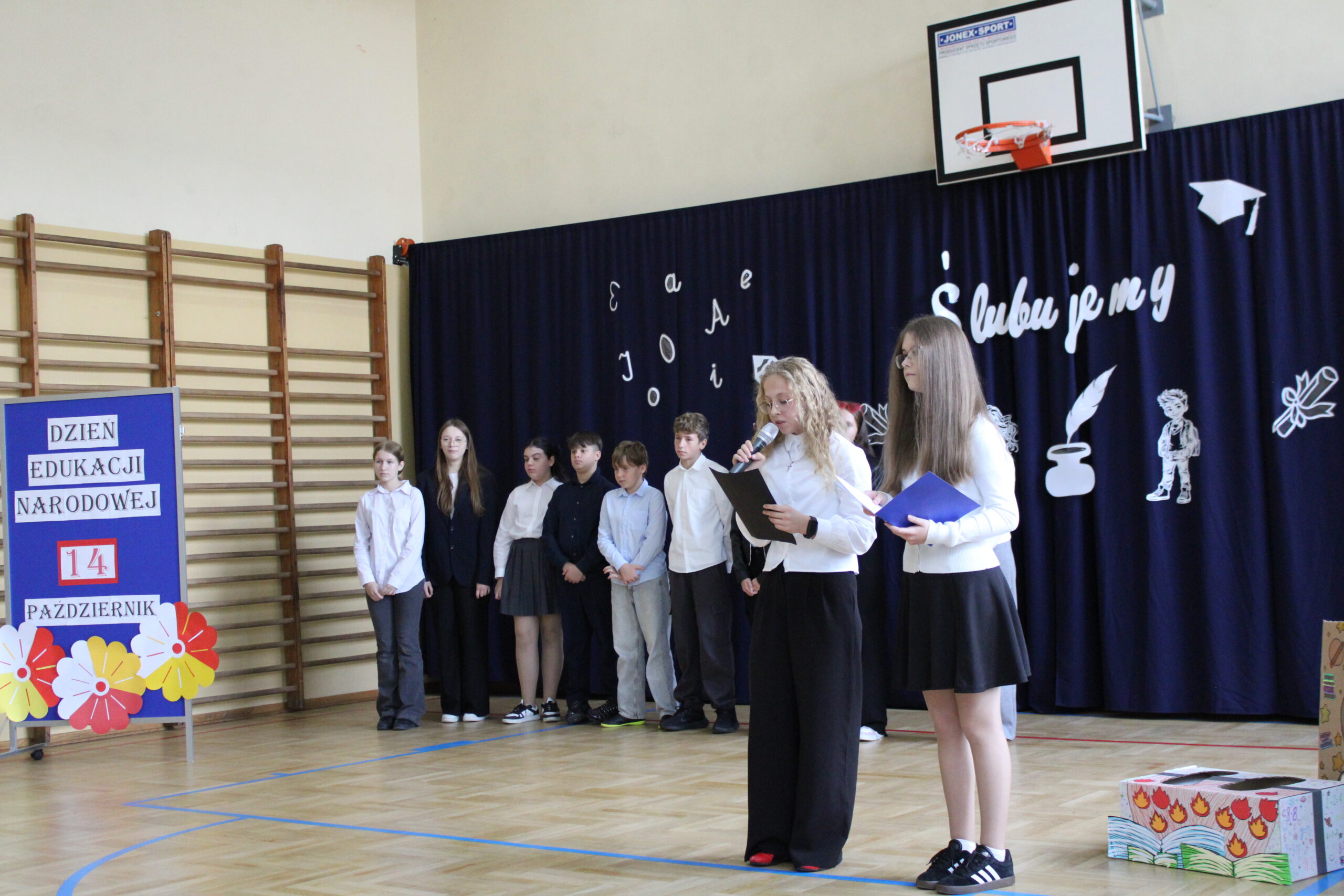 Kolejnym punktem uroczystości było przedstawienie pt.” Pokaz pomocy szkolnych” przygotowane przez uczniów klasy VII, którzy w zabawny sposób zaprezentowali codzienność szkolnego życia. Całość dopełniała oprawa muzyczna – uczniowie starszych klas zaśpiewali piosenkę dedykowaną nauczycielom, po czym przedstawiciele Samorządu Uczniowskiego wręczyli słodki upominek z dedykacją, dziękując za ich pracę i zaangażowanie.
