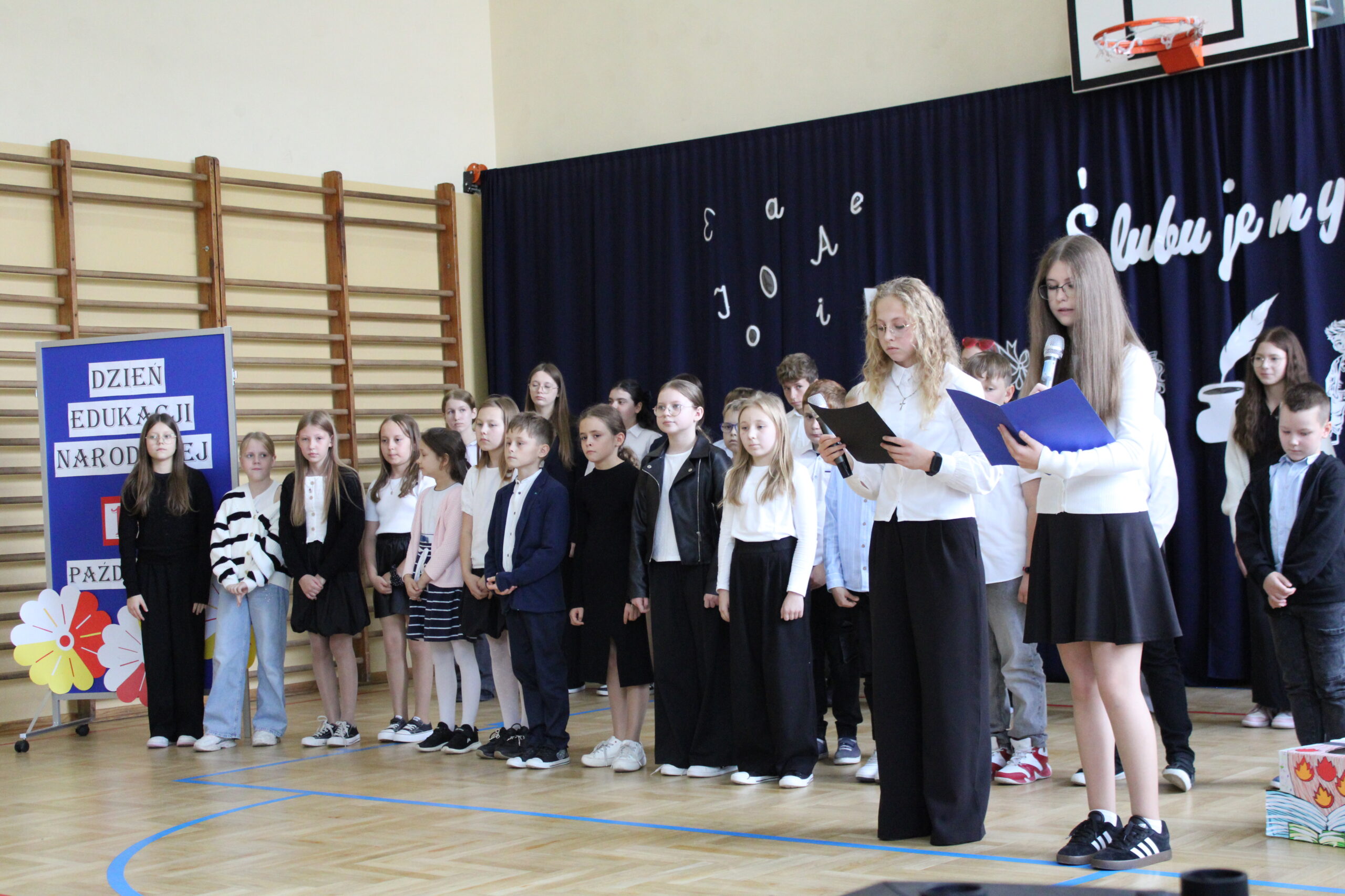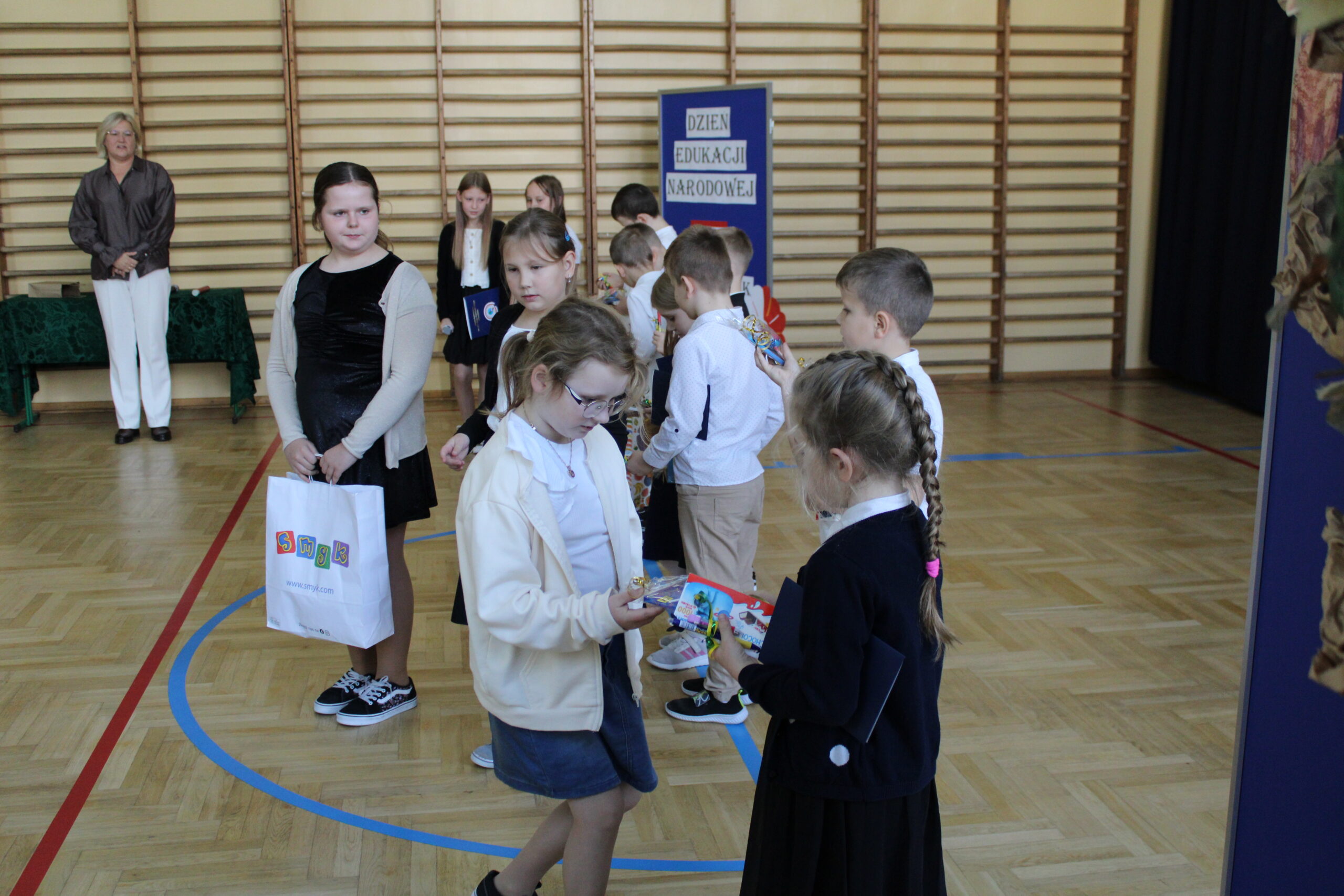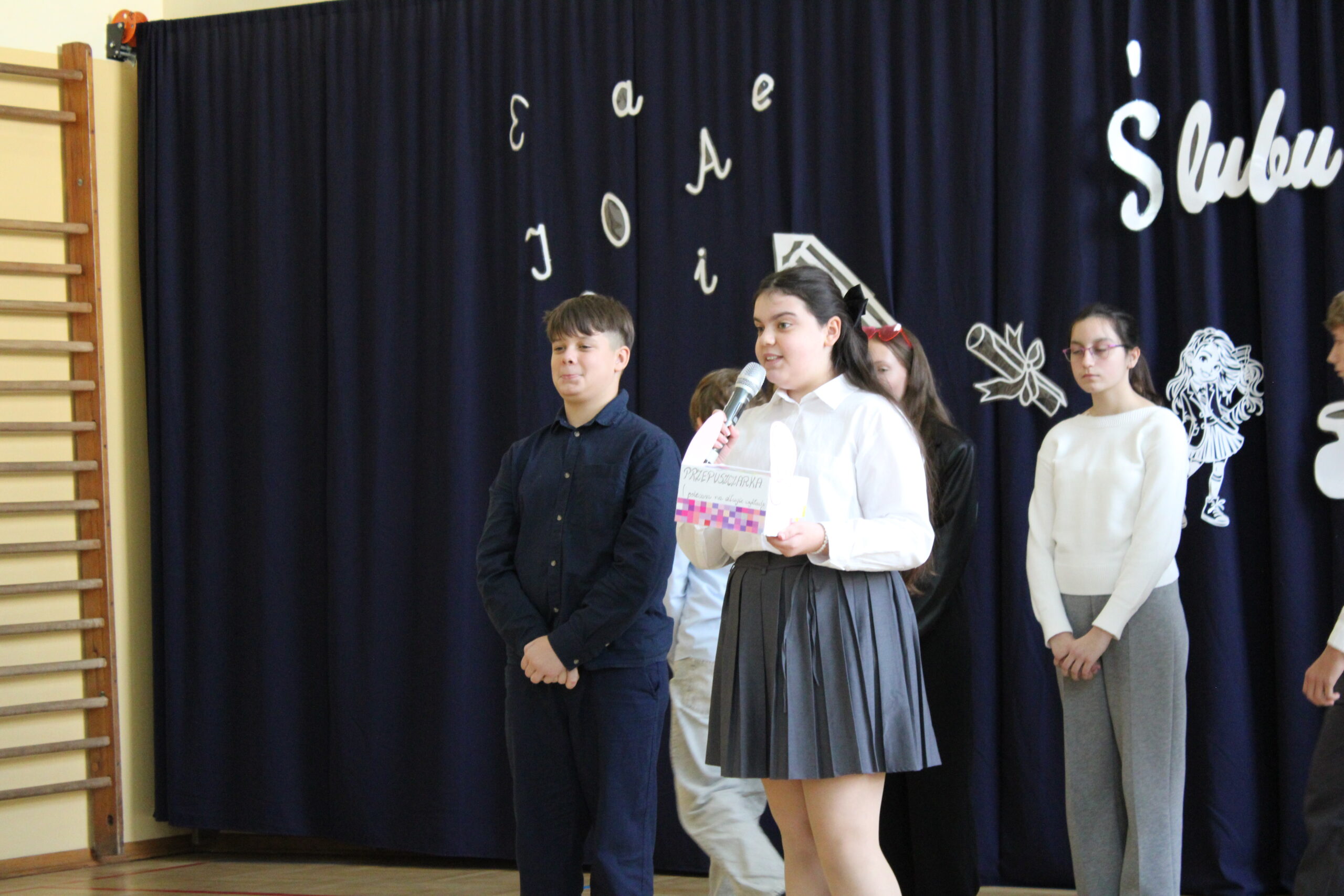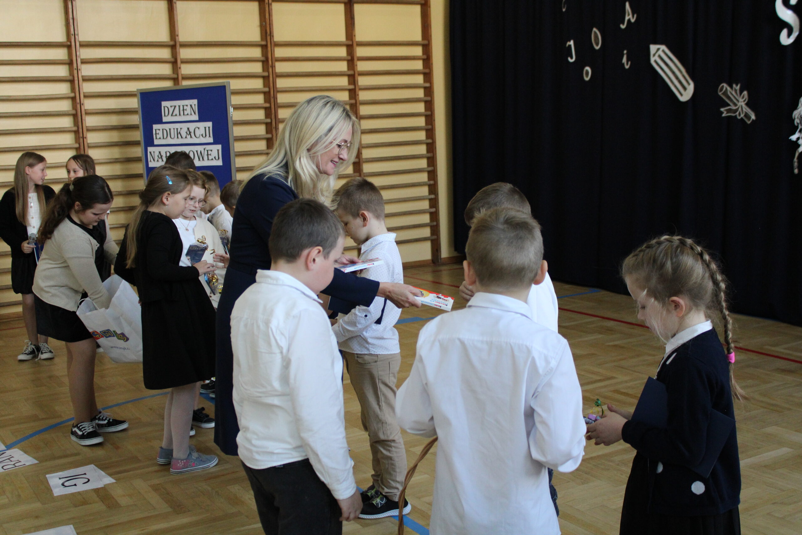 Kolejnym punktem uroczystości było przedstawienie pt.” Pokaz pomocy szkolnych” przygotowane przez uczniów klasy VII, którzy w zabawny sposób zaprezentowali codzienność szkolnego życia. Całość dopełniała oprawa muzyczna – uczniowie starszych klas zaśpiewali piosenkę dedykowaną nauczycielom, po czym przedstawiciele Samorządu Uczniowskiego wręczyli słodki upominek z dedykacją, dziękując za ich pracę i zaangażowanie.