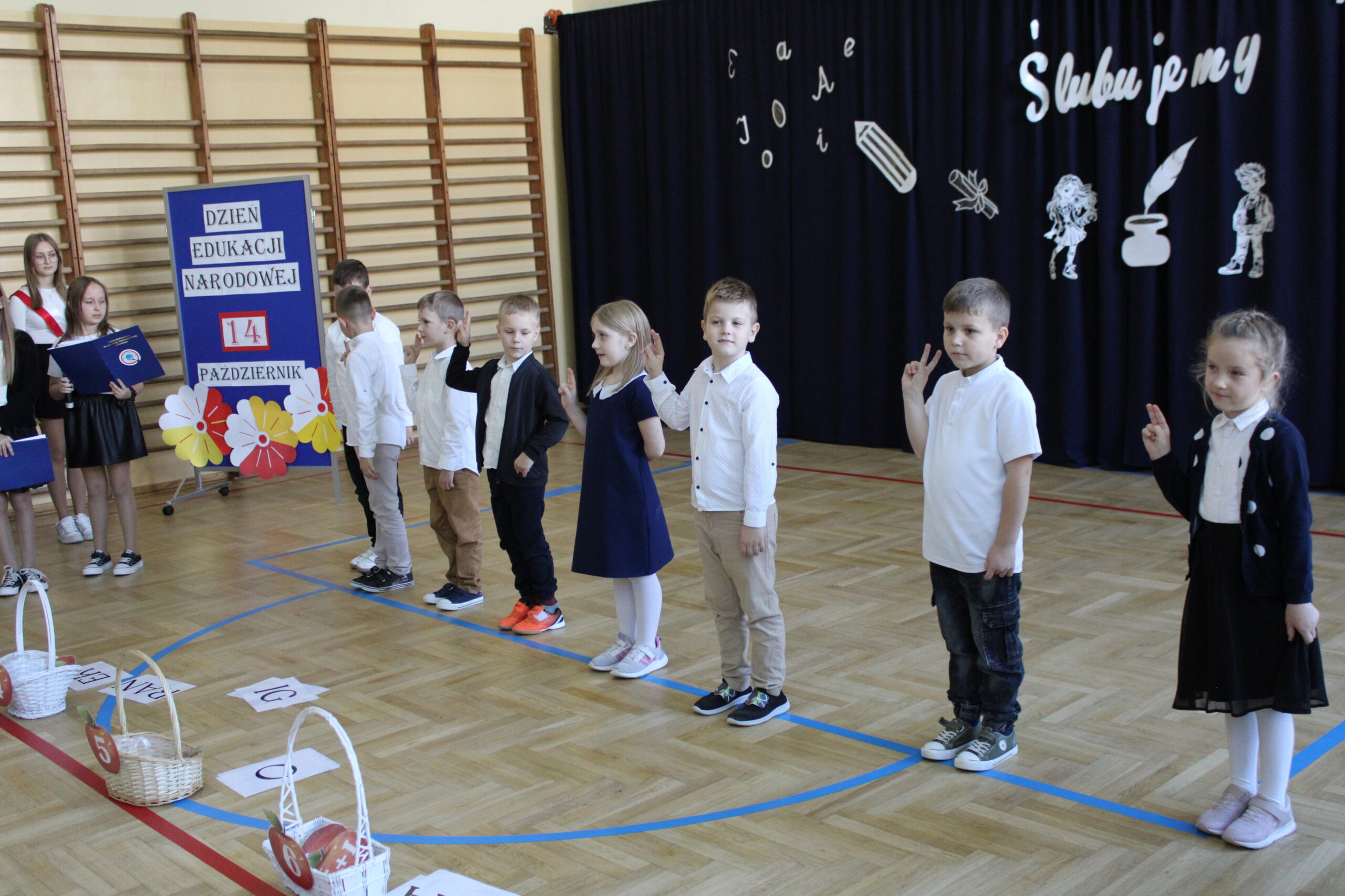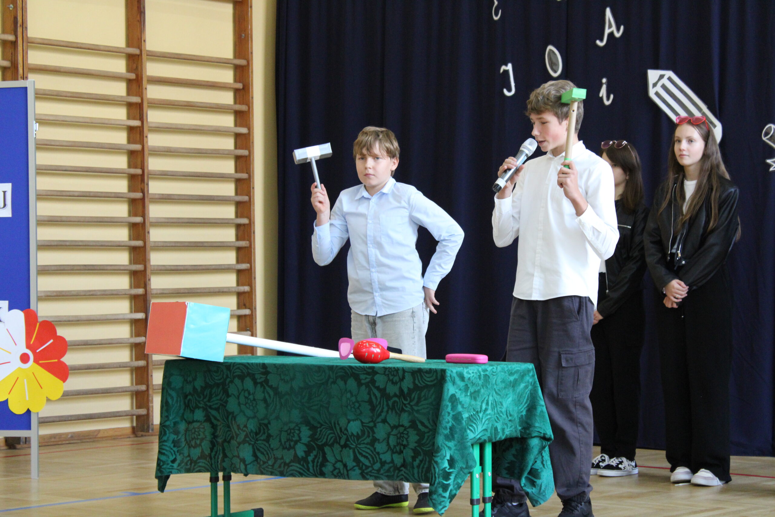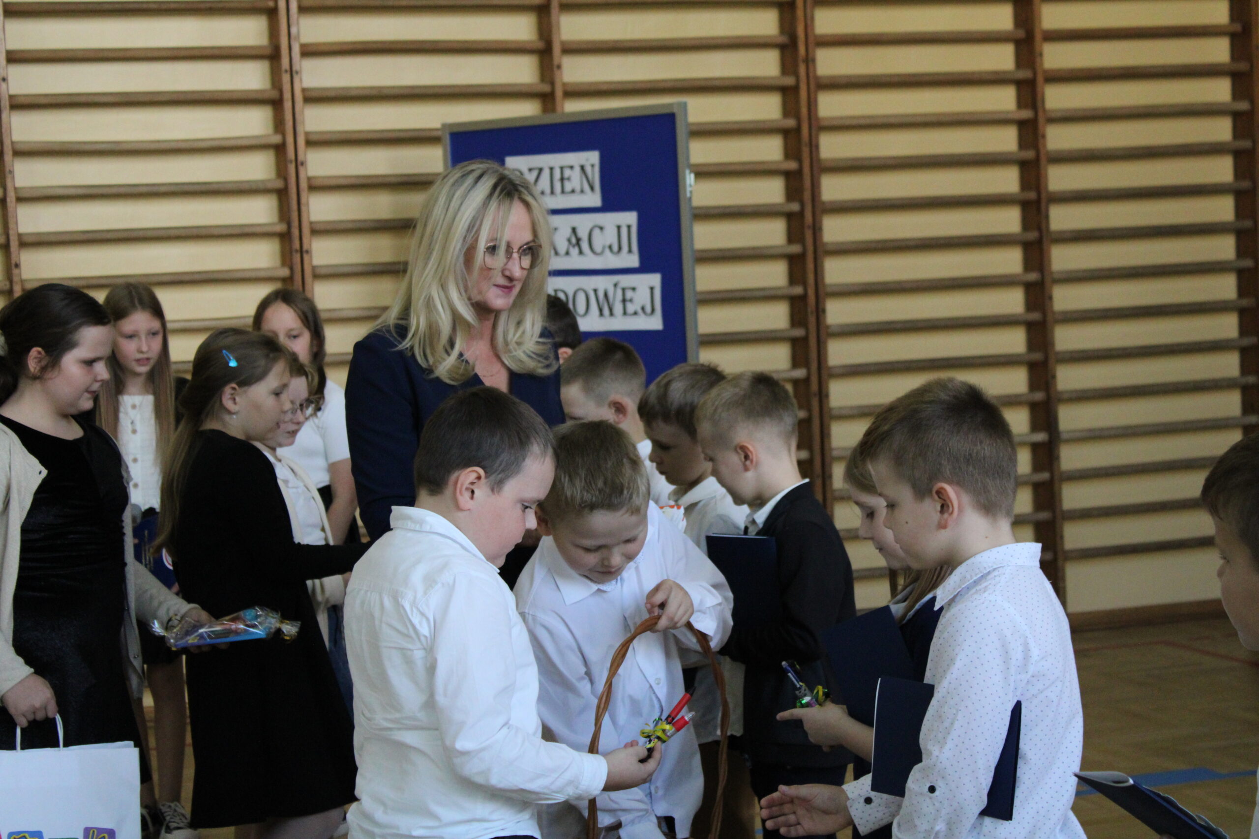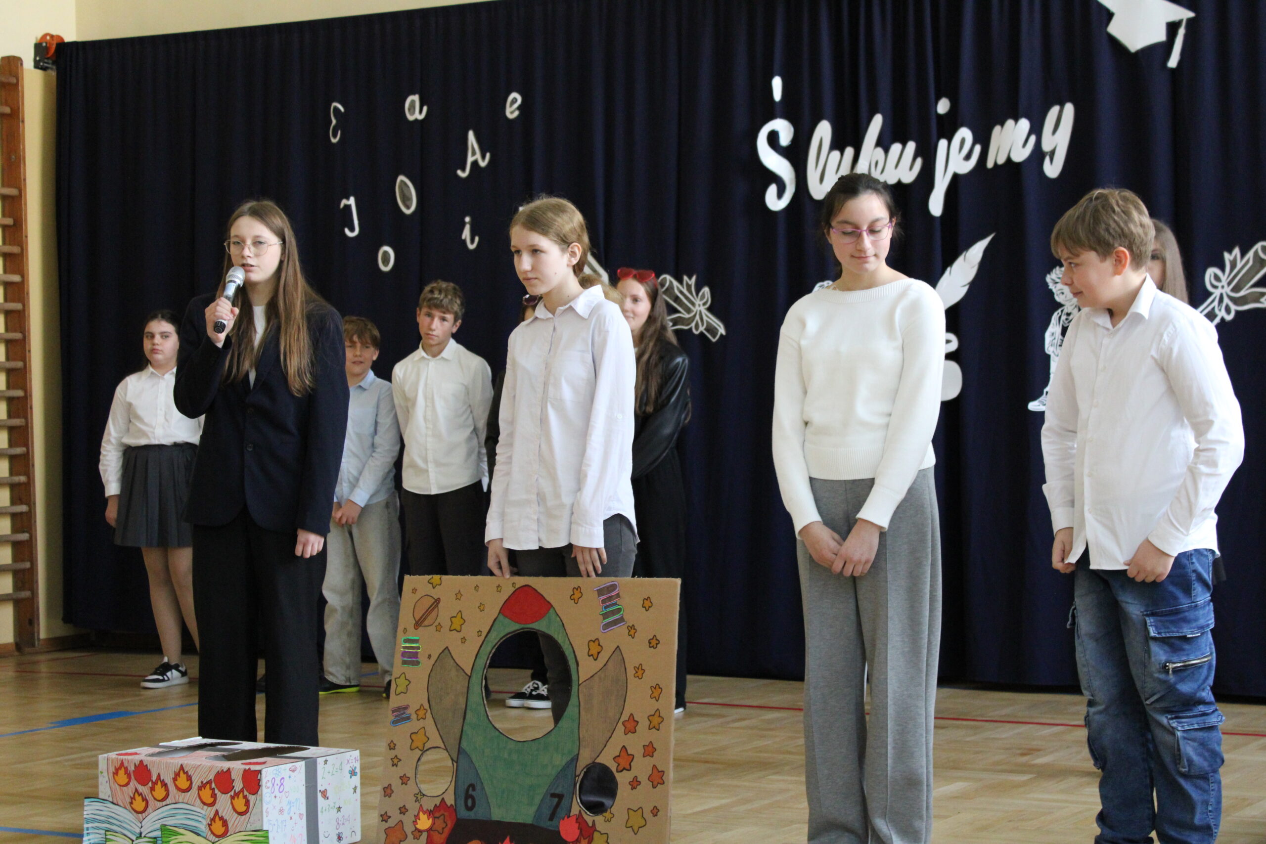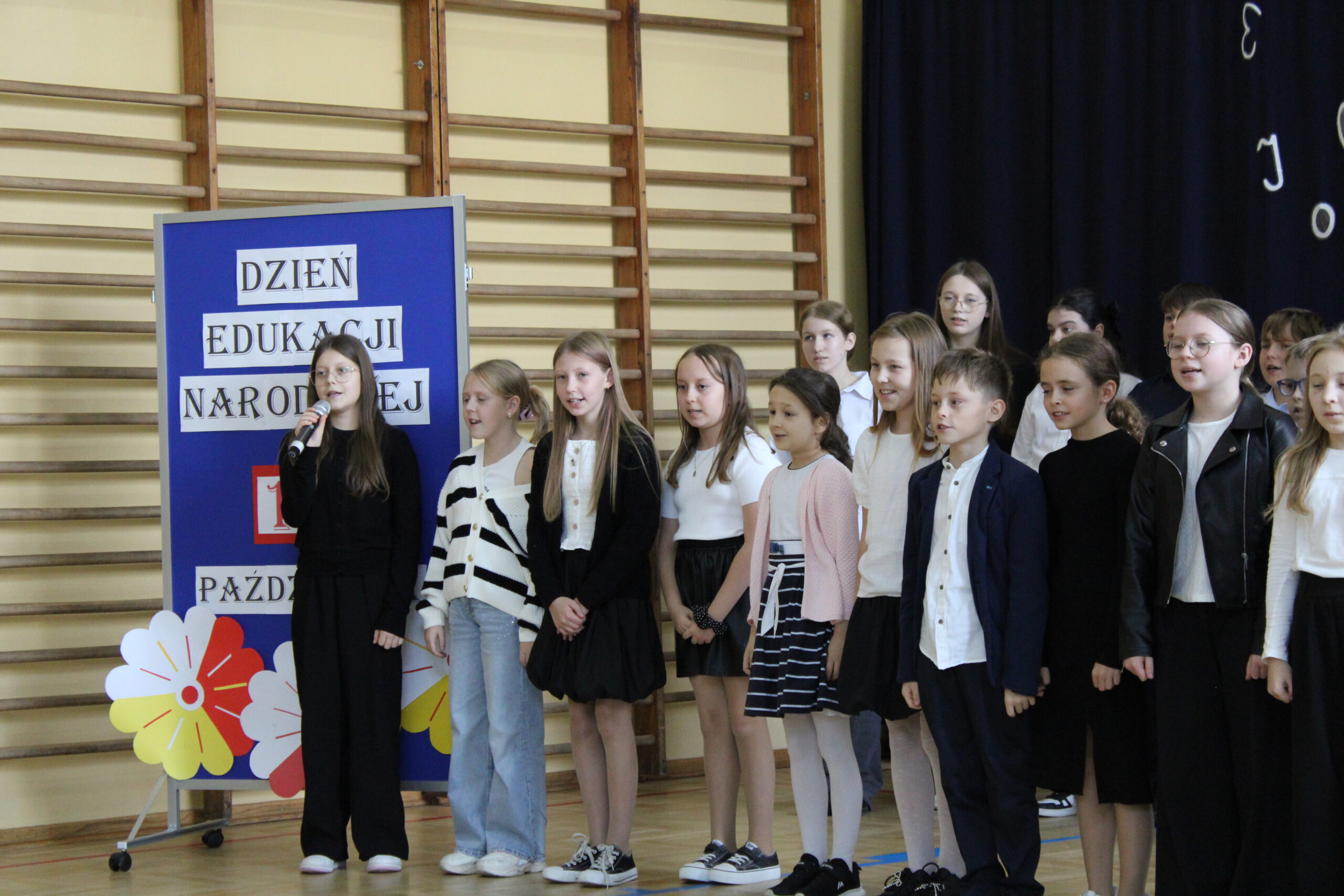 Kolejnym punktem uroczystości było przedstawienie pt.” Pokaz pomocy szkolnych” przygotowane przez uczniów klasy VII, którzy w zabawny sposób zaprezentowali codzienność szkolnego życia. Całość dopełniała oprawa muzyczna – uczniowie starszych klas zaśpiewali piosenkę dedykowaną nauczycielom, po czym przedstawiciele Samorządu Uczniowskiego wręczyli słodki upominek z dedykacją, dziękując za ich pracę i zaangażowanie.