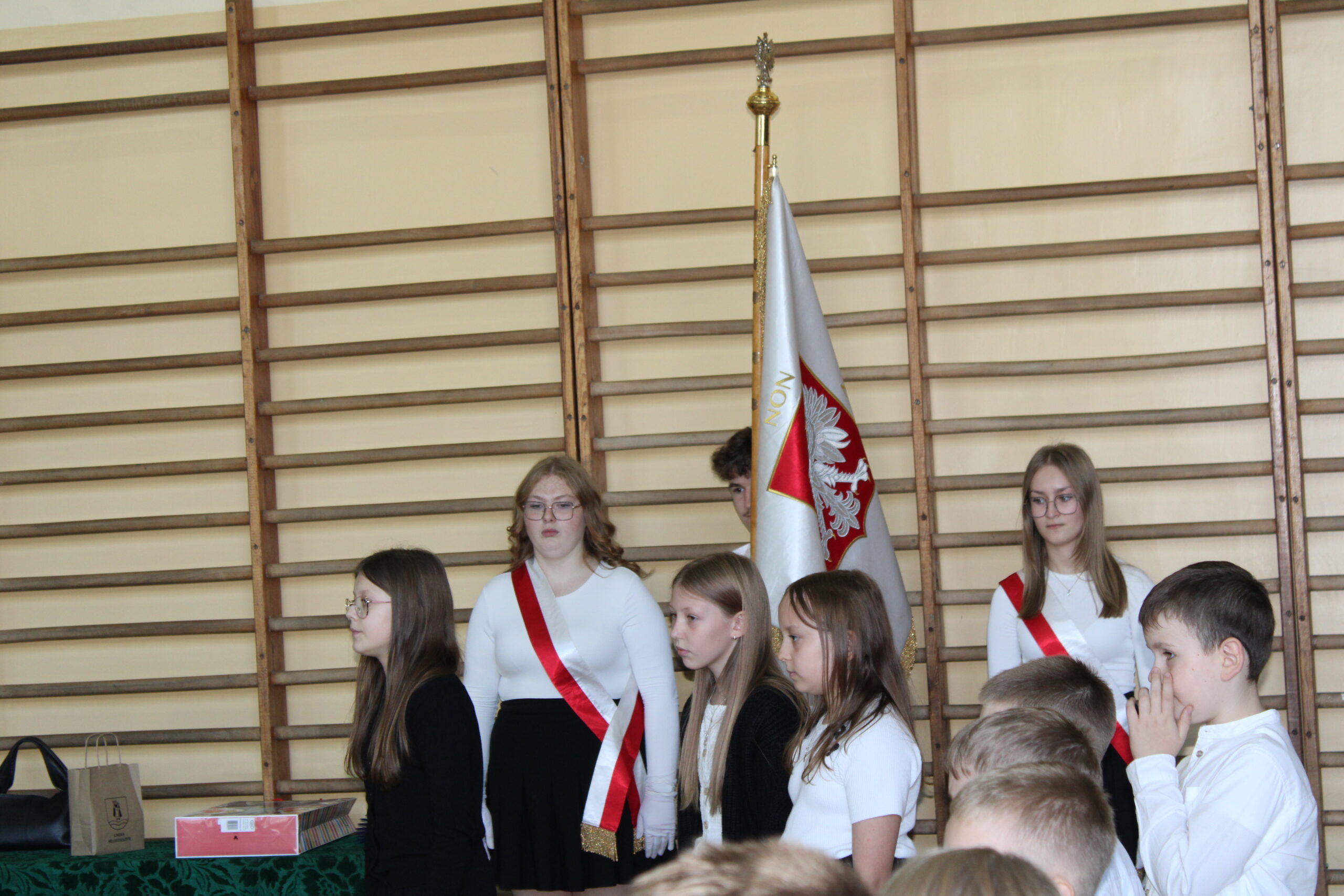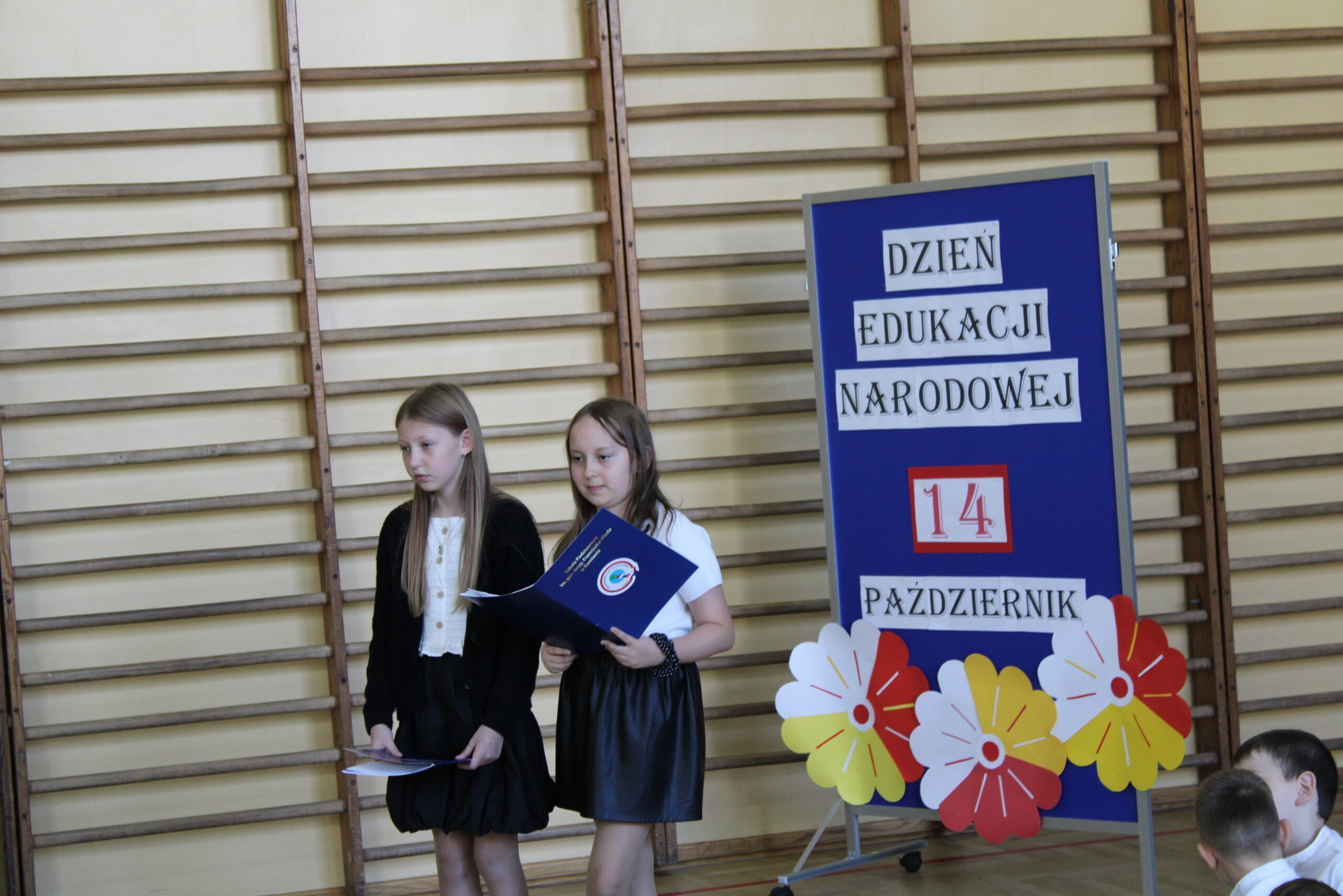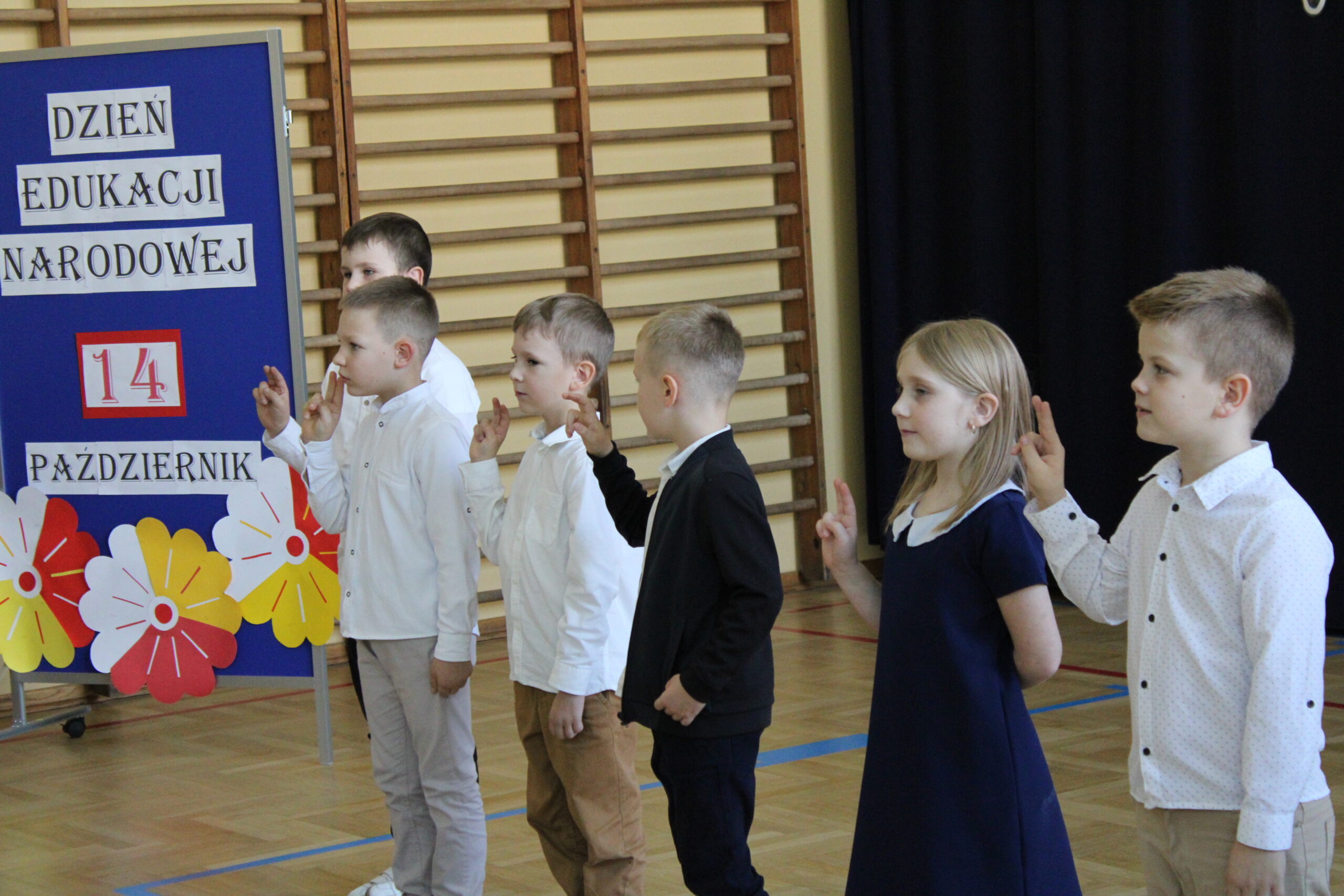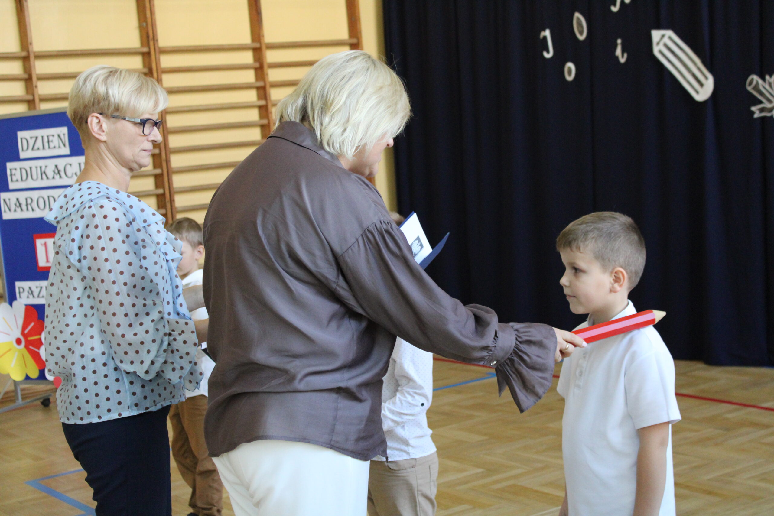 Kolejnym punktem uroczystości było przedstawienie pt.” Pokaz pomocy szkolnych” przygotowane przez uczniów klasy VII, którzy w zabawny sposób zaprezentowali codzienność szkolnego życia. Całość dopełniała oprawa muzyczna – uczniowie starszych klas zaśpiewali piosenkę dedykowaną nauczycielom, po czym przedstawiciele Samorządu Uczniowskiego wręczyli słodki upominek z dedykacją, dziękując za ich pracę i zaangażowanie.