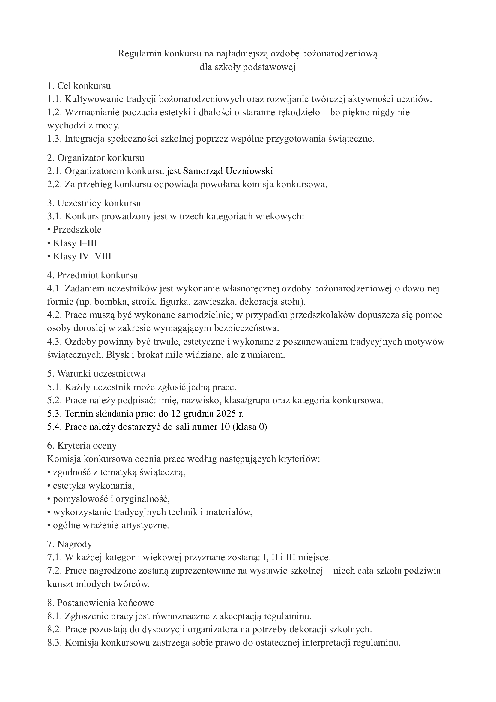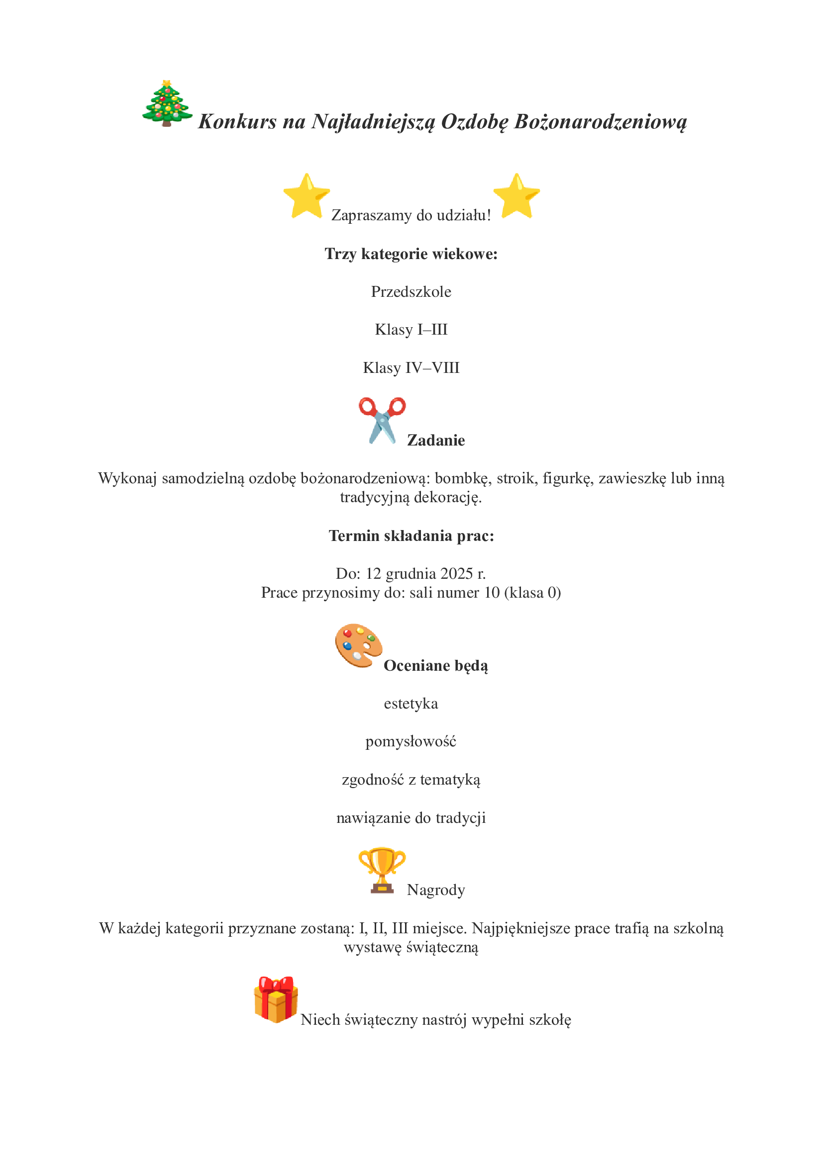 Zapraszamy do udziału w konkursie na najpiękniejszą ozdobę bożonarodzeniową! 🎄✨🎁⭐❄️🎀🎅🌟🧸🎨 18 listopada 2025 monikab z życia szkoły 0