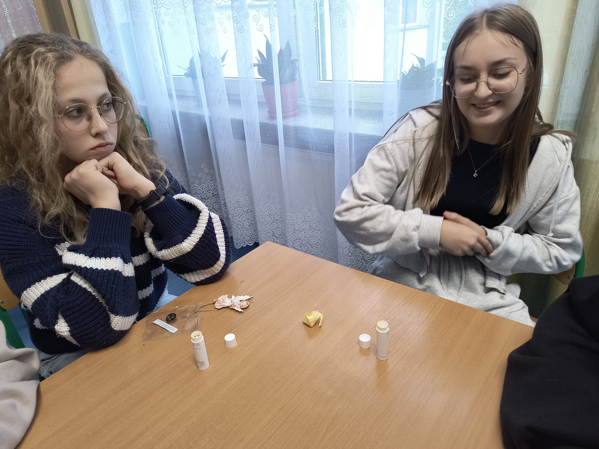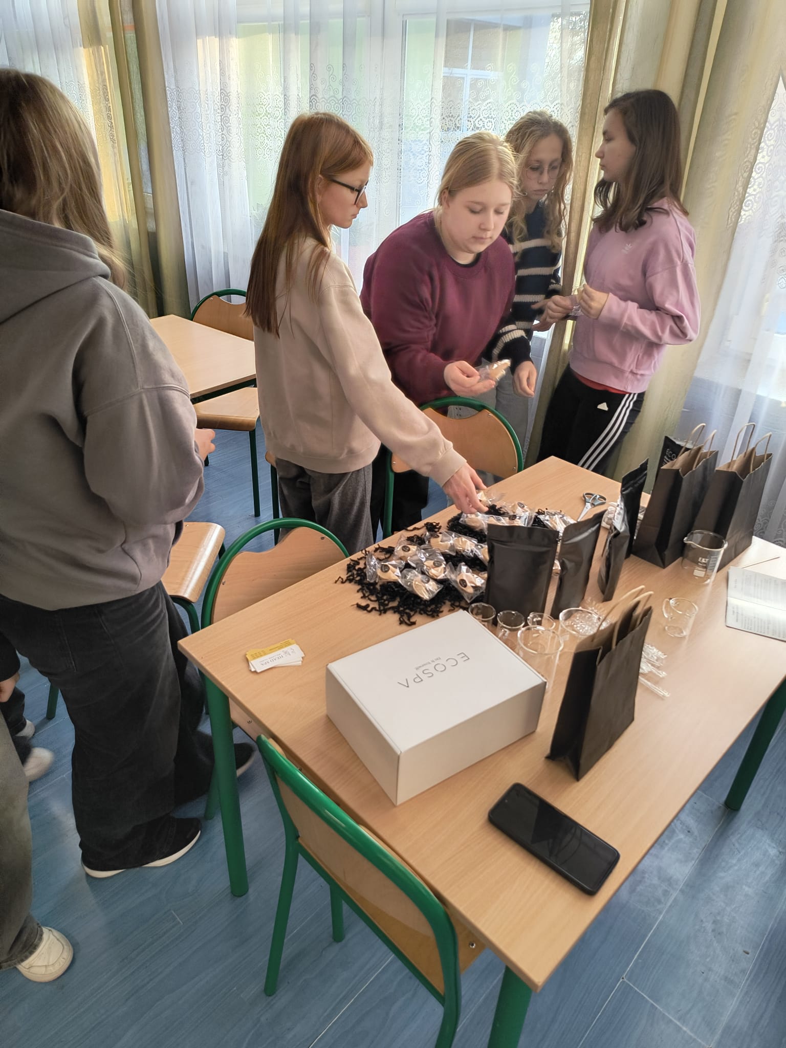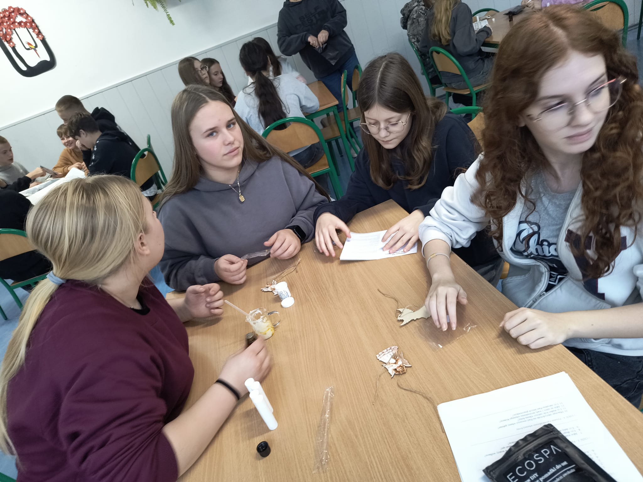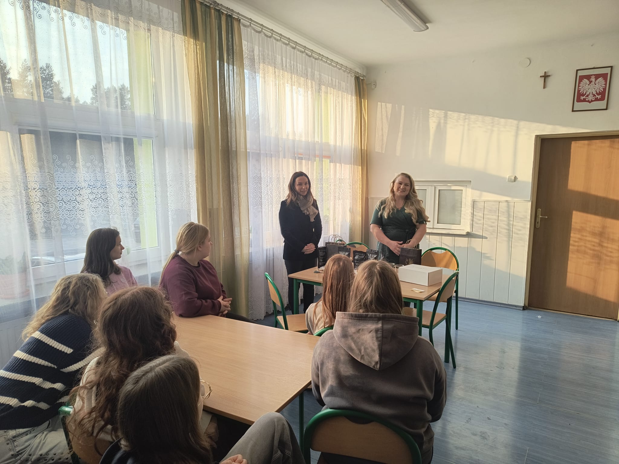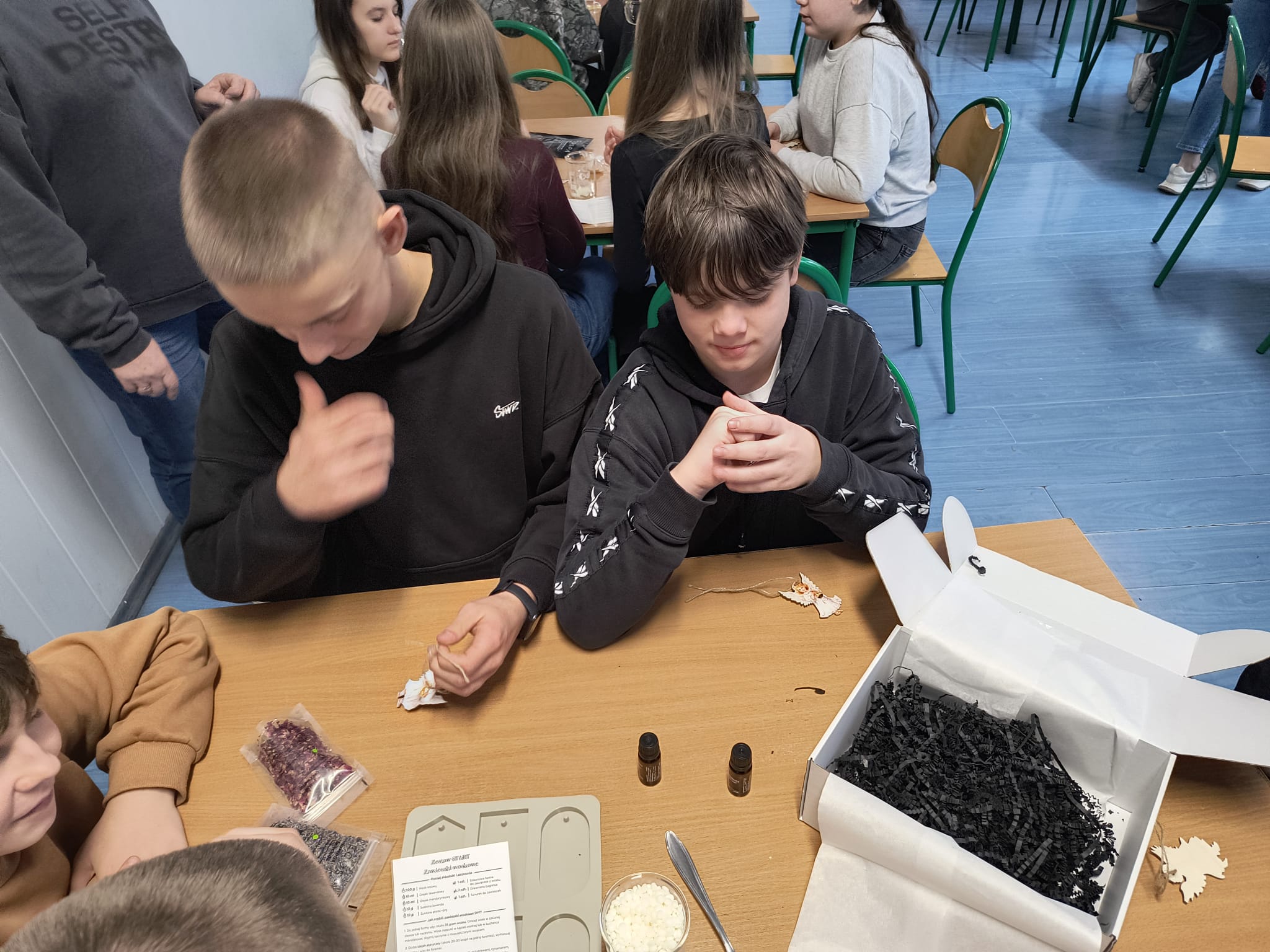 20.11.2025 r. w naszej szkole gościliśmy dwie wspaniałe kobiety z pasją i wrażliwością na drugiego człowieka niosące pomoc i radość. Pani Karolina i Pani Edyta właścicielki Wellnes Clinic, które opowiedziały o swojej pracy oraz poprowadziły warsztaty podczas których uczniowie przygotowywali pomadki ochronne i zawieszki zapachowe.