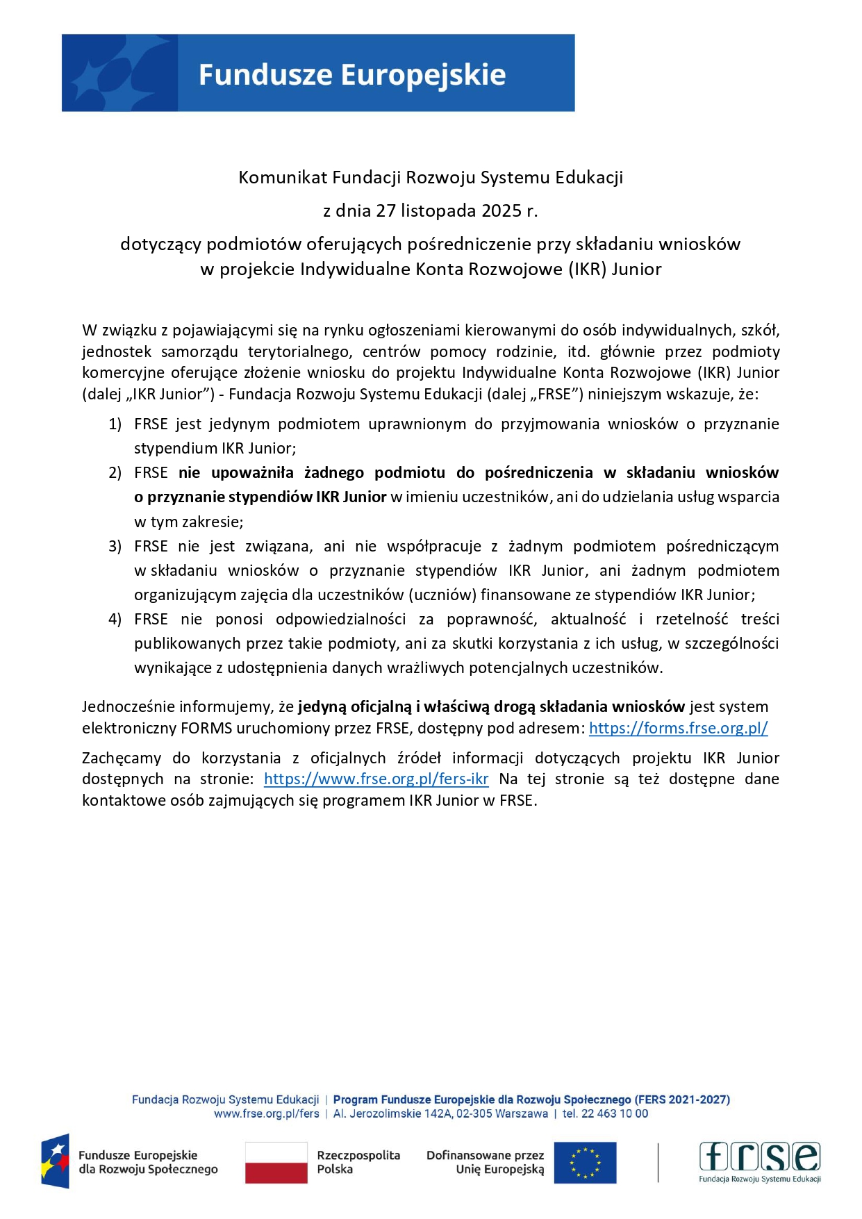 Ministerstwo Edukacji Narodowej informuje, że trwa rekrutacja do projektu Indywidualne Konta Rozwojowe (IKR) Junior. Ta inicjatywa finansowana ze środków europejskich ma na celu wsparcie dzieci i młodzież z rodzin o niskich dochodach oraz tych z pieczy zastępczej. Projekt skierowany jest do uczniów szkół podstawowych (klasy 4-8) oraz szkół ponadpodstawowych.