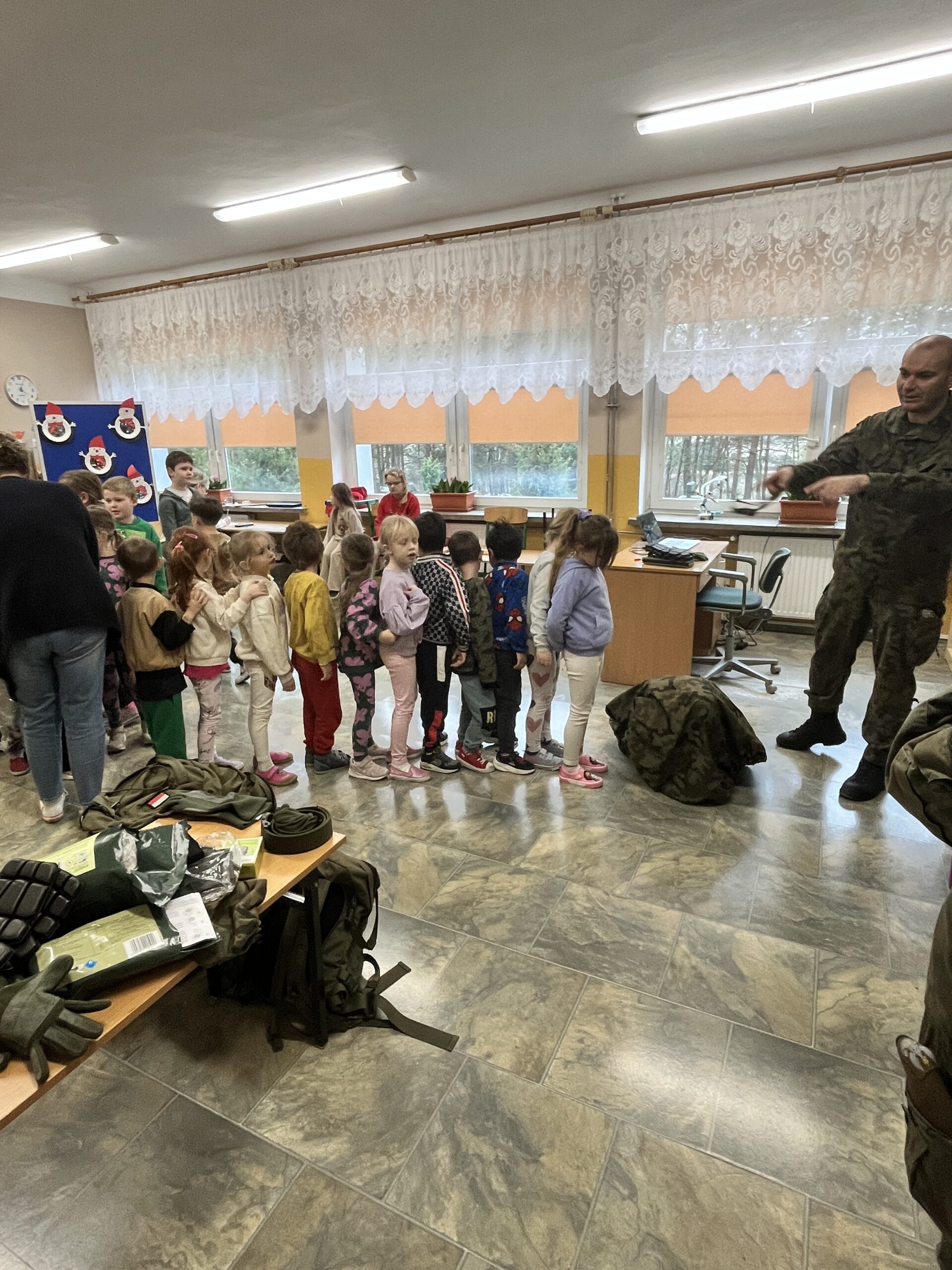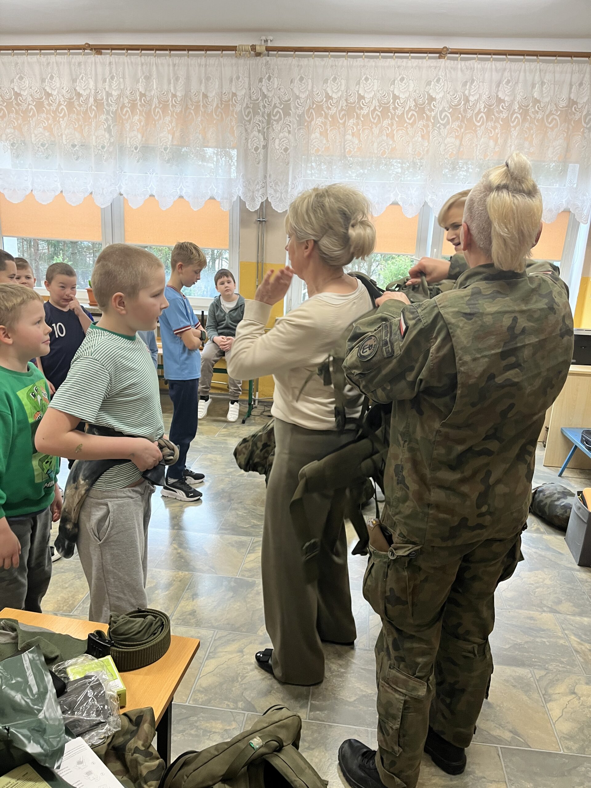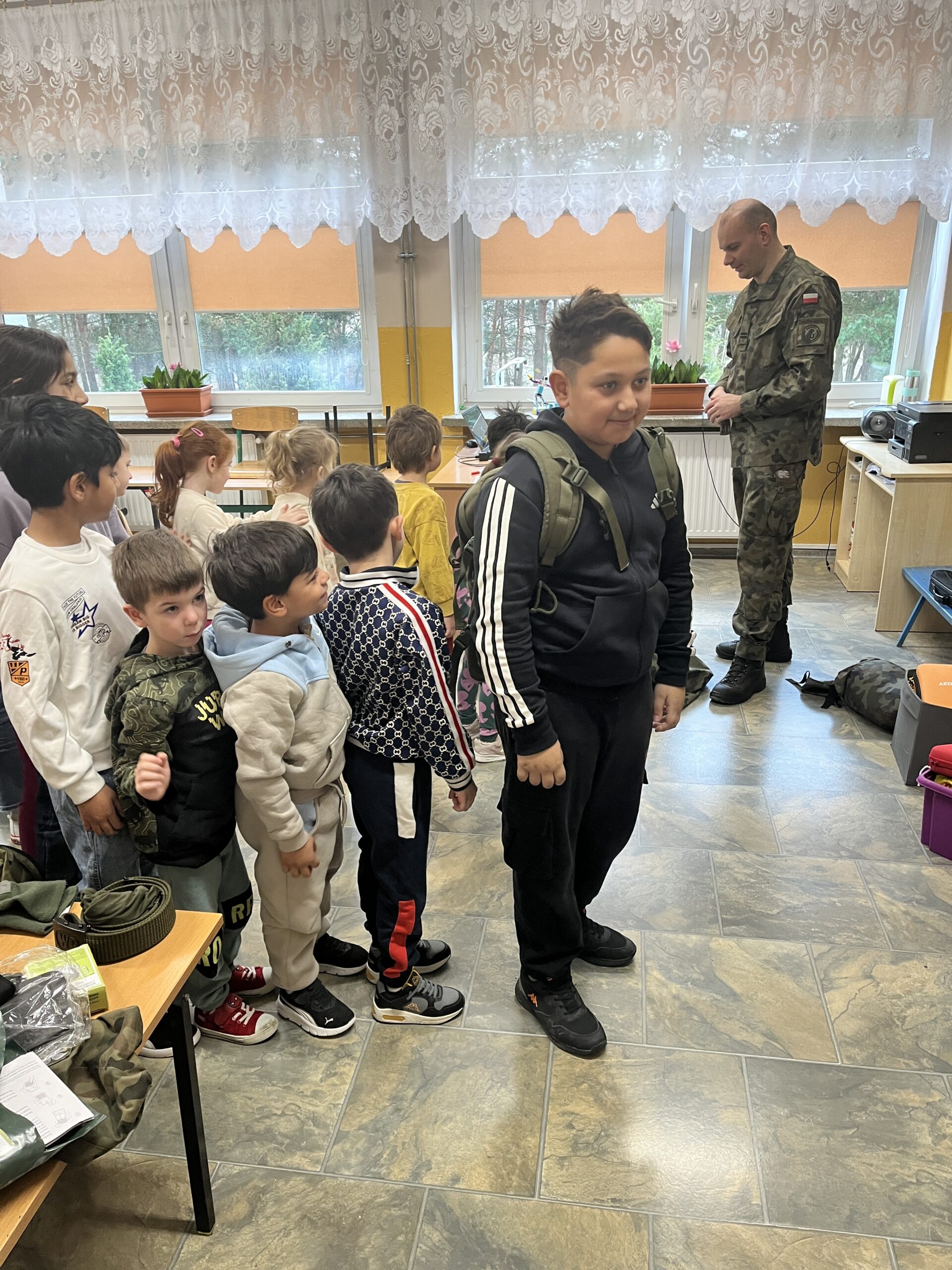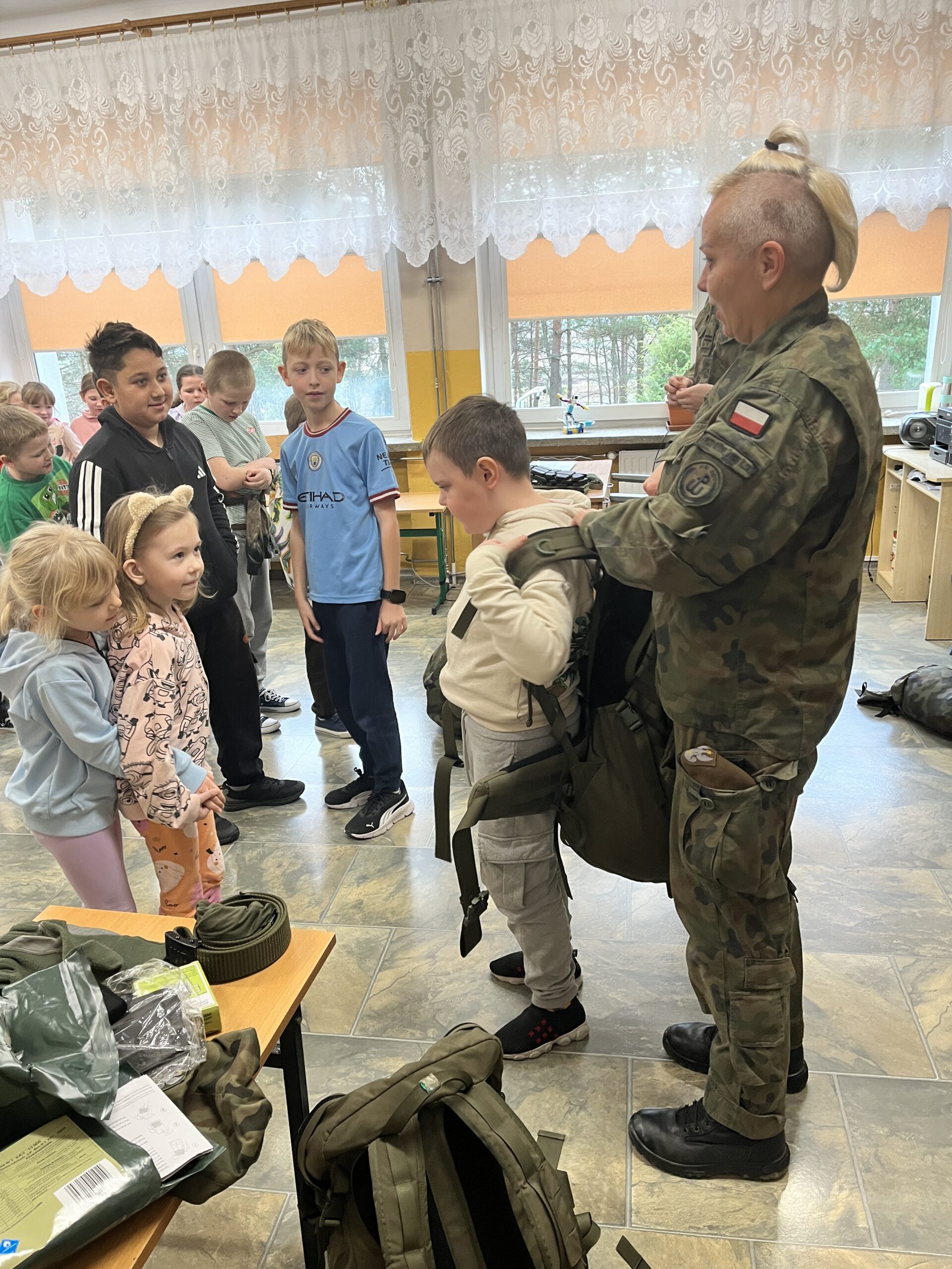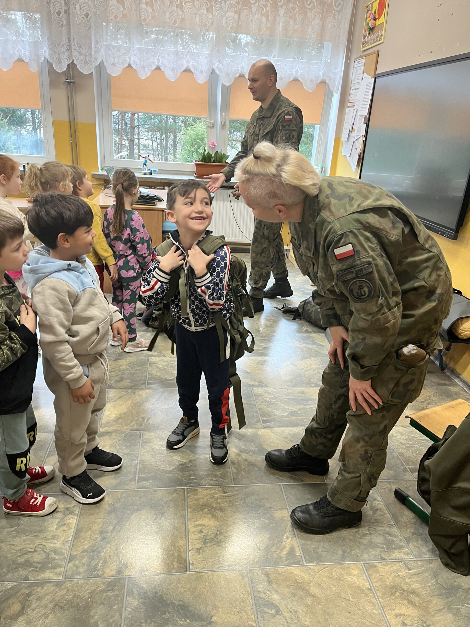 „Edukacja z wojskiem” to ogólnopolski program realizowany przez Ministerstwo Edukacji Narodowej we współpracy z Ministerstwem Obrony Narodowej. W ramach realizacji programu dziś naszą szkołę odwiedzili żołnierze 64 Batalionu Lekkiej Piechoty w Pomiechówku , kpr. Sylwester Pamięta i szer. Jolanta Kęsicka. Żołnierze przeprowadzili z uczniami klas 0-III zajęcia połączone z ćwiczeniami praktycznymi na temat alarmowania służb ratunkowych, bezpiecznego zachowania się w sytuacjach zagrożenia, udzielania pierwszej pomocy. Wszyscy uczniowie brali aktywny udział w zajęciach ucząc się prawidłowych reakcji w sytuacjach zagrożenia życia swojego i innych. Dużą ciekawość wzbudziło wyposażenie plecaka wojskowego, którego waga przekracza niekiedy 40 kg. Dzieci zobaczyły w nim min. tzw. czekoladki czyli ochraniacze na kolana i łokcie, słuchawki chroniące uszy przed hałasem, opaskę z czerwonym światełkiem, pelerynę maskującą, rękawiczki do strzelania . Nie mniejszą ciekawość wzbudziły tzw. eski czyli racje żywnościowe składające się z trzech posiłków, mających zapewnić żołnierzom dobowe wyżywienie. Dzieci podziękowały żołnierzom oklaskami , zrobiliśmy też wspólne zdjęcie. To było dla nas wyjątkowe spotkanie , spotkanie z polskim mundurem !