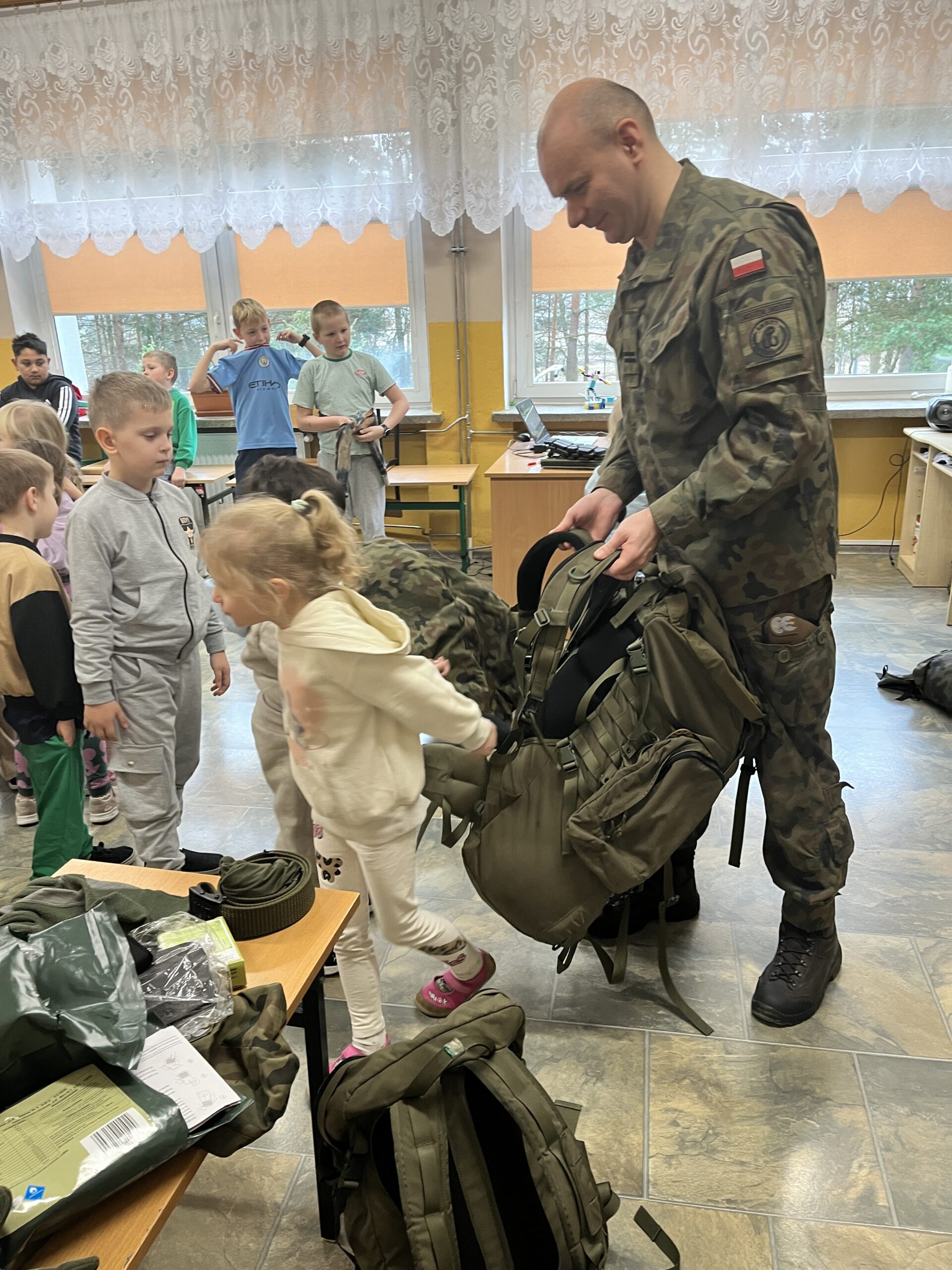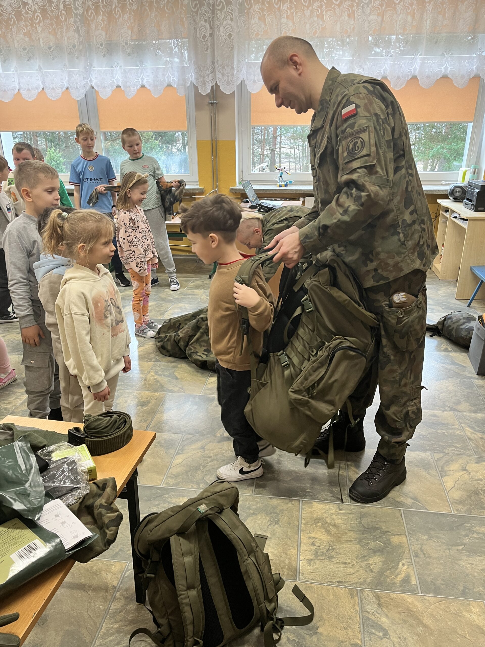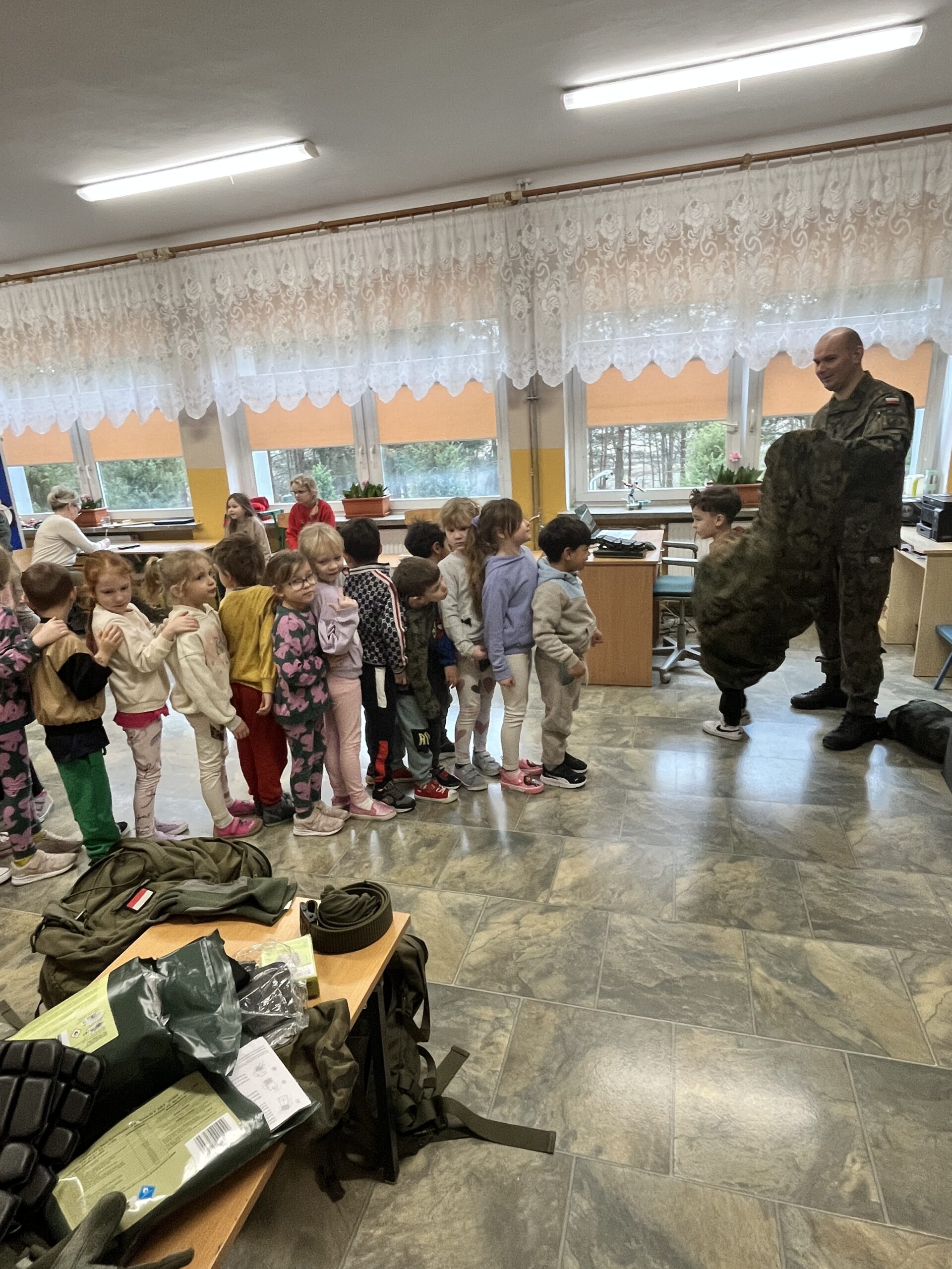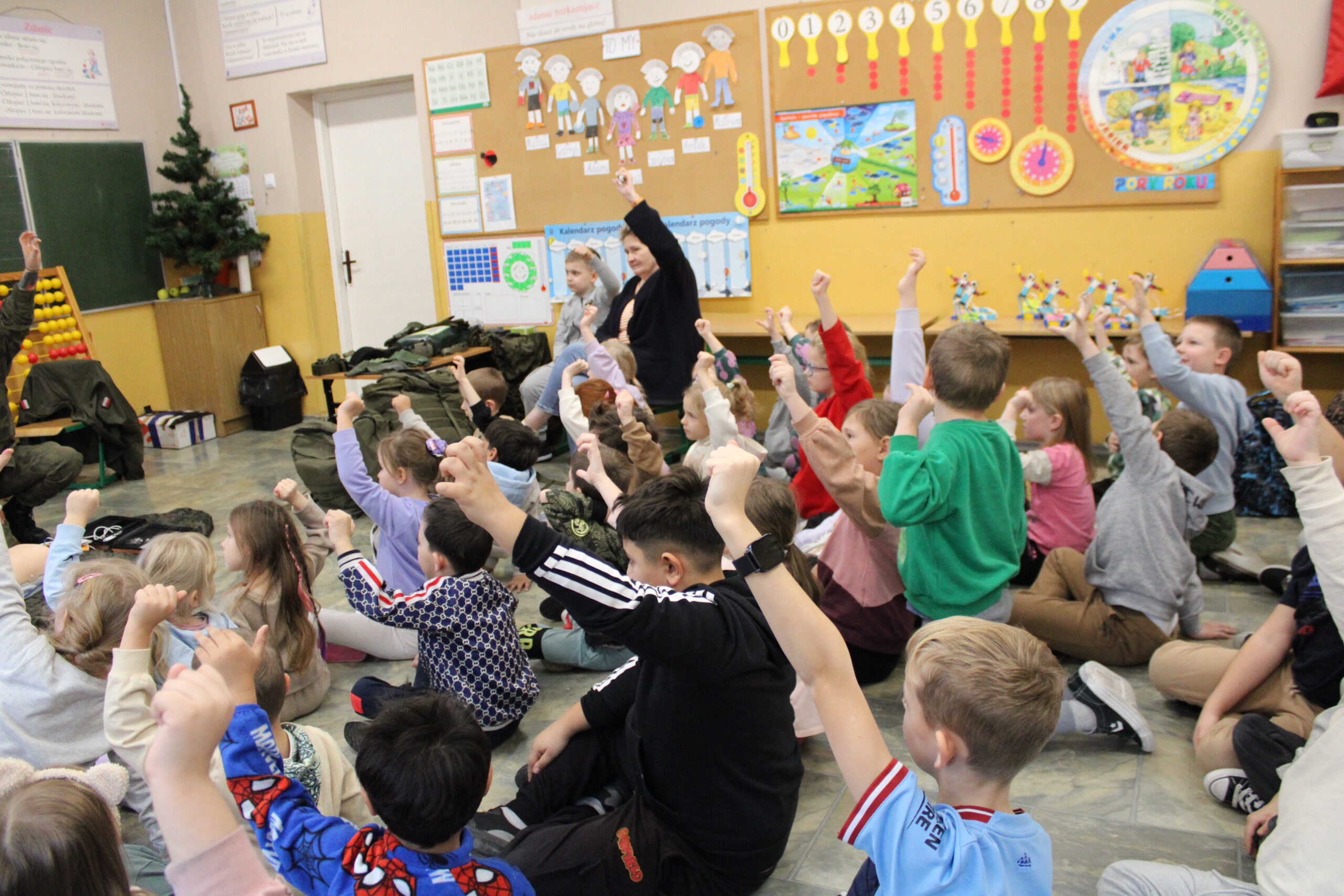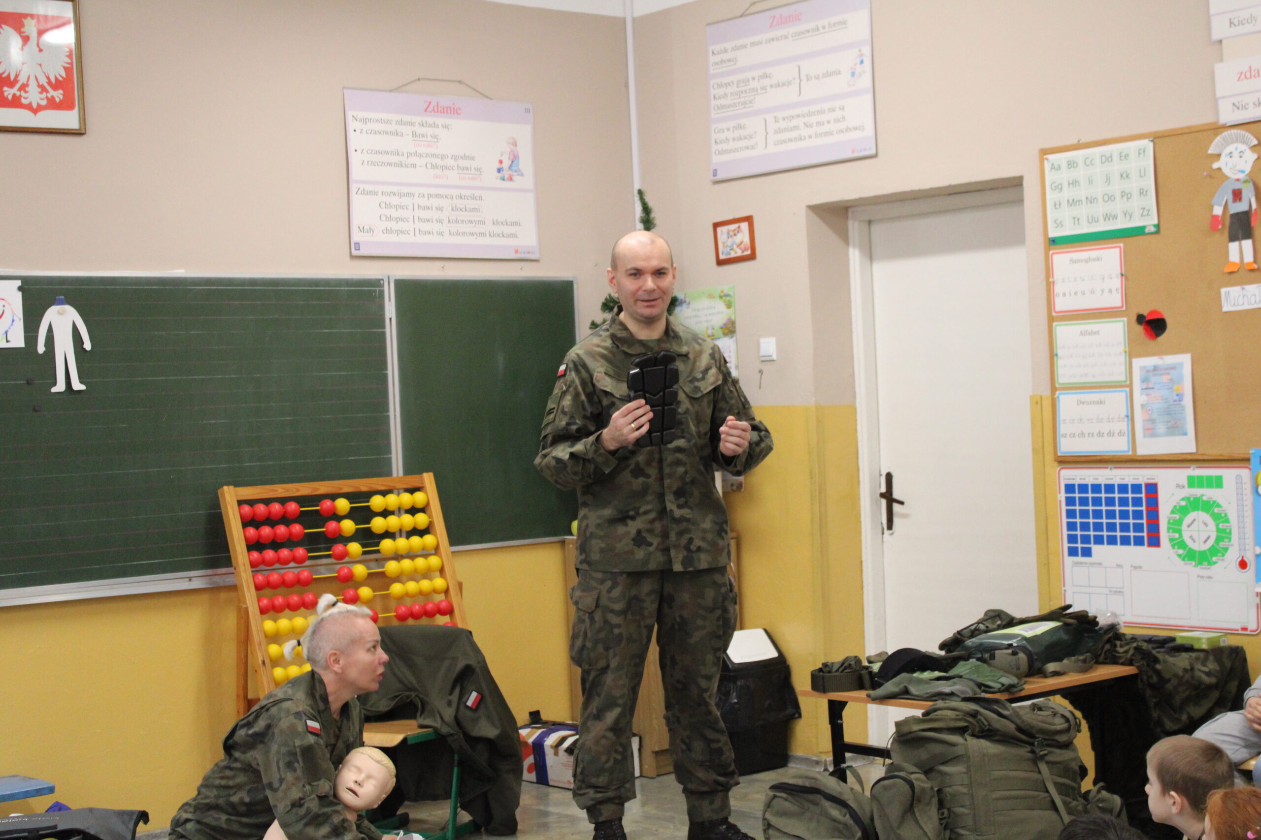 „Edukacja z wojskiem” to ogólnopolski program realizowany przez Ministerstwo Edukacji Narodowej we współpracy z Ministerstwem Obrony Narodowej. W ramach realizacji programu dziś naszą szkołę odwiedzili żołnierze 64 Batalionu Lekkiej Piechoty w Pomiechówku , kpr. Sylwester Pamięta i szer. Jolanta Kęsicka. Żołnierze przeprowadzili z uczniami klas 0-III zajęcia połączone z ćwiczeniami praktycznymi na temat alarmowania służb ratunkowych, bezpiecznego zachowania się w sytuacjach zagrożenia, udzielania pierwszej pomocy. Wszyscy uczniowie brali aktywny udział w zajęciach ucząc się prawidłowych reakcji w sytuacjach zagrożenia życia swojego i innych. Dużą ciekawość wzbudziło wyposażenie plecaka wojskowego, którego waga przekracza niekiedy 40 kg. Dzieci zobaczyły w nim min. tzw. czekoladki czyli ochraniacze na kolana i łokcie, słuchawki chroniące uszy przed hałasem, opaskę z czerwonym światełkiem, pelerynę maskującą, rękawiczki do strzelania . Nie mniejszą ciekawość wzbudziły tzw. eski czyli racje żywnościowe składające się z trzech posiłków, mających zapewnić żołnierzom dobowe wyżywienie. Dzieci podziękowały żołnierzom oklaskami , zrobiliśmy też wspólne zdjęcie. To było dla nas wyjątkowe spotkanie , spotkanie z polskim mundurem !