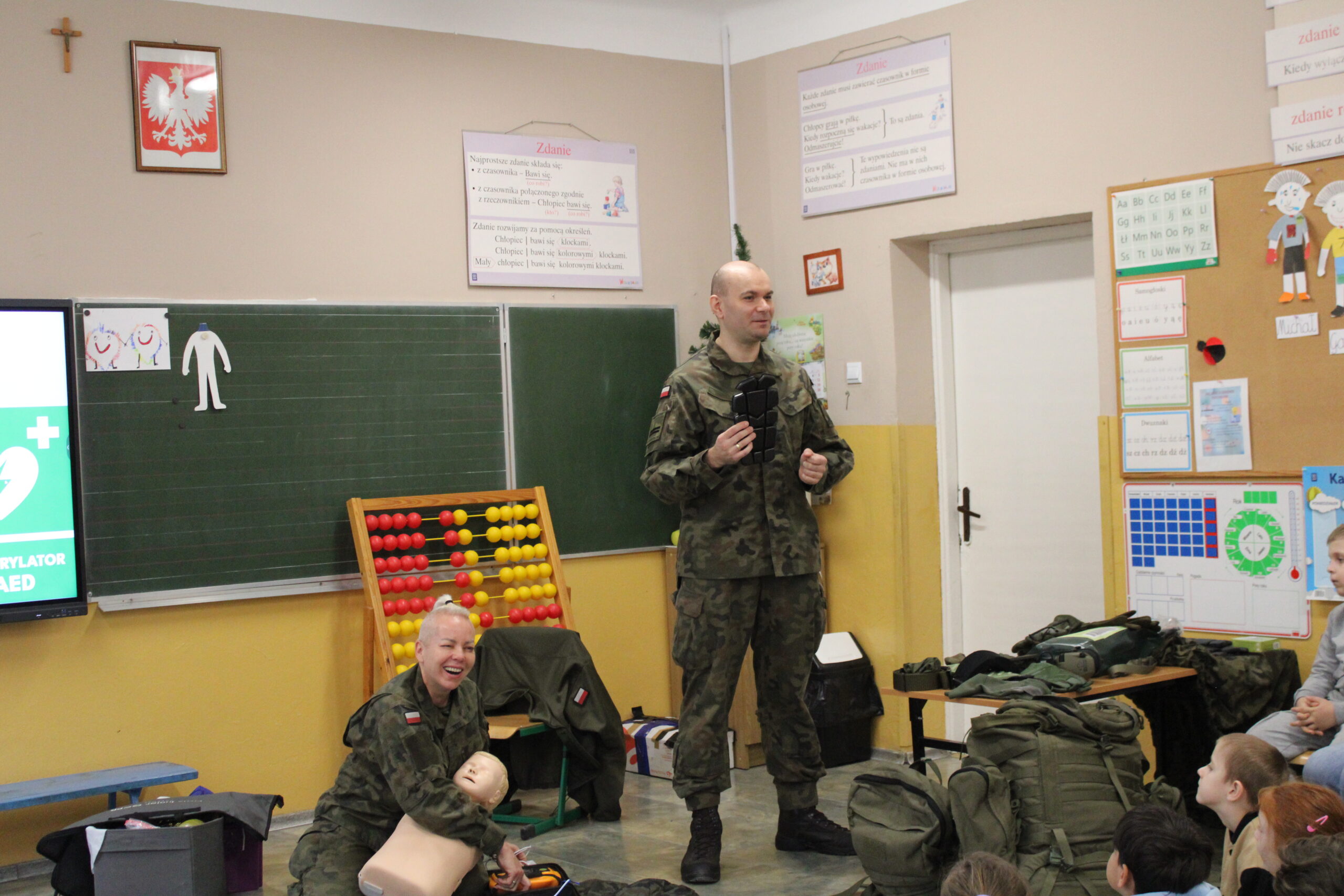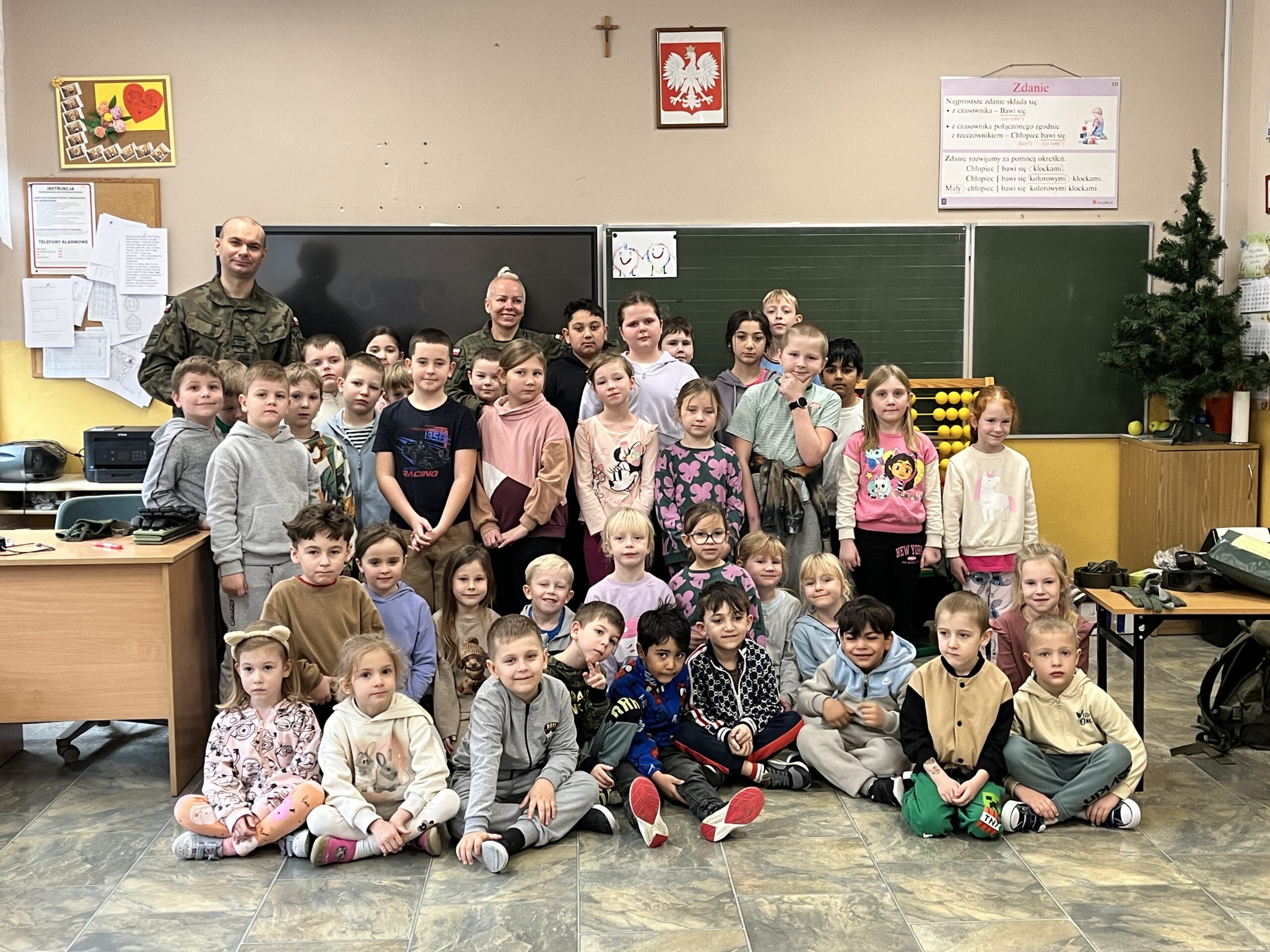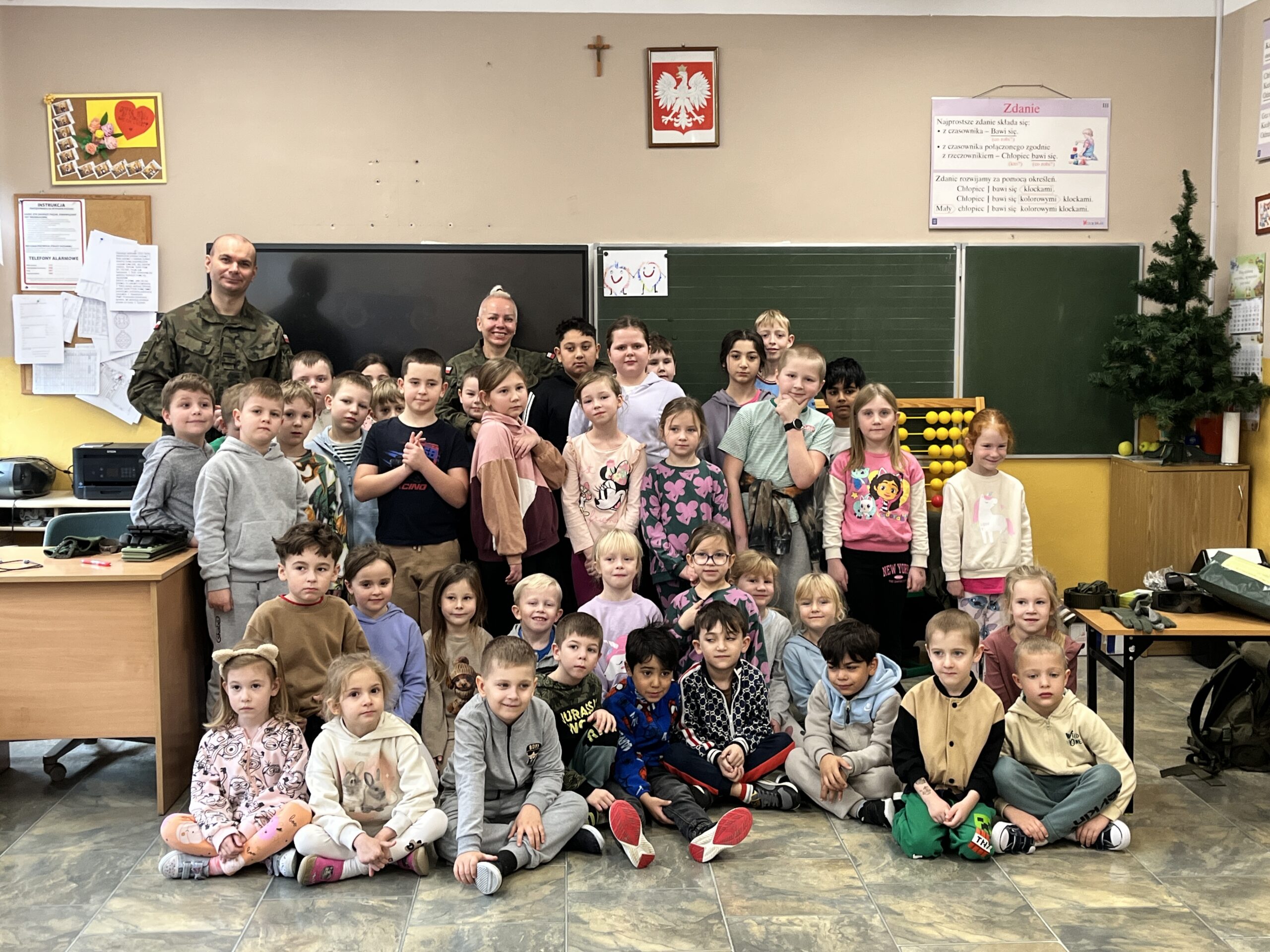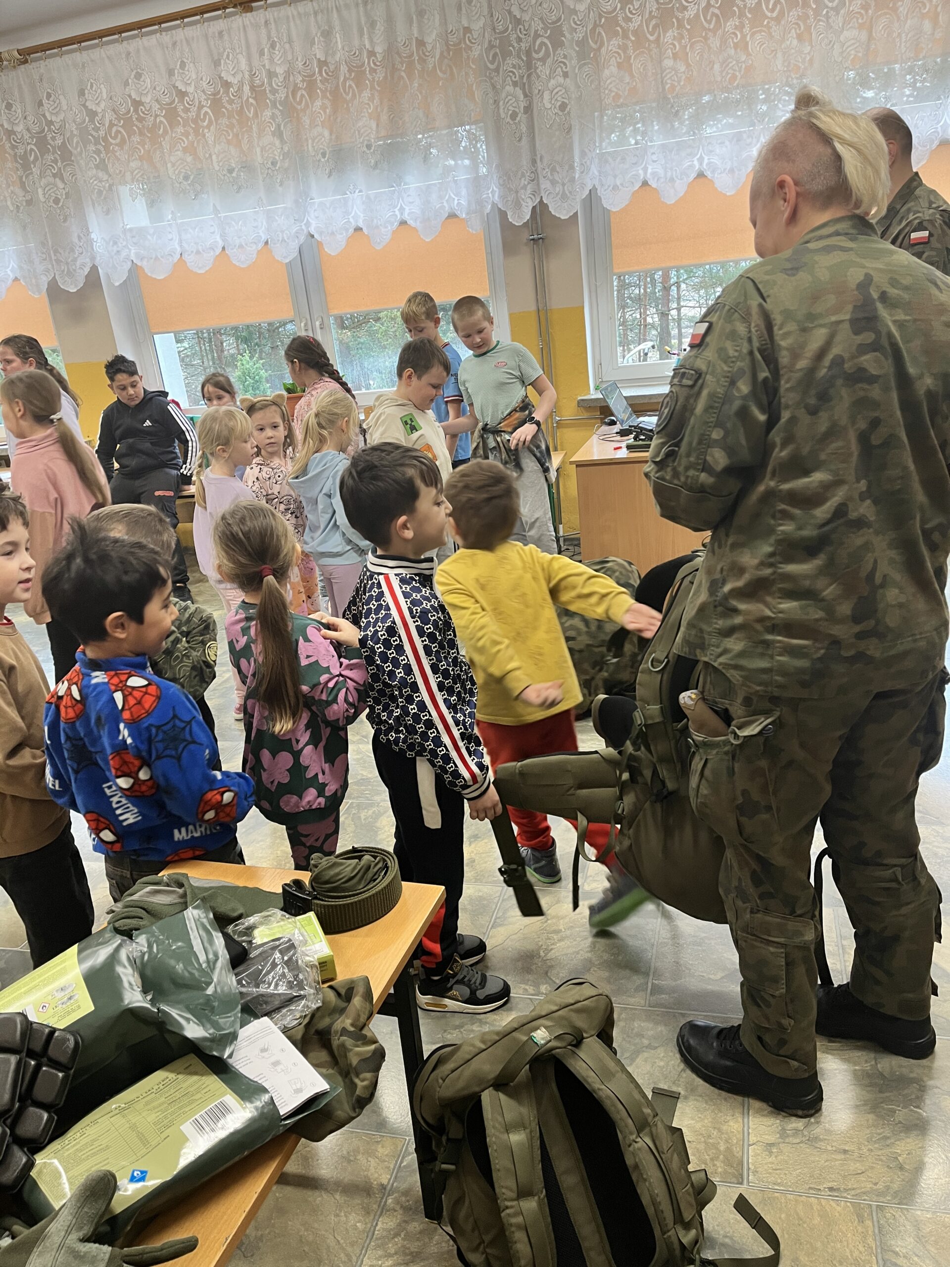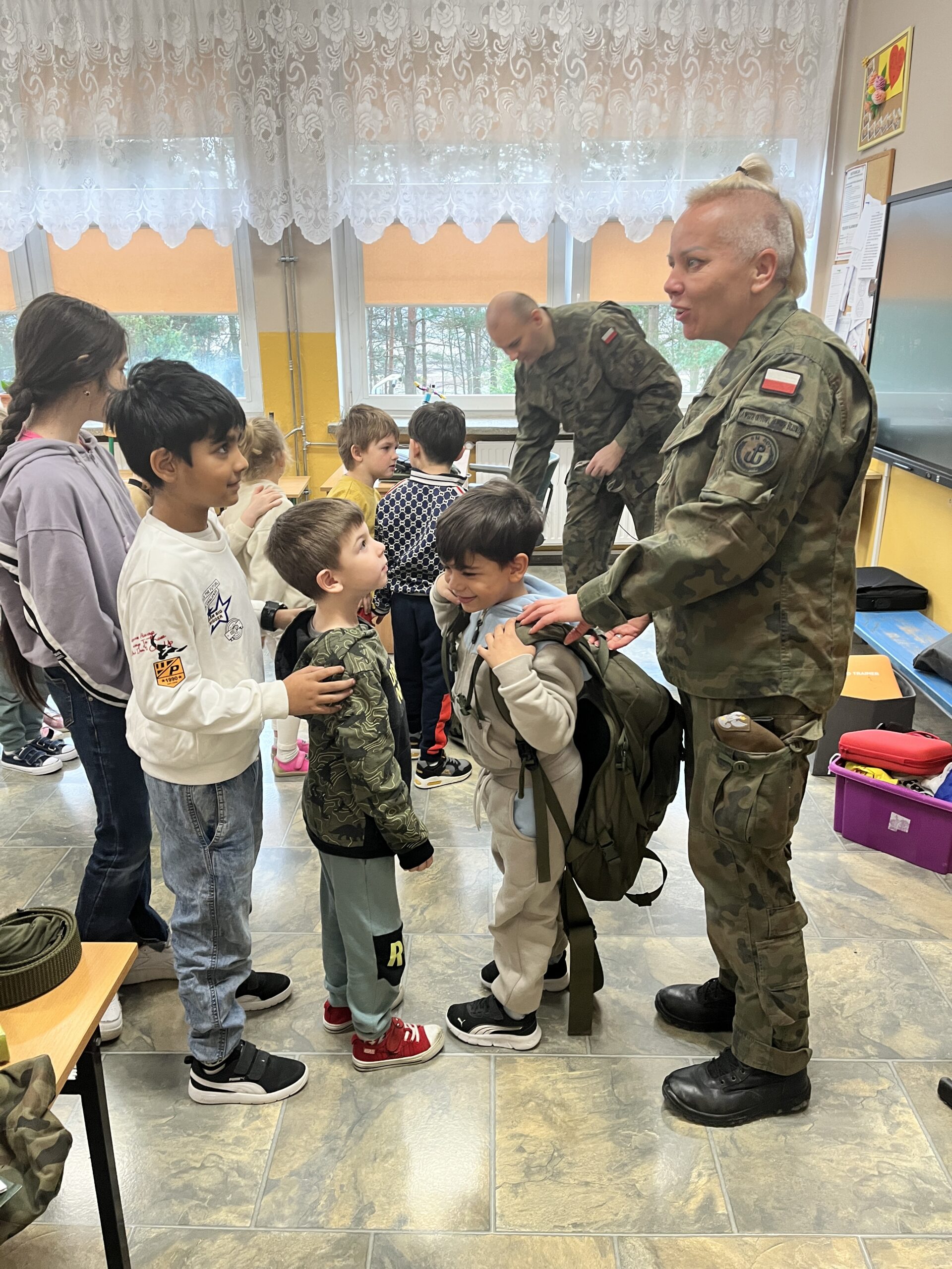 „Edukacja z wojskiem” to ogólnopolski program realizowany przez Ministerstwo Edukacji Narodowej we współpracy z Ministerstwem Obrony Narodowej. W ramach realizacji programu dziś naszą szkołę odwiedzili żołnierze 64 Batalionu Lekkiej Piechoty w Pomiechówku , kpr. Sylwester Pamięta i szer. Jolanta Kęsicka. Żołnierze przeprowadzili z uczniami klas 0-III zajęcia połączone z ćwiczeniami praktycznymi na temat alarmowania służb ratunkowych, bezpiecznego zachowania się w sytuacjach zagrożenia, udzielania pierwszej pomocy. Wszyscy uczniowie brali aktywny udział w zajęciach ucząc się prawidłowych reakcji w sytuacjach zagrożenia życia swojego i innych. Dużą ciekawość wzbudziło wyposażenie plecaka wojskowego, którego waga przekracza niekiedy 40 kg. Dzieci zobaczyły w nim min. tzw. czekoladki czyli ochraniacze na kolana i łokcie, słuchawki chroniące uszy przed hałasem, opaskę z czerwonym światełkiem, pelerynę maskującą, rękawiczki do strzelania . Nie mniejszą ciekawość wzbudziły tzw. eski czyli racje żywnościowe składające się z trzech posiłków, mających zapewnić żołnierzom dobowe wyżywienie. Dzieci podziękowały żołnierzom oklaskami , zrobiliśmy też wspólne zdjęcie. To było dla nas wyjątkowe spotkanie , spotkanie z polskim mundurem !