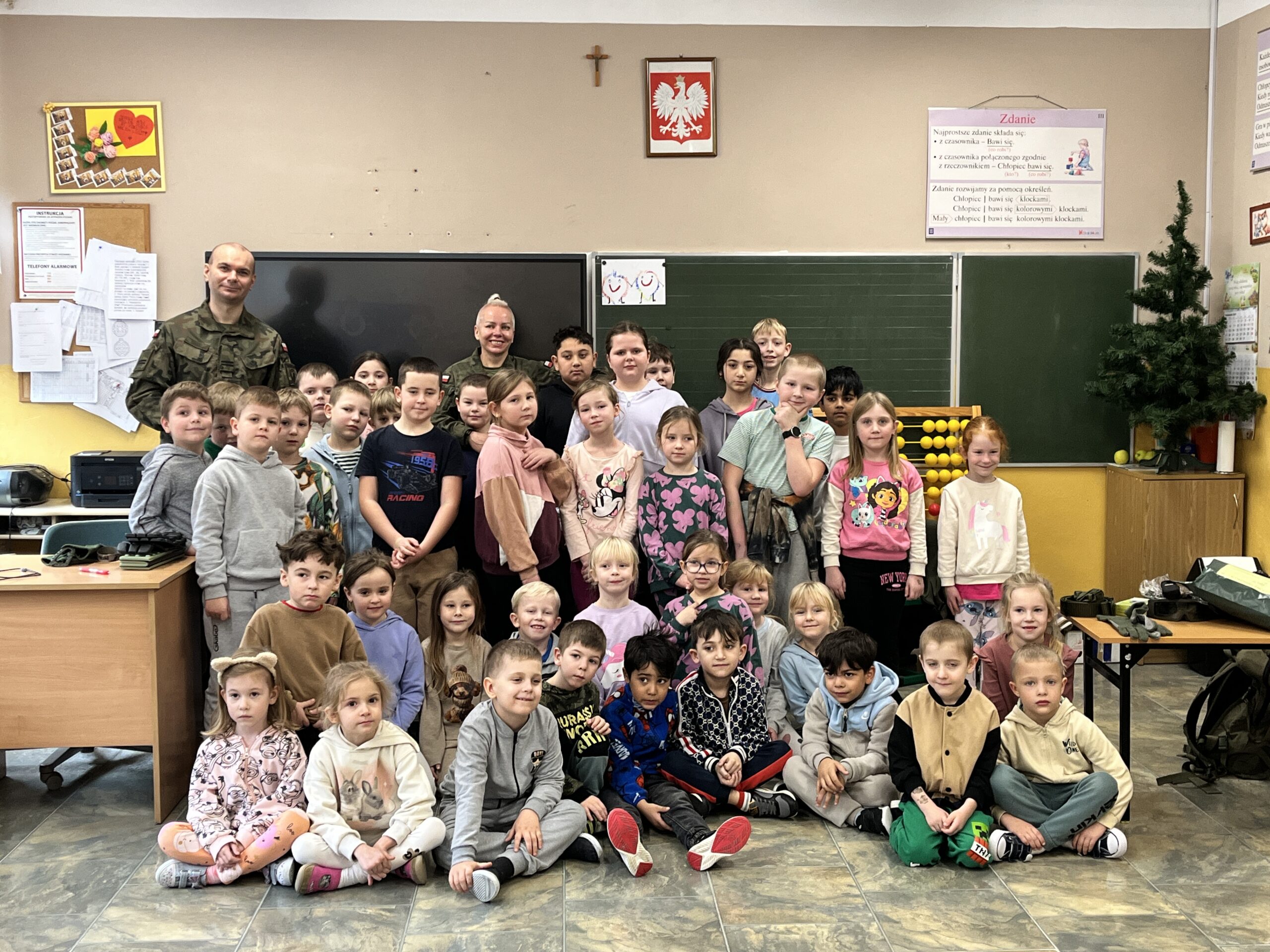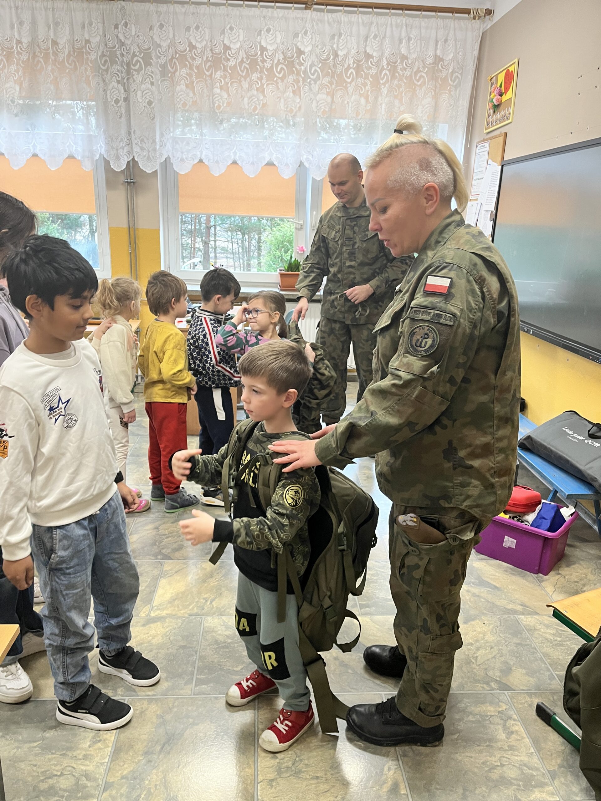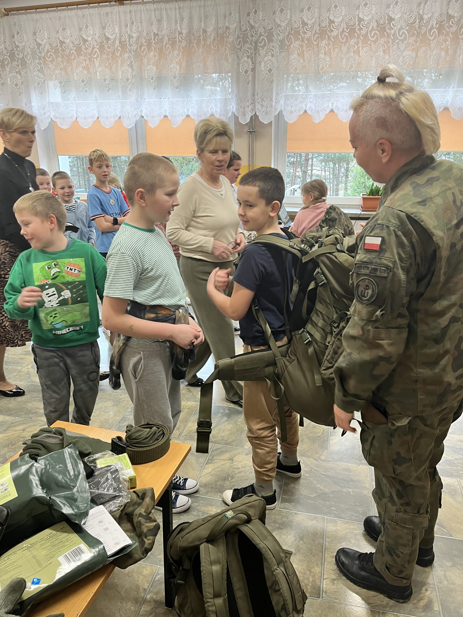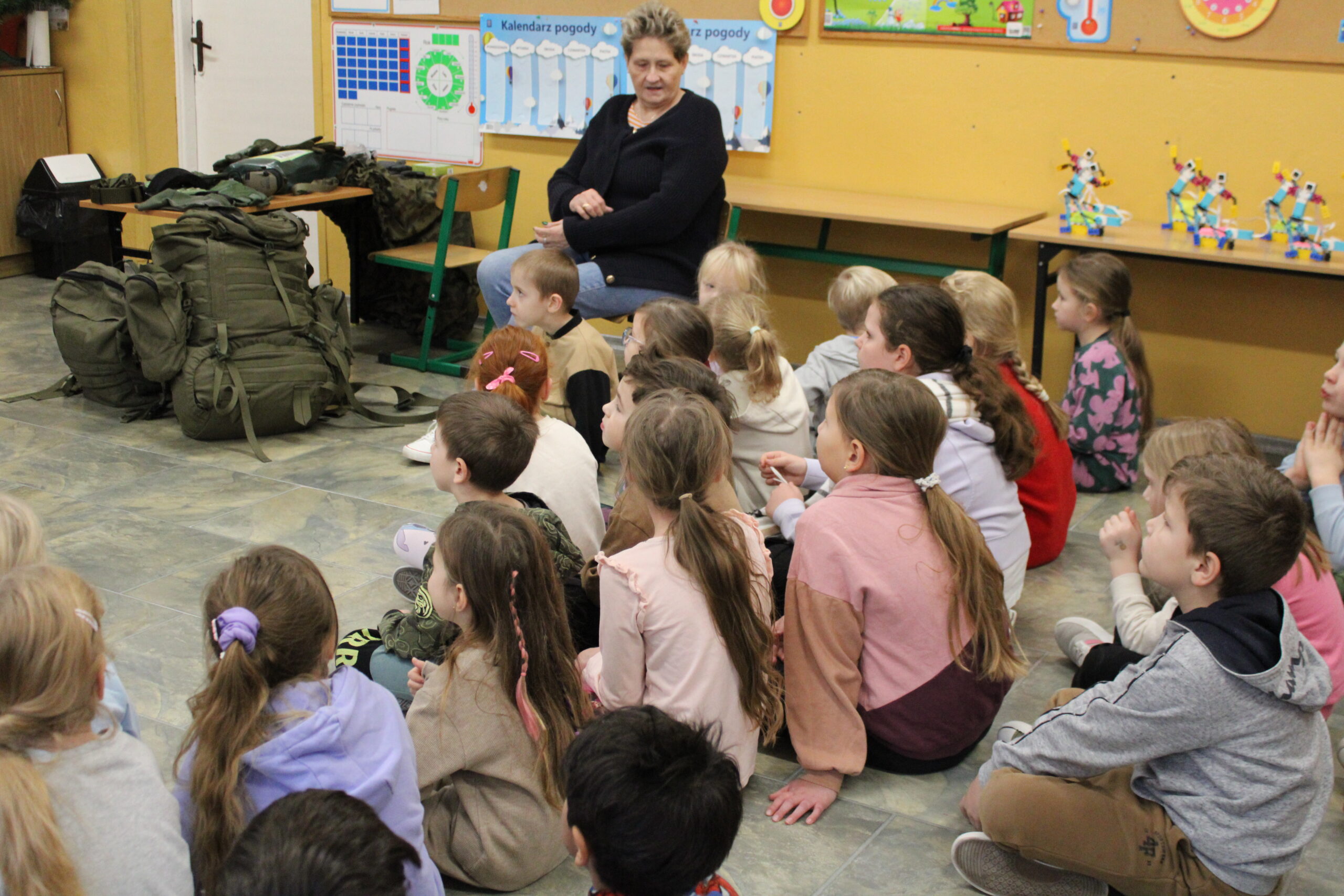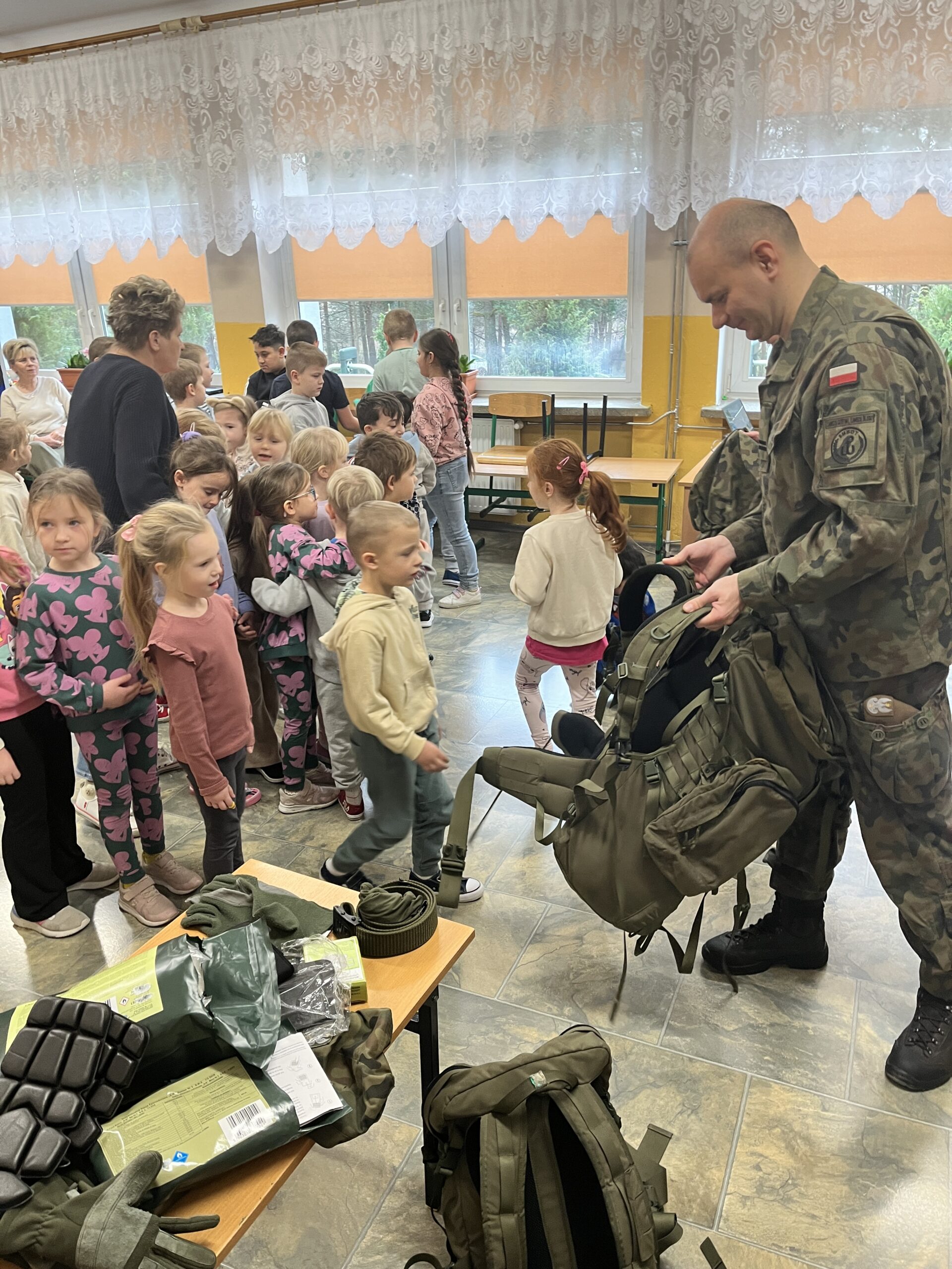 „Edukacja z wojskiem” to ogólnopolski program realizowany przez Ministerstwo Edukacji Narodowej we współpracy z Ministerstwem Obrony Narodowej. W ramach realizacji programu dziś naszą szkołę odwiedzili żołnierze 64 Batalionu Lekkiej Piechoty w Pomiechówku , kpr. Sylwester Pamięta i szer. Jolanta Kęsicka. Żołnierze przeprowadzili z uczniami klas 0-III zajęcia połączone z ćwiczeniami praktycznymi na temat alarmowania służb ratunkowych, bezpiecznego zachowania się w sytuacjach zagrożenia, udzielania pierwszej pomocy. Wszyscy uczniowie brali aktywny udział w zajęciach ucząc się prawidłowych reakcji w sytuacjach zagrożenia życia swojego i innych. Dużą ciekawość wzbudziło wyposażenie plecaka wojskowego, którego waga przekracza niekiedy 40 kg. Dzieci zobaczyły w nim min. tzw. czekoladki czyli ochraniacze na kolana i łokcie, słuchawki chroniące uszy przed hałasem, opaskę z czerwonym światełkiem, pelerynę maskującą, rękawiczki do strzelania . Nie mniejszą ciekawość wzbudziły tzw. eski czyli racje żywnościowe składające się z trzech posiłków, mających zapewnić żołnierzom dobowe wyżywienie. Dzieci podziękowały żołnierzom oklaskami , zrobiliśmy też wspólne zdjęcie. To było dla nas wyjątkowe spotkanie , spotkanie z polskim mundurem !