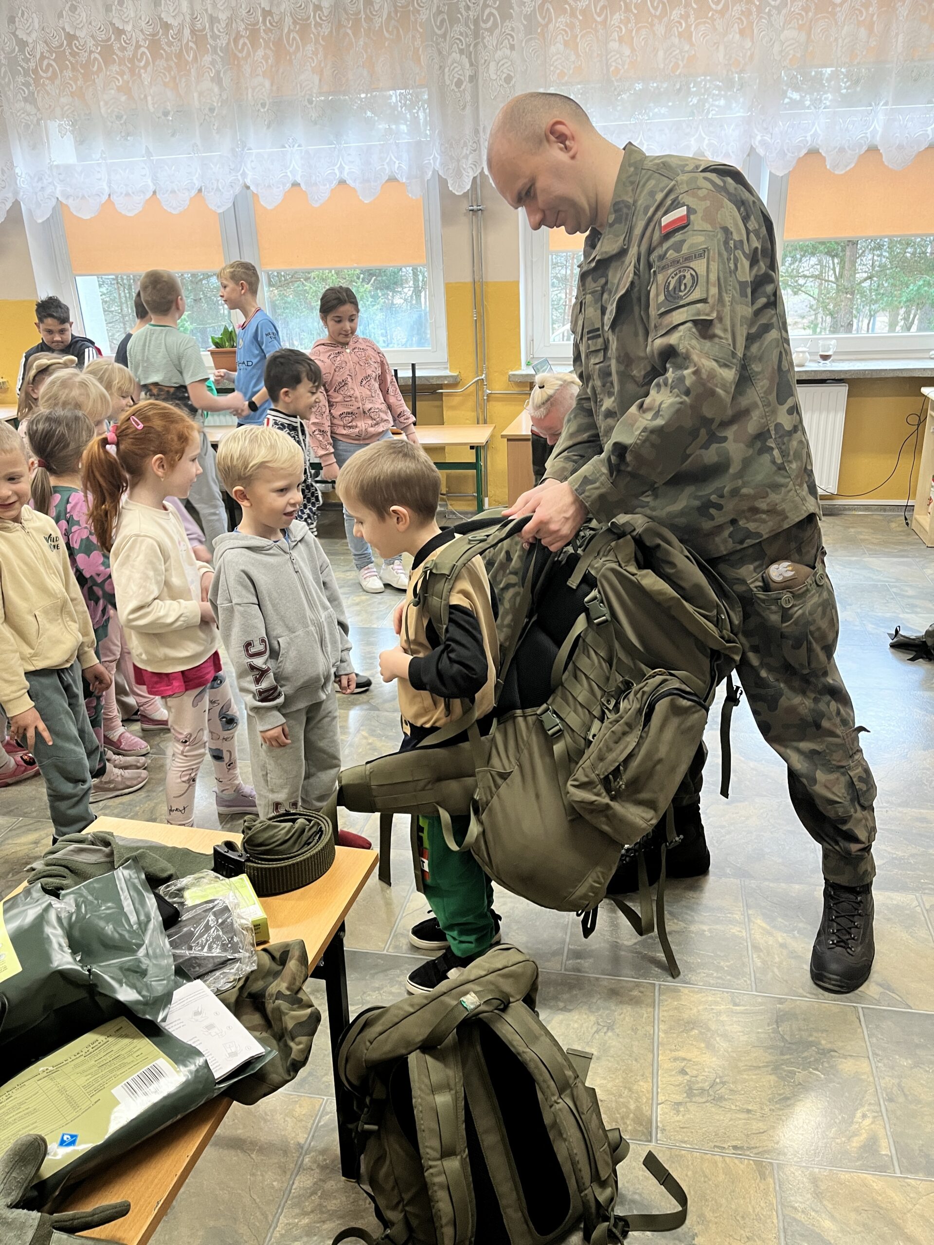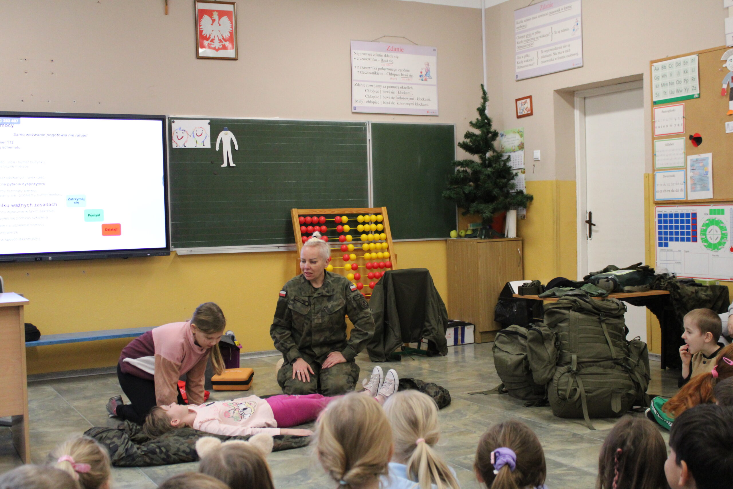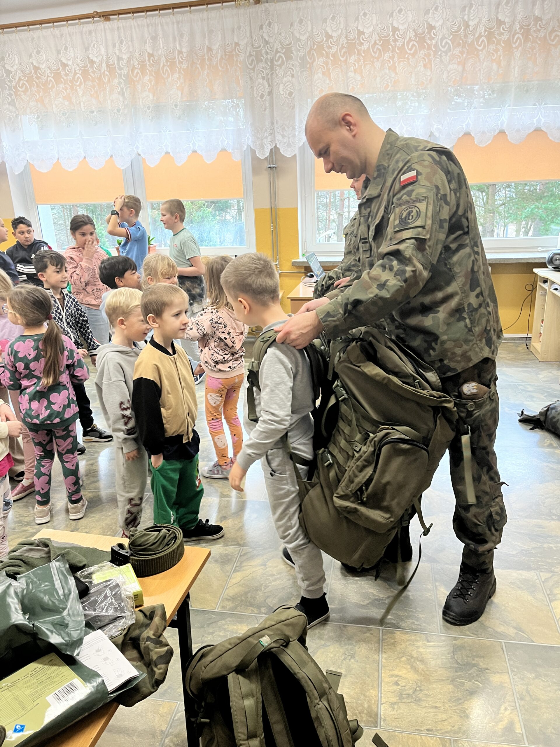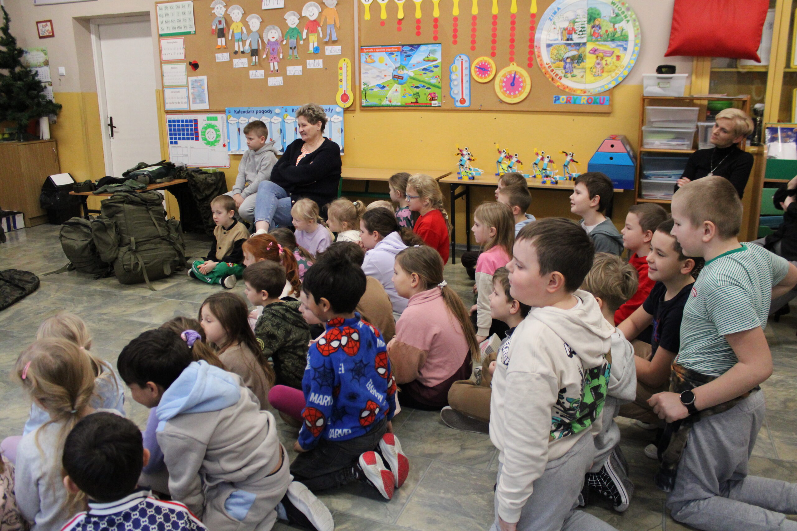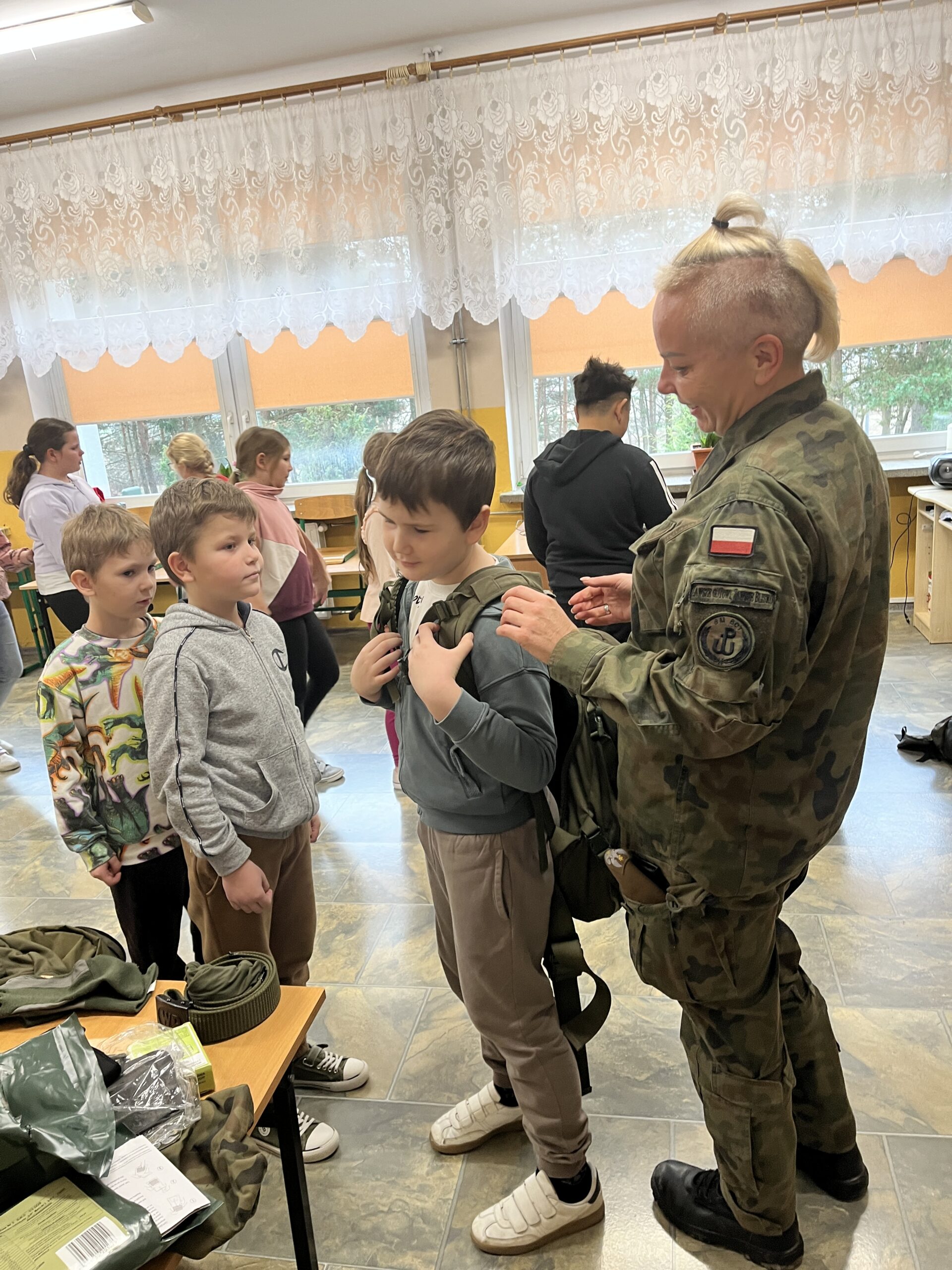 „Edukacja z wojskiem” to ogólnopolski program realizowany przez Ministerstwo Edukacji Narodowej we współpracy z Ministerstwem Obrony Narodowej. W ramach realizacji programu dziś naszą szkołę odwiedzili żołnierze 64 Batalionu Lekkiej Piechoty w Pomiechówku , kpr. Sylwester Pamięta i szer. Jolanta Kęsicka. Żołnierze przeprowadzili z uczniami klas 0-III zajęcia połączone z ćwiczeniami praktycznymi na temat alarmowania służb ratunkowych, bezpiecznego zachowania się w sytuacjach zagrożenia, udzielania pierwszej pomocy. Wszyscy uczniowie brali aktywny udział w zajęciach ucząc się prawidłowych reakcji w sytuacjach zagrożenia życia swojego i innych. Dużą ciekawość wzbudziło wyposażenie plecaka wojskowego, którego waga przekracza niekiedy 40 kg. Dzieci zobaczyły w nim min. tzw. czekoladki czyli ochraniacze na kolana i łokcie, słuchawki chroniące uszy przed hałasem, opaskę z czerwonym światełkiem, pelerynę maskującą, rękawiczki do strzelania . Nie mniejszą ciekawość wzbudziły tzw. eski czyli racje żywnościowe składające się z trzech posiłków, mających zapewnić żołnierzom dobowe wyżywienie. Dzieci podziękowały żołnierzom oklaskami , zrobiliśmy też wspólne zdjęcie. To było dla nas wyjątkowe spotkanie , spotkanie z polskim mundurem !