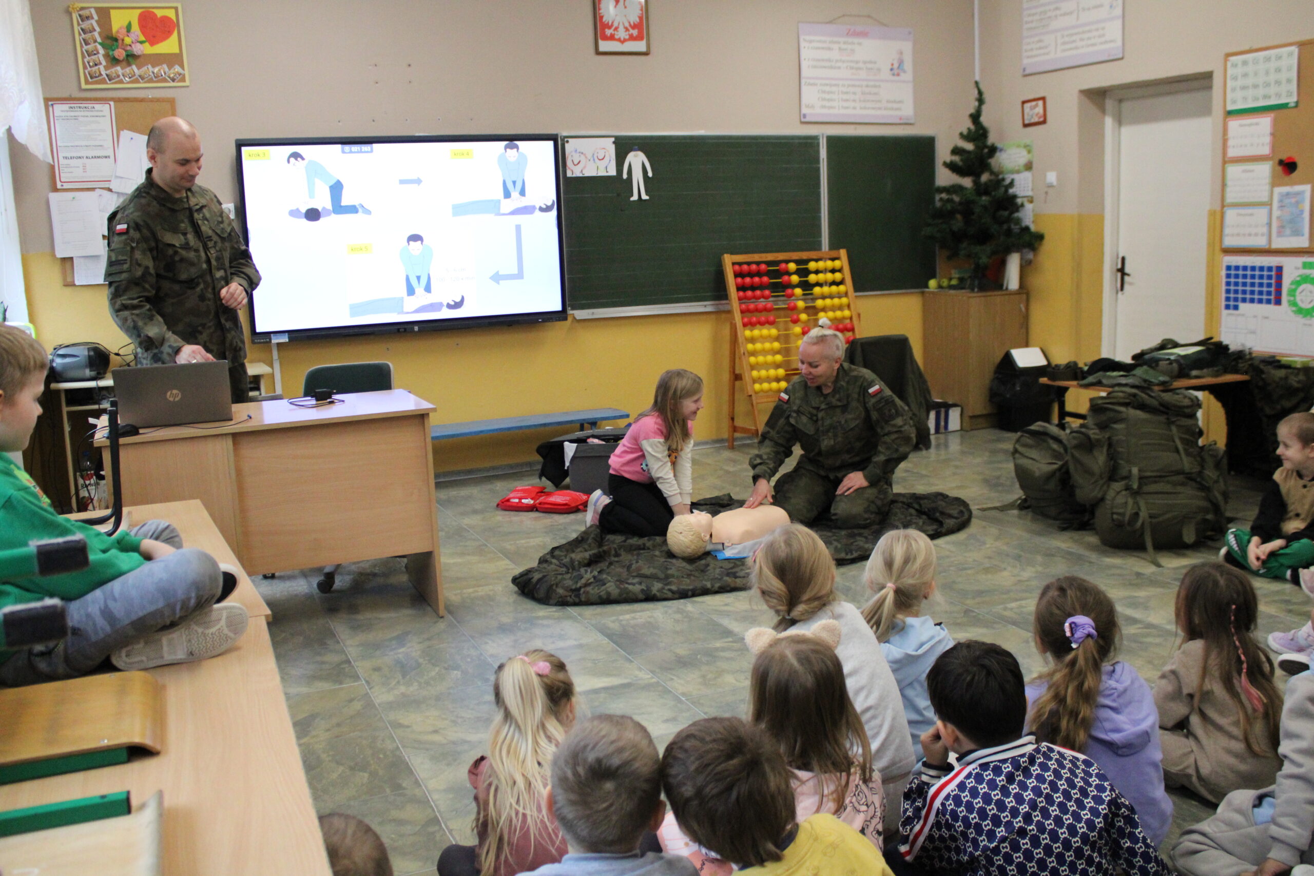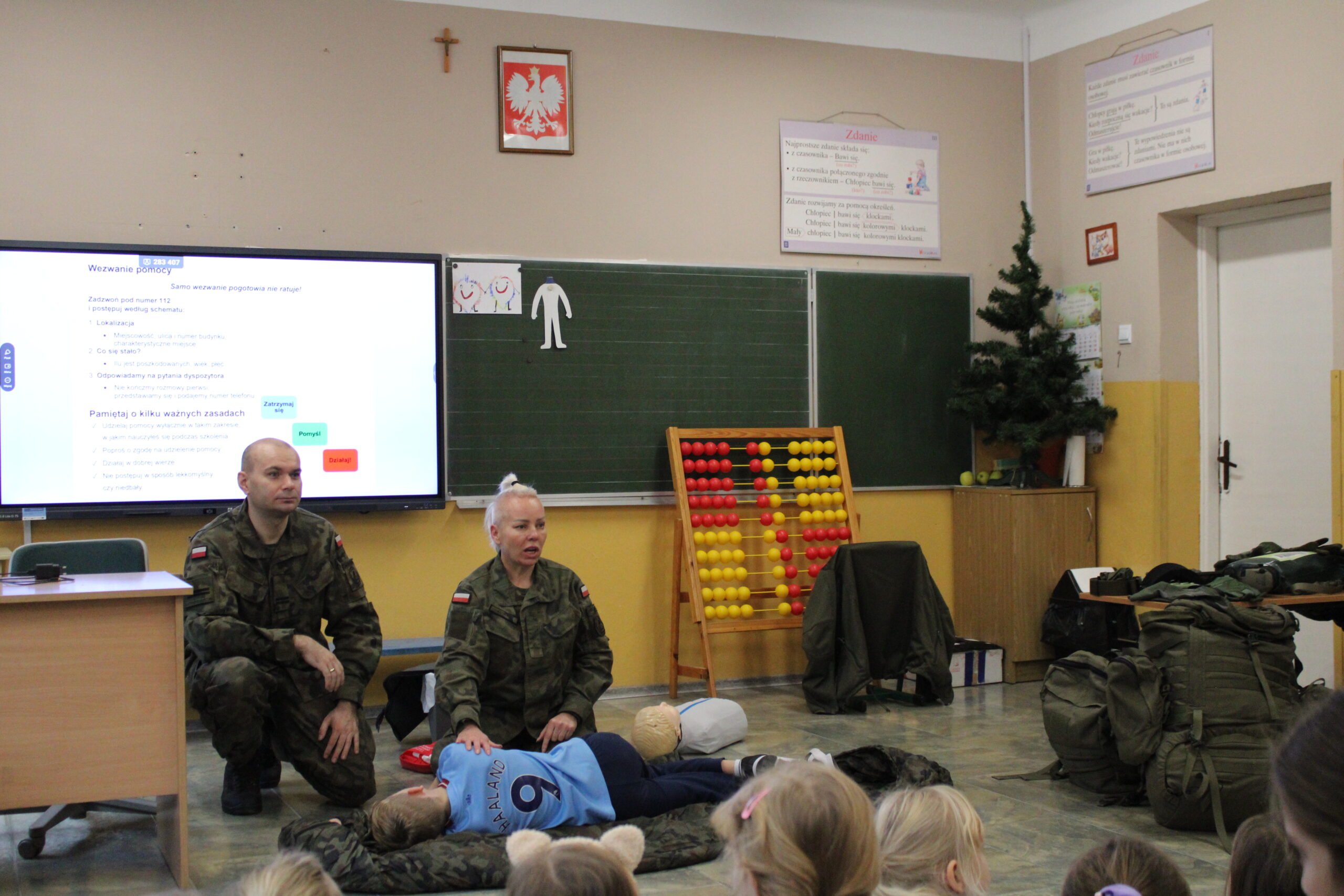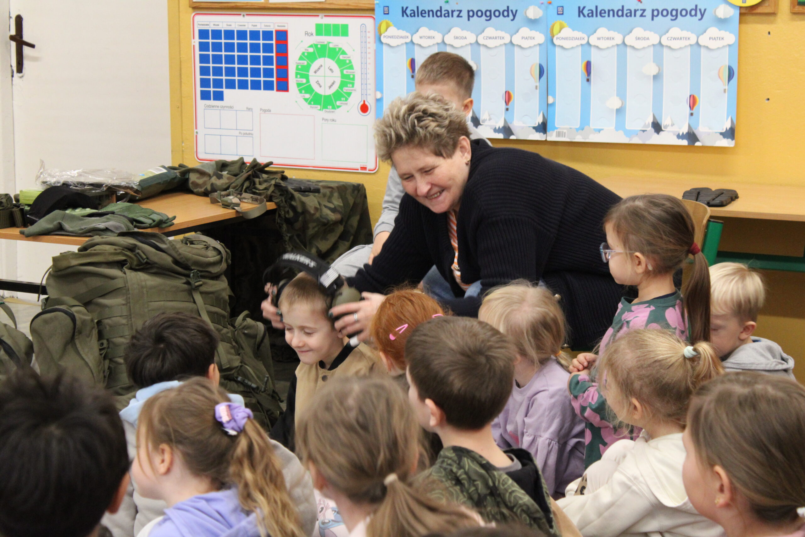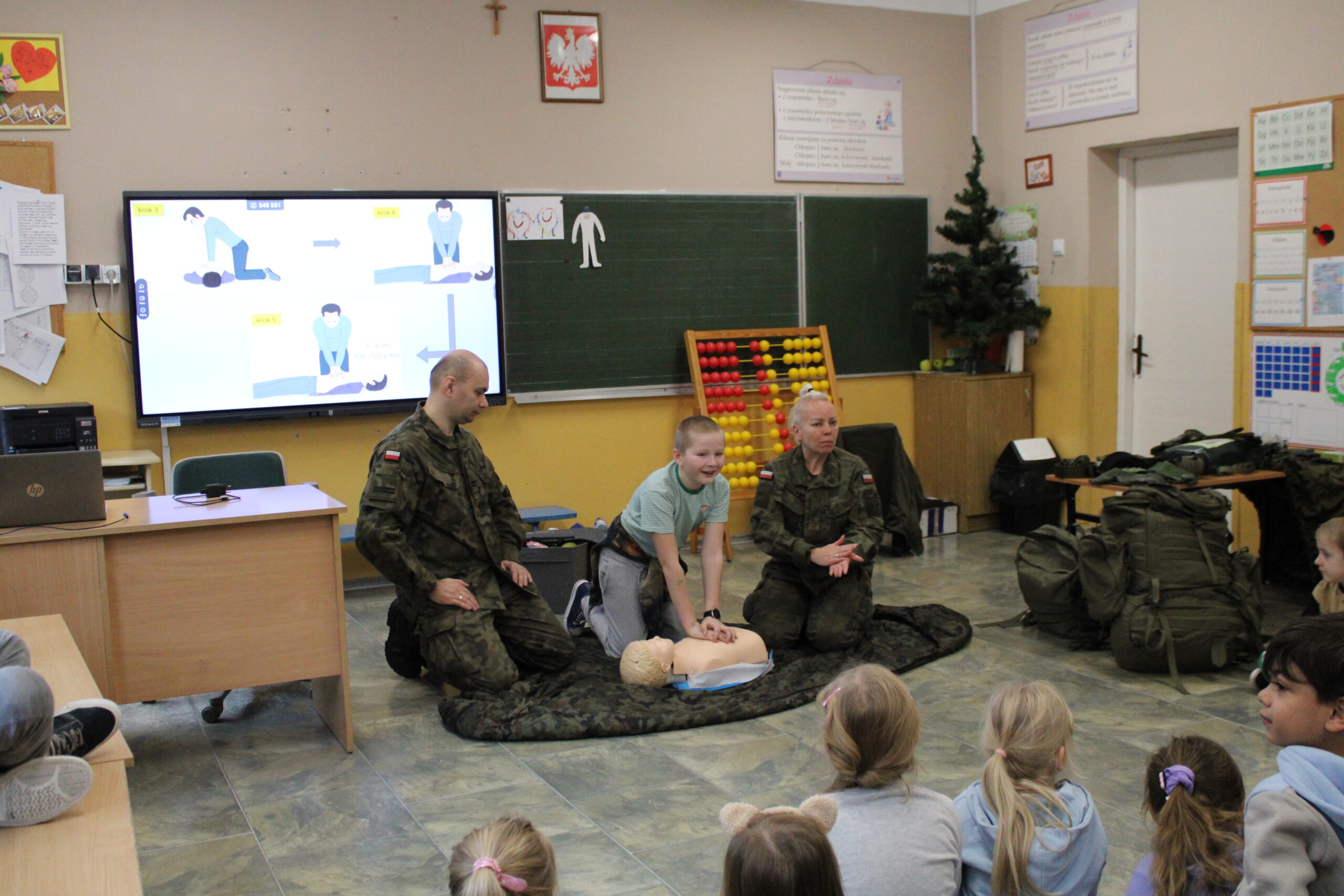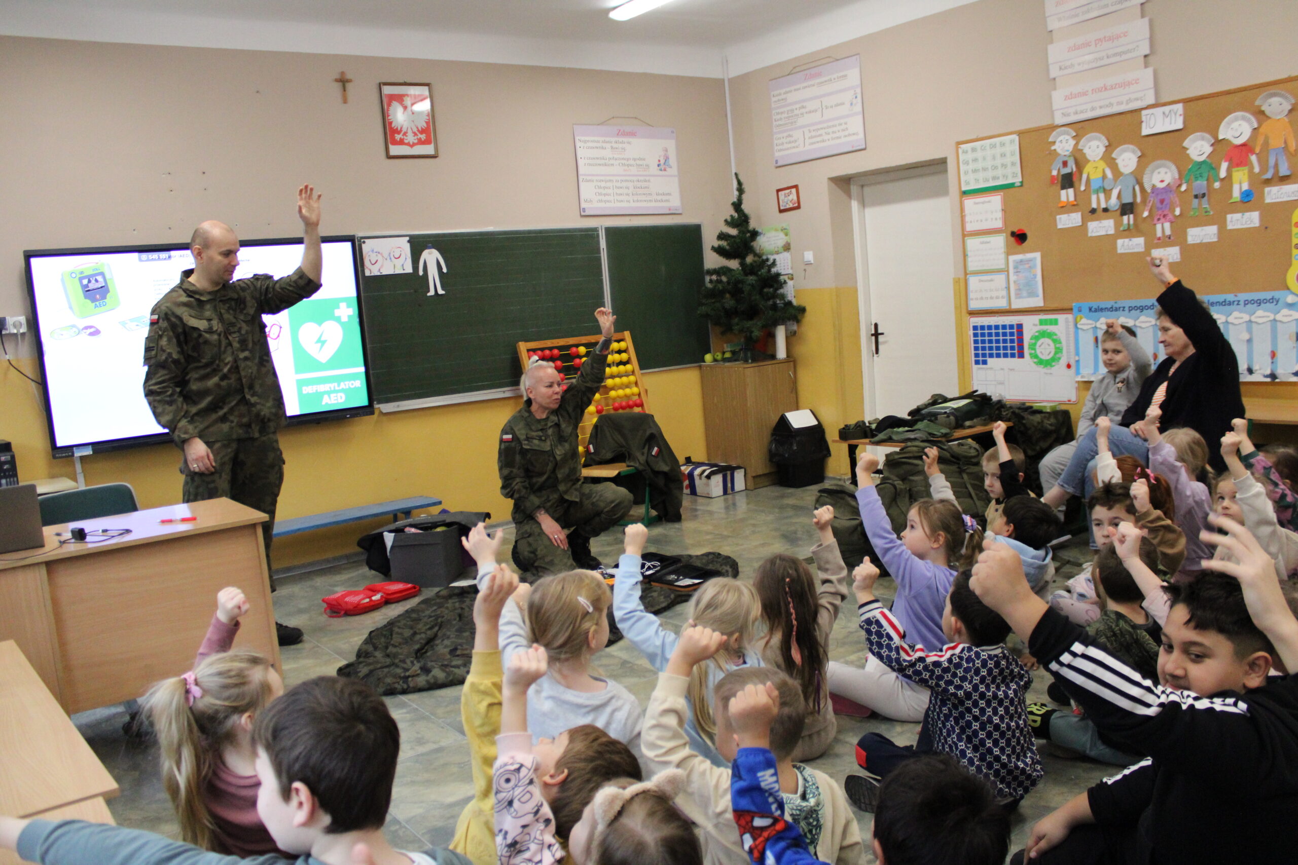 „Edukacja z wojskiem” to ogólnopolski program realizowany przez Ministerstwo Edukacji Narodowej we współpracy z Ministerstwem Obrony Narodowej. W ramach realizacji programu dziś naszą szkołę odwiedzili żołnierze 64 Batalionu Lekkiej Piechoty w Pomiechówku , kpr. Sylwester Pamięta i szer. Jolanta Kęsicka. Żołnierze przeprowadzili z uczniami klas 0-III zajęcia połączone z ćwiczeniami praktycznymi na temat alarmowania służb ratunkowych, bezpiecznego zachowania się w sytuacjach zagrożenia, udzielania pierwszej pomocy. Wszyscy uczniowie brali aktywny udział w zajęciach ucząc się prawidłowych reakcji w sytuacjach zagrożenia życia swojego i innych. Dużą ciekawość wzbudziło wyposażenie plecaka wojskowego, którego waga przekracza niekiedy 40 kg. Dzieci zobaczyły w nim min. tzw. czekoladki czyli ochraniacze na kolana i łokcie, słuchawki chroniące uszy przed hałasem, opaskę z czerwonym światełkiem, pelerynę maskującą, rękawiczki do strzelania . Nie mniejszą ciekawość wzbudziły tzw. eski czyli racje żywnościowe składające się z trzech posiłków, mających zapewnić żołnierzom dobowe wyżywienie. Dzieci podziękowały żołnierzom oklaskami , zrobiliśmy też wspólne zdjęcie. To było dla nas wyjątkowe spotkanie , spotkanie z polskim mundurem !