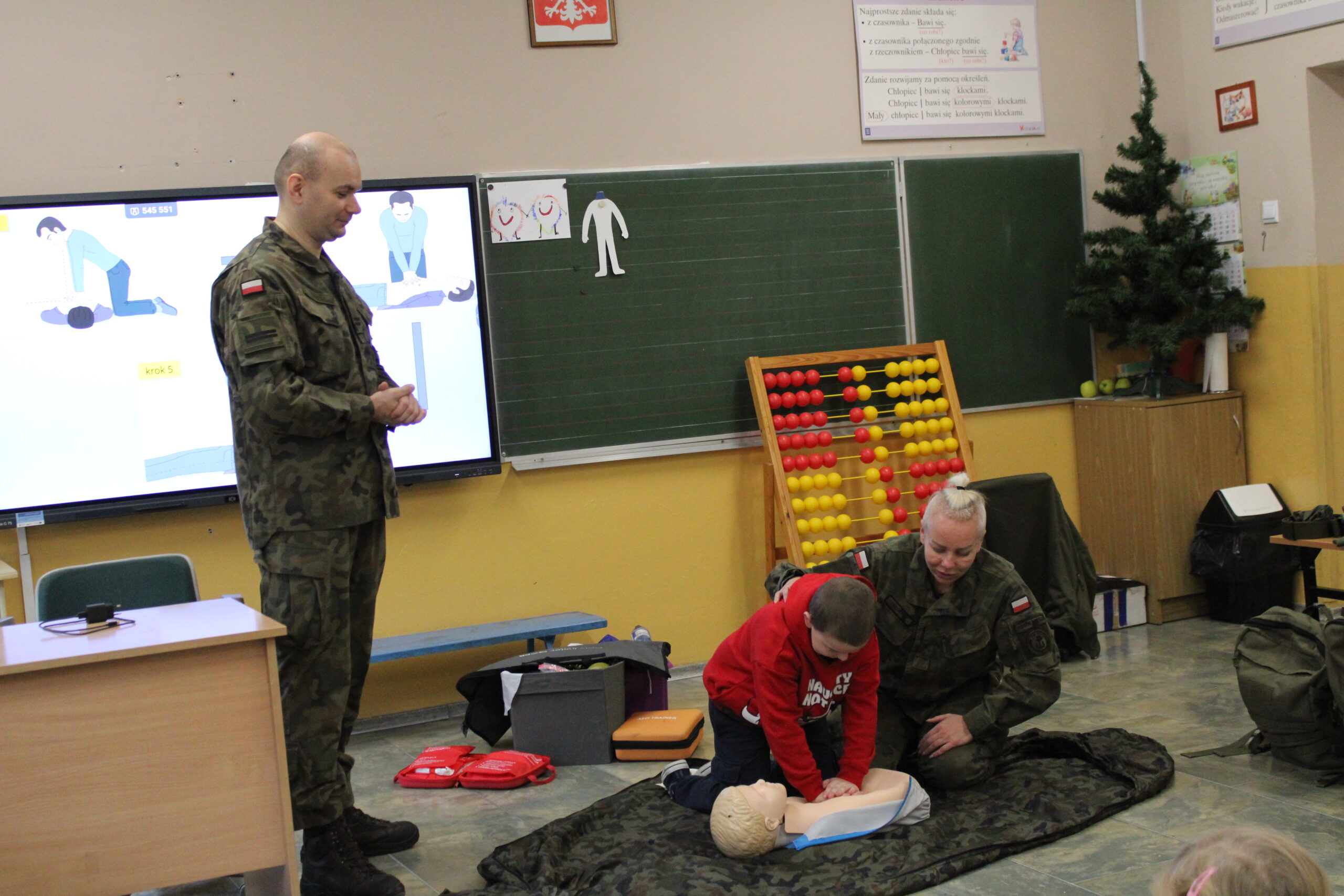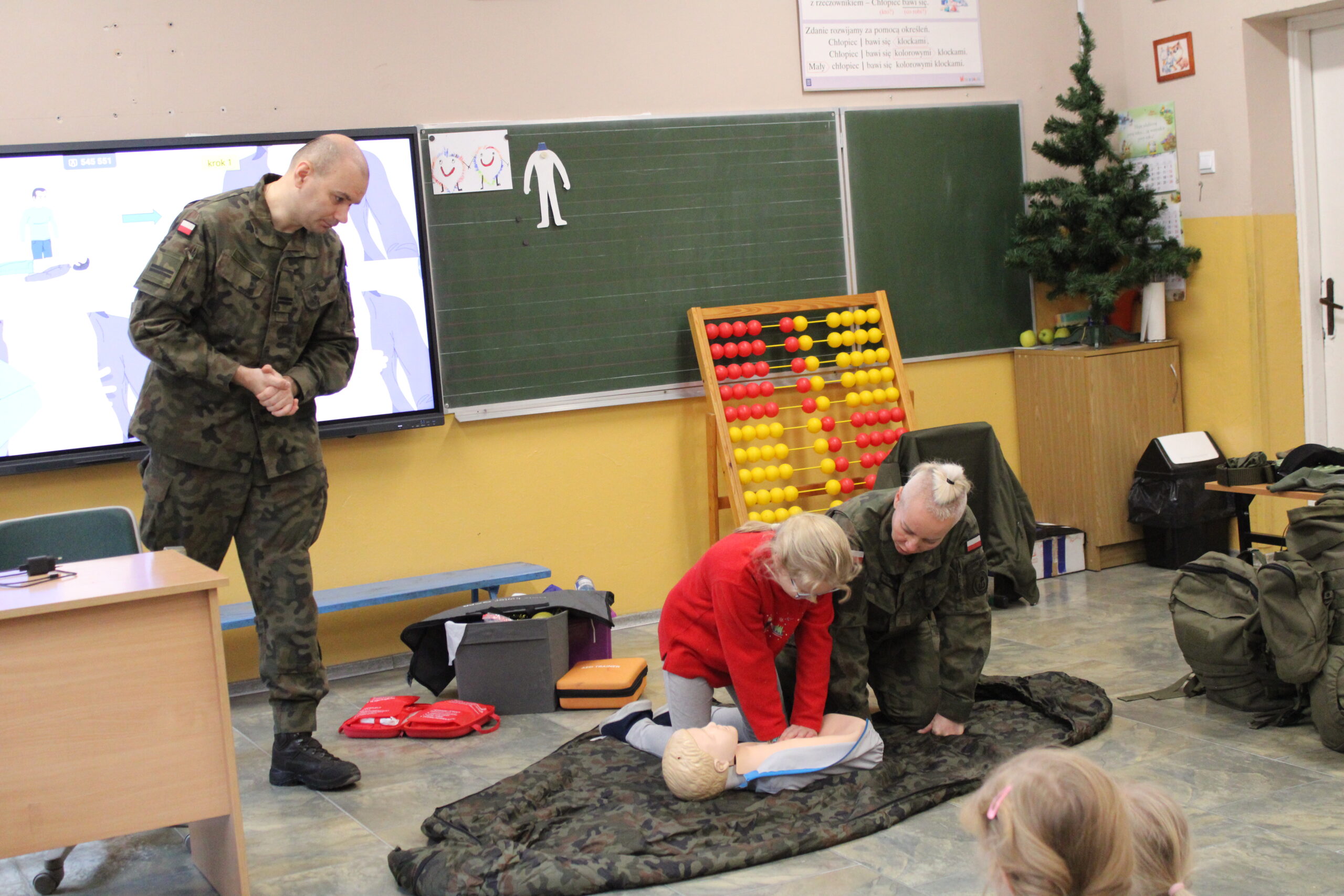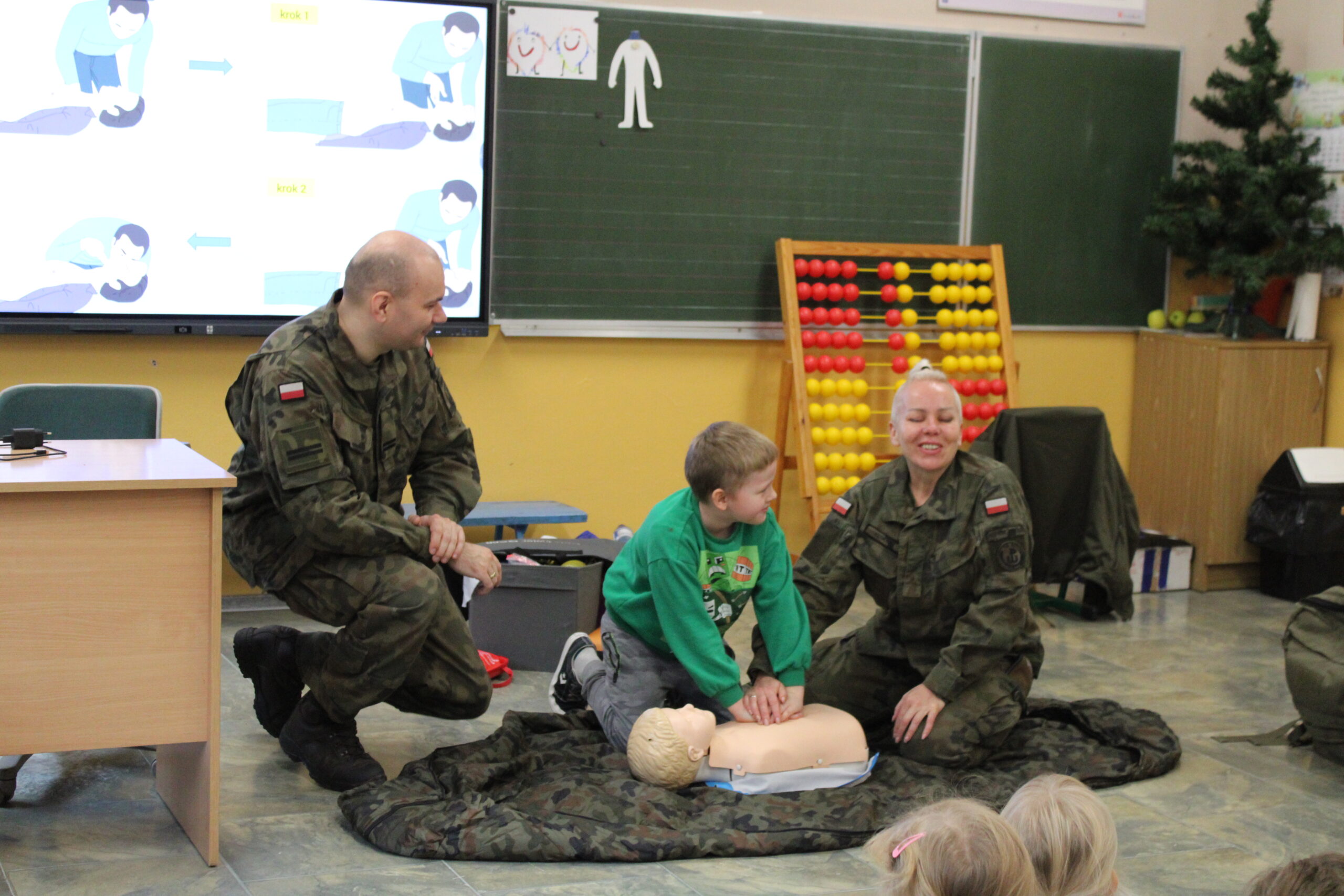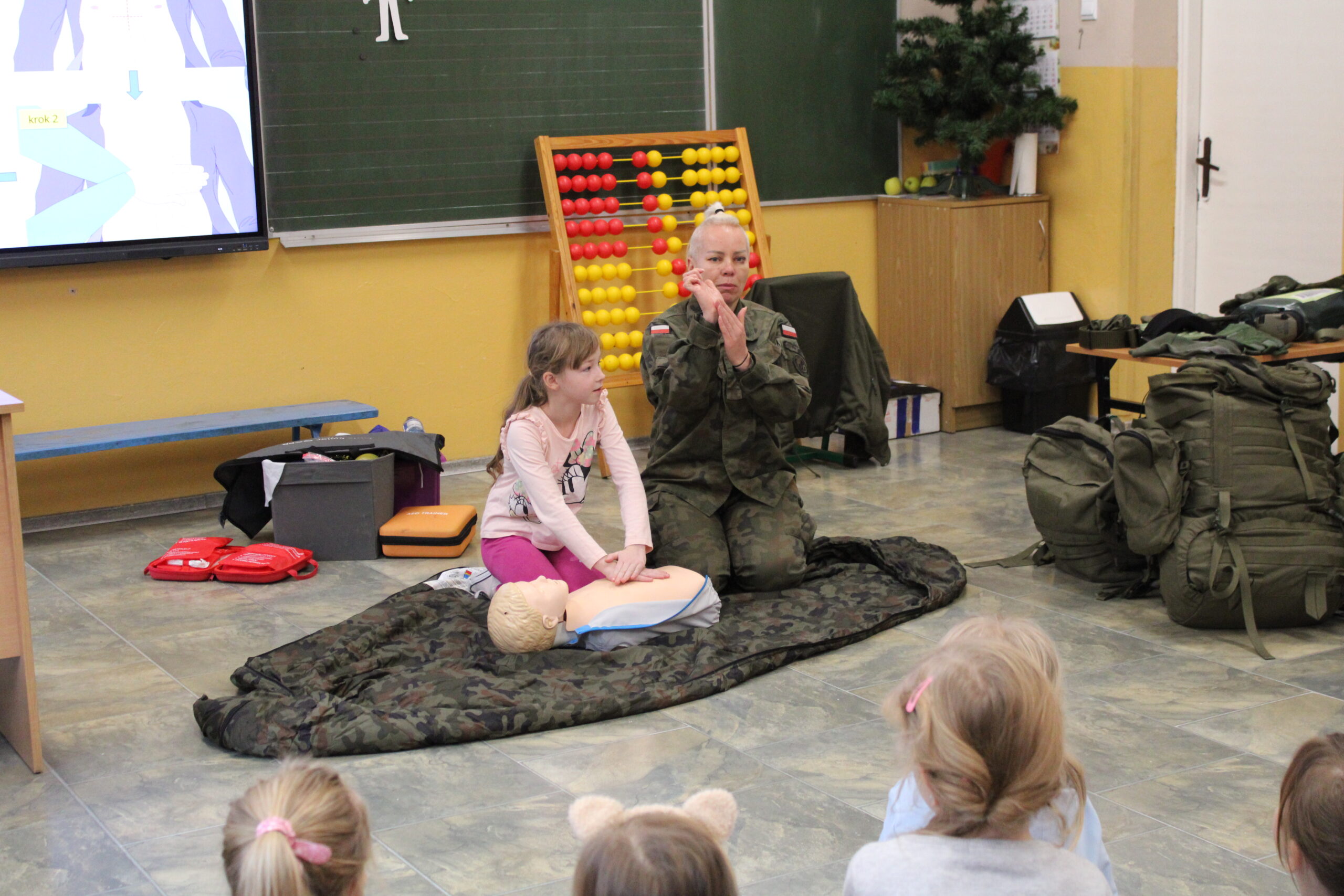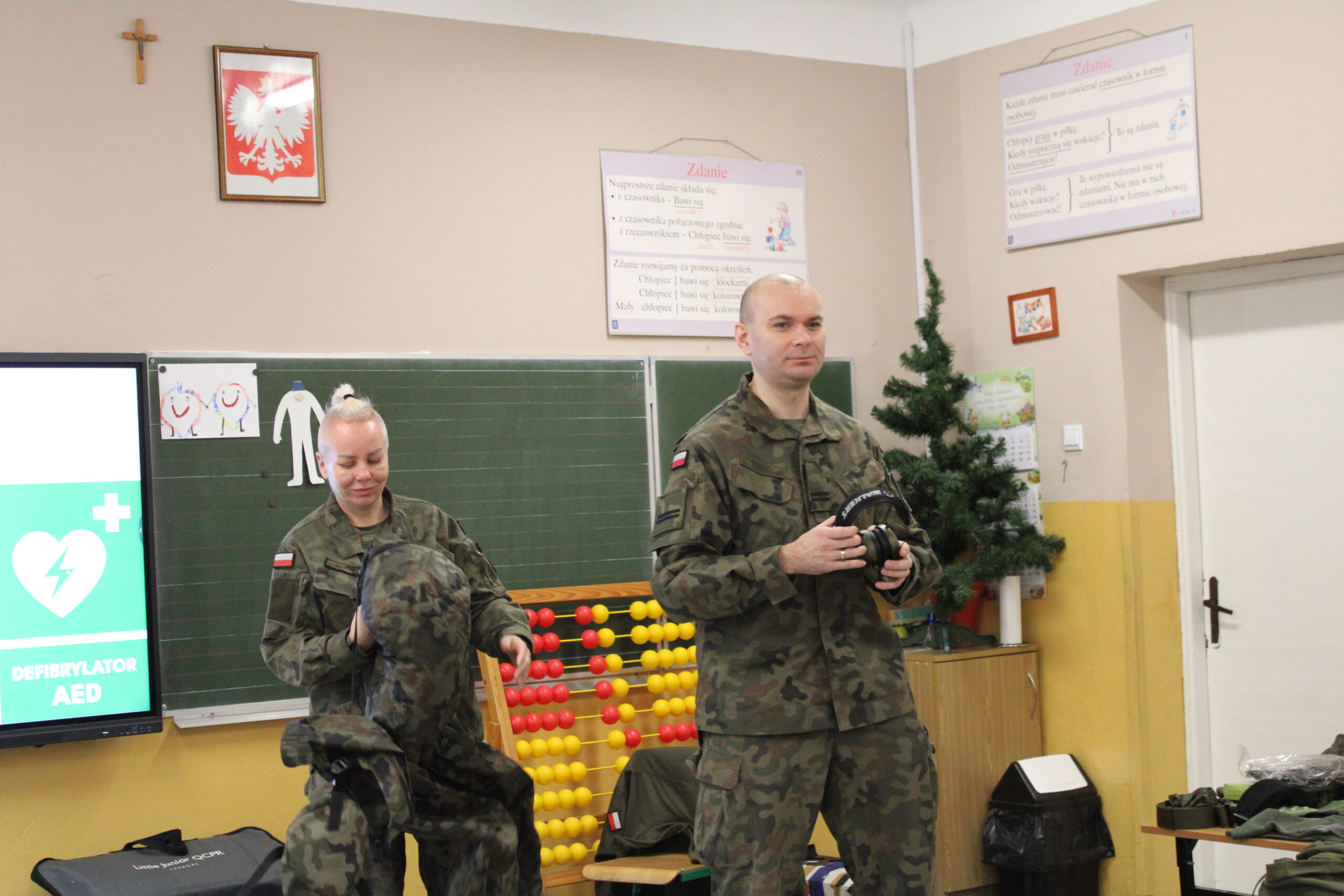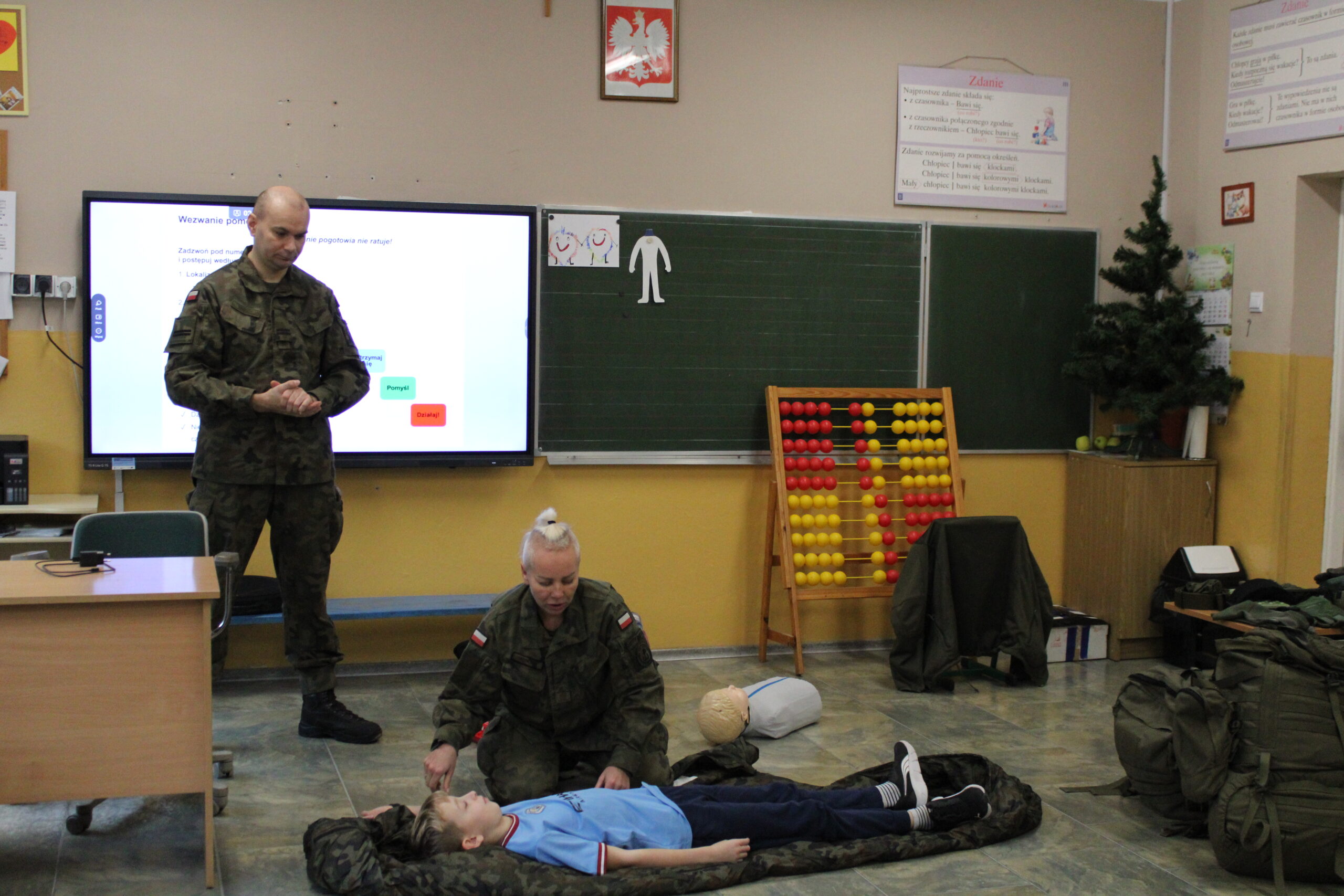 „Edukacja z wojskiem” to ogólnopolski program realizowany przez Ministerstwo Edukacji Narodowej we współpracy z Ministerstwem Obrony Narodowej. W ramach realizacji programu dziś naszą szkołę odwiedzili żołnierze 64 Batalionu Lekkiej Piechoty w Pomiechówku , kpr. Sylwester Pamięta i szer. Jolanta Kęsicka. Żołnierze przeprowadzili z uczniami klas 0-III zajęcia połączone z ćwiczeniami praktycznymi na temat alarmowania służb ratunkowych, bezpiecznego zachowania się w sytuacjach zagrożenia, udzielania pierwszej pomocy. Wszyscy uczniowie brali aktywny udział w zajęciach ucząc się prawidłowych reakcji w sytuacjach zagrożenia życia swojego i innych. Dużą ciekawość wzbudziło wyposażenie plecaka wojskowego, którego waga przekracza niekiedy 40 kg. Dzieci zobaczyły w nim min. tzw. czekoladki czyli ochraniacze na kolana i łokcie, słuchawki chroniące uszy przed hałasem, opaskę z czerwonym światełkiem, pelerynę maskującą, rękawiczki do strzelania . Nie mniejszą ciekawość wzbudziły tzw. eski czyli racje żywnościowe składające się z trzech posiłków, mających zapewnić żołnierzom dobowe wyżywienie. Dzieci podziękowały żołnierzom oklaskami , zrobiliśmy też wspólne zdjęcie. To było dla nas wyjątkowe spotkanie , spotkanie z polskim mundurem !