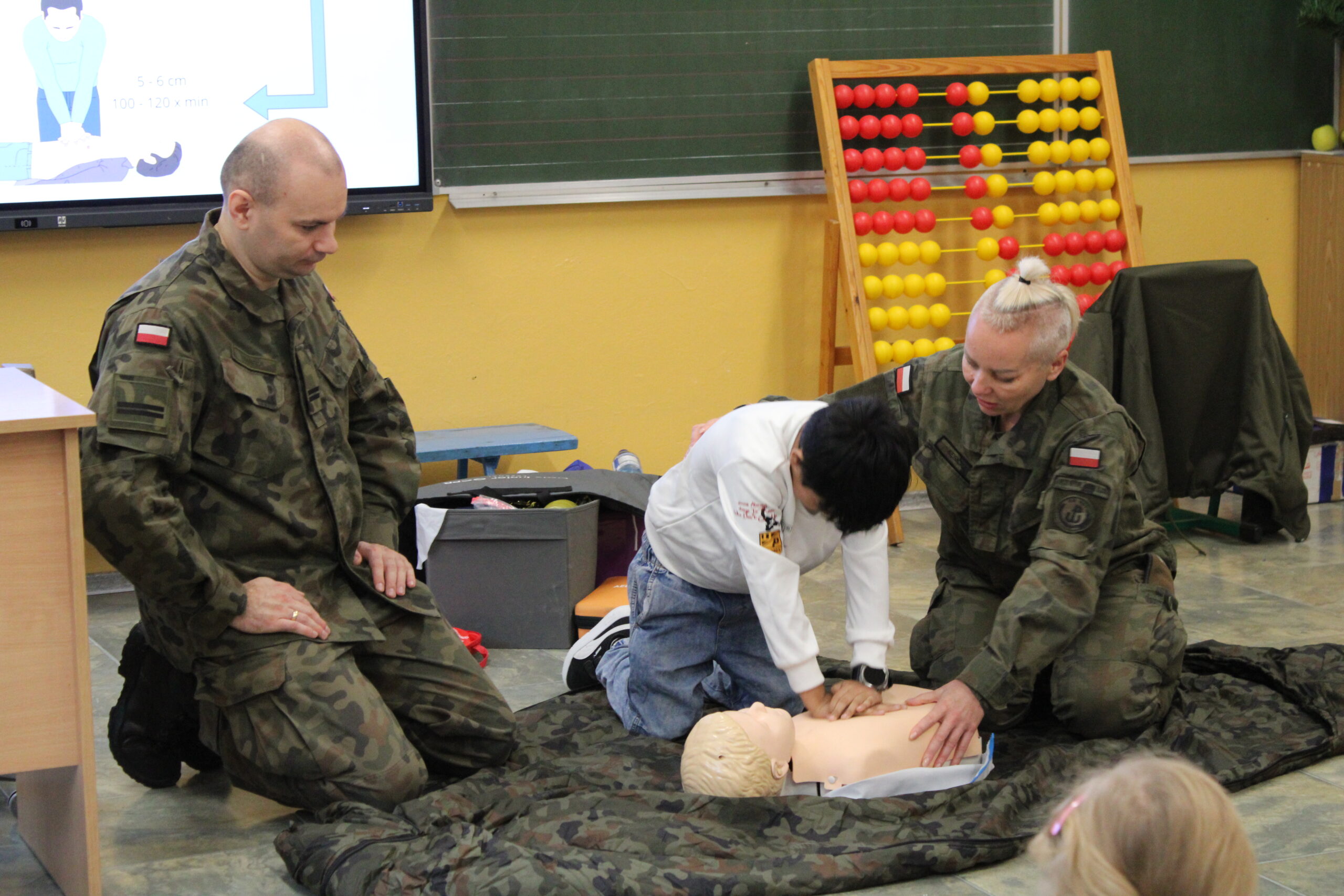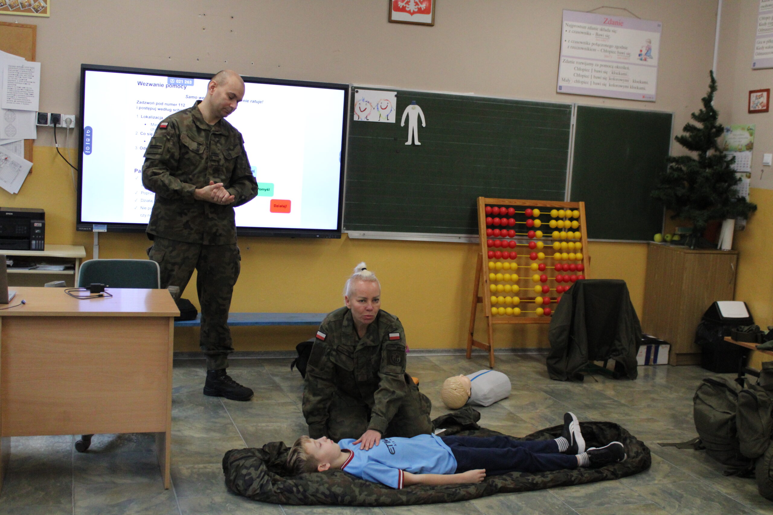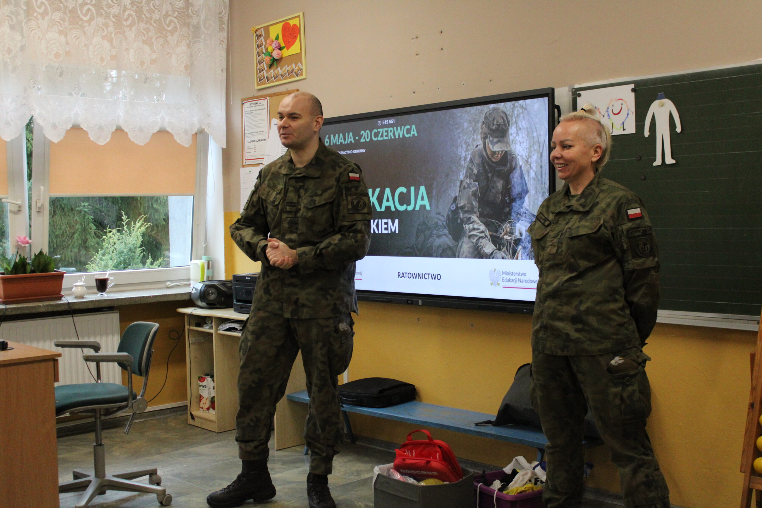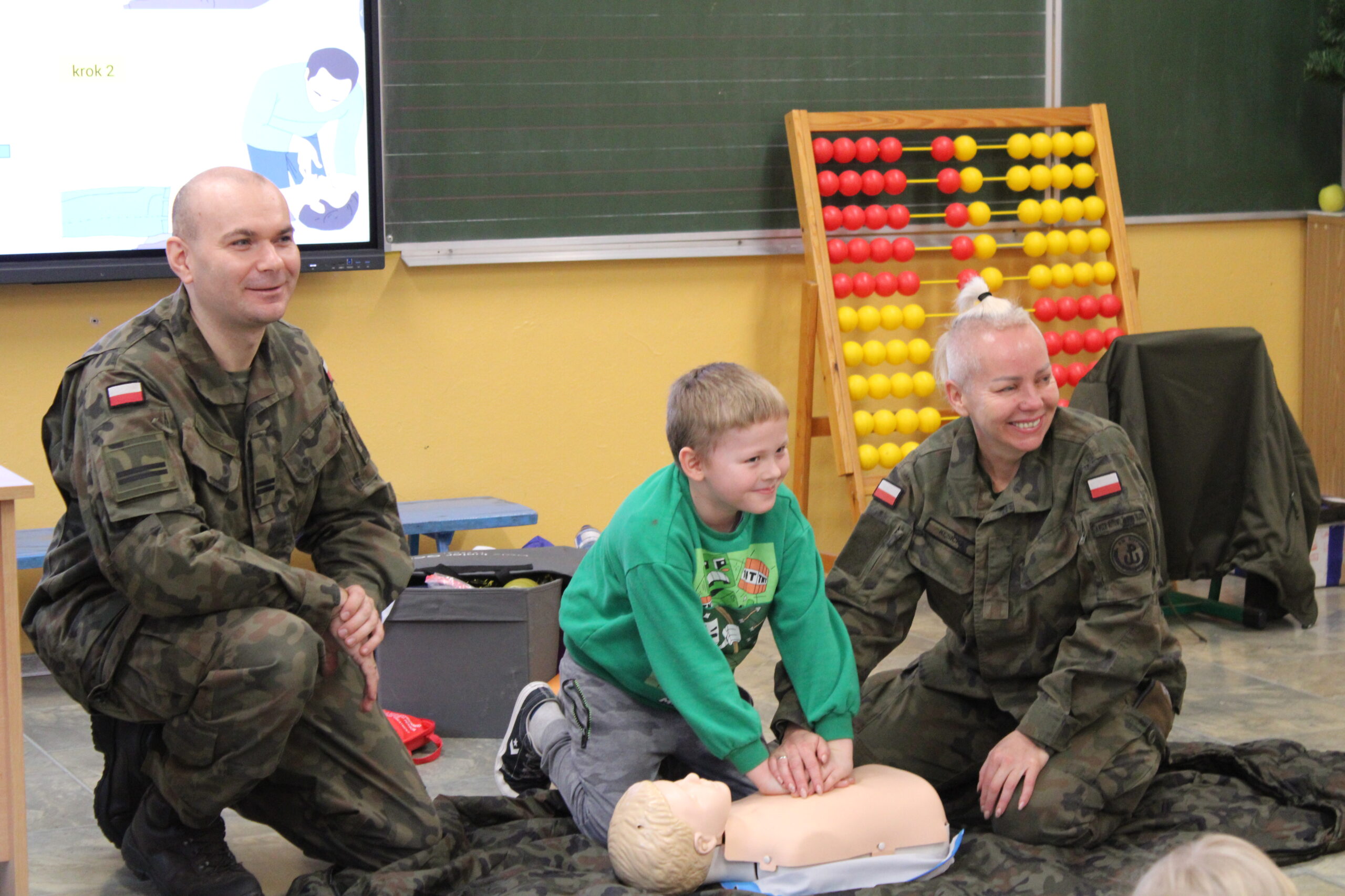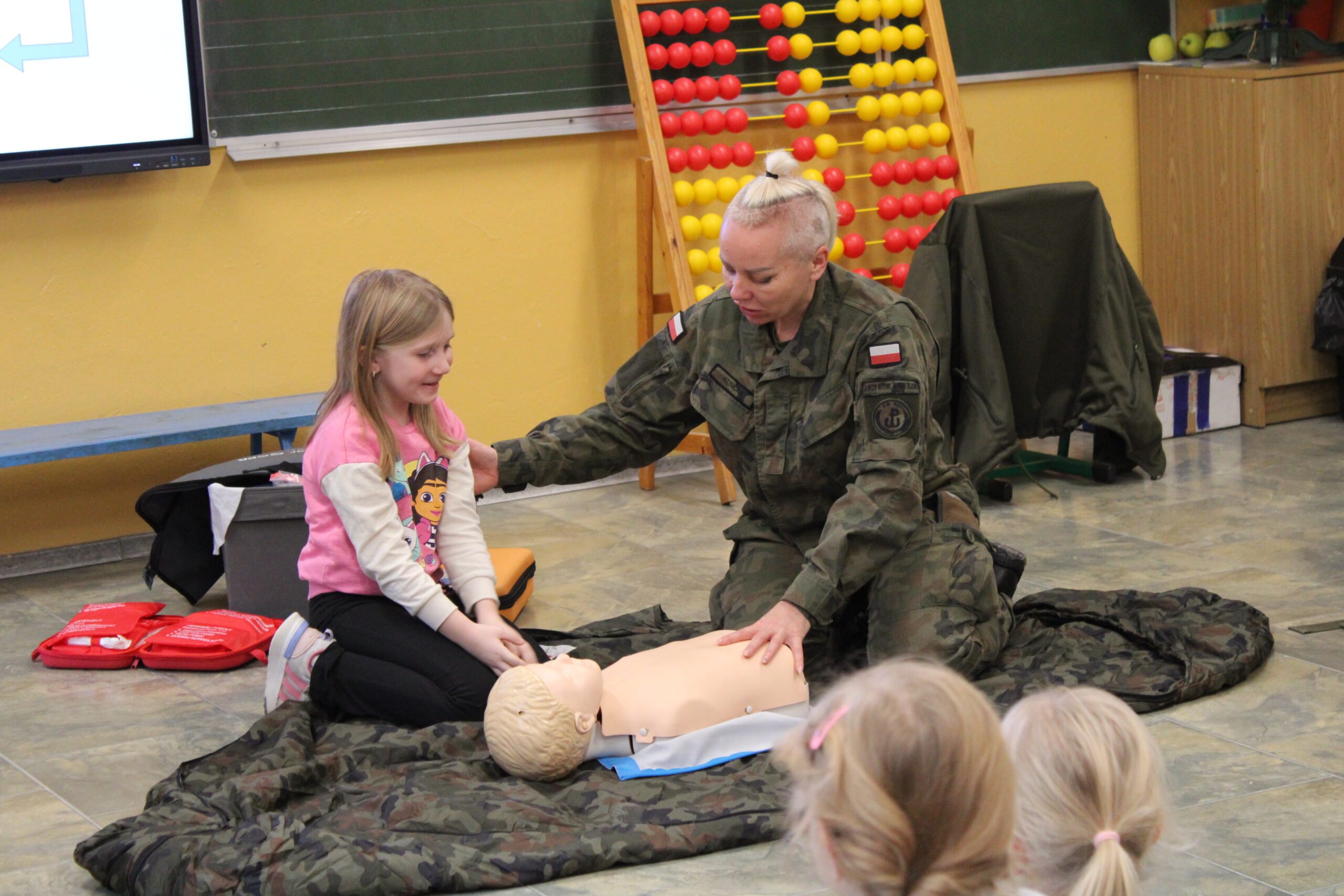 „Edukacja z wojskiem” to ogólnopolski program realizowany przez Ministerstwo Edukacji Narodowej we współpracy z Ministerstwem Obrony Narodowej. W ramach realizacji programu dziś naszą szkołę odwiedzili żołnierze 64 Batalionu Lekkiej Piechoty w Pomiechówku , kpr. Sylwester Pamięta i szer. Jolanta Kęsicka. Żołnierze przeprowadzili z uczniami klas 0-III zajęcia połączone z ćwiczeniami praktycznymi na temat alarmowania służb ratunkowych, bezpiecznego zachowania się w sytuacjach zagrożenia, udzielania pierwszej pomocy. Wszyscy uczniowie brali aktywny udział w zajęciach ucząc się prawidłowych reakcji w sytuacjach zagrożenia życia swojego i innych. Dużą ciekawość wzbudziło wyposażenie plecaka wojskowego, którego waga przekracza niekiedy 40 kg. Dzieci zobaczyły w nim min. tzw. czekoladki czyli ochraniacze na kolana i łokcie, słuchawki chroniące uszy przed hałasem, opaskę z czerwonym światełkiem, pelerynę maskującą, rękawiczki do strzelania . Nie mniejszą ciekawość wzbudziły tzw. eski czyli racje żywnościowe składające się z trzech posiłków, mających zapewnić żołnierzom dobowe wyżywienie. Dzieci podziękowały żołnierzom oklaskami , zrobiliśmy też wspólne zdjęcie. To było dla nas wyjątkowe spotkanie , spotkanie z polskim mundurem !