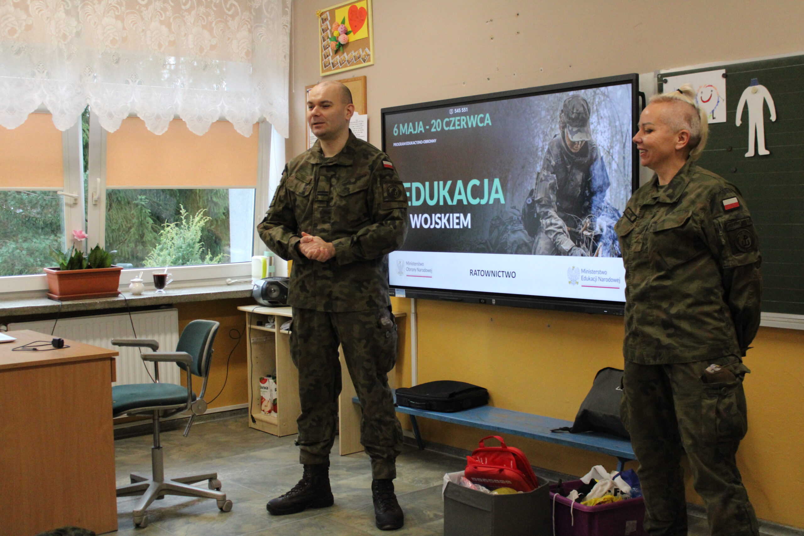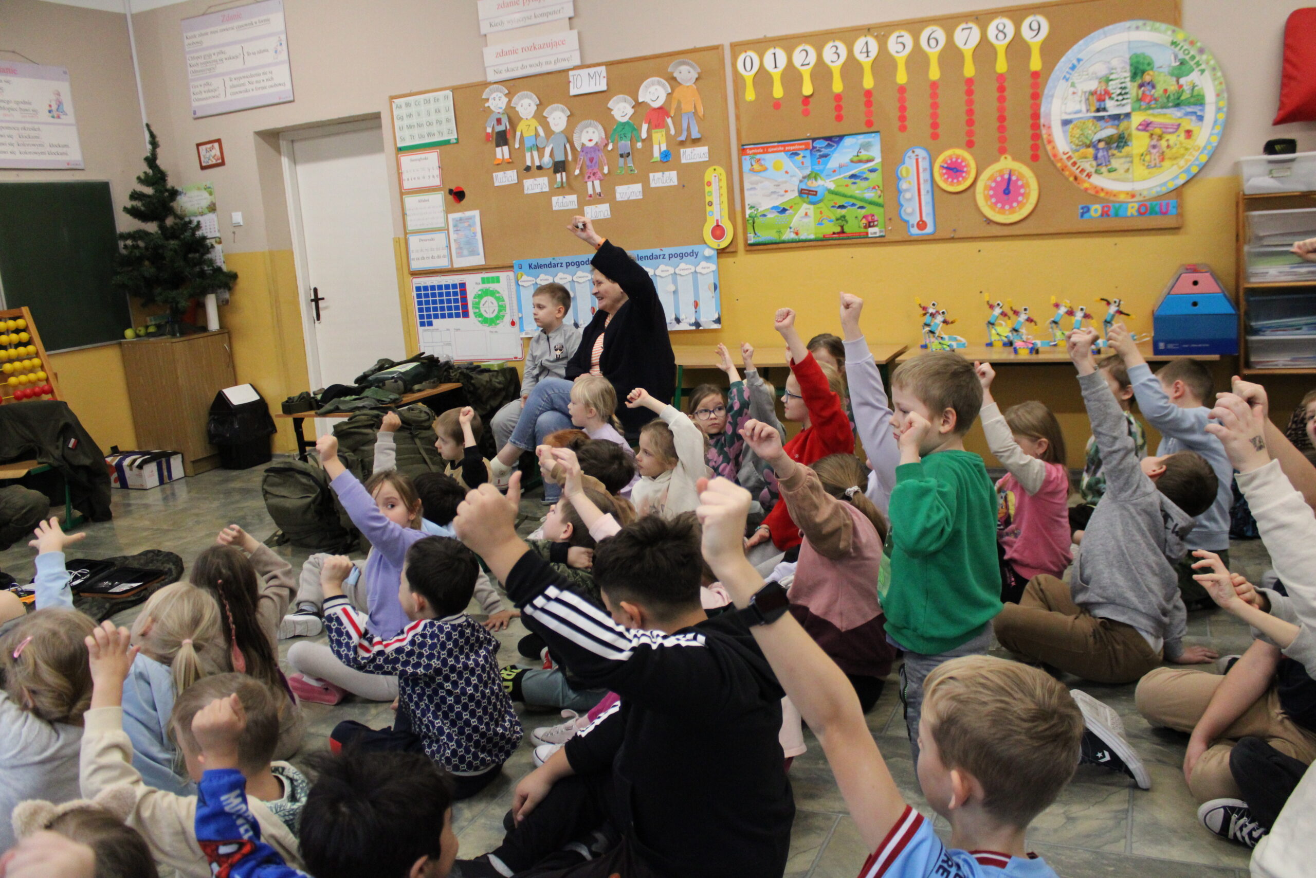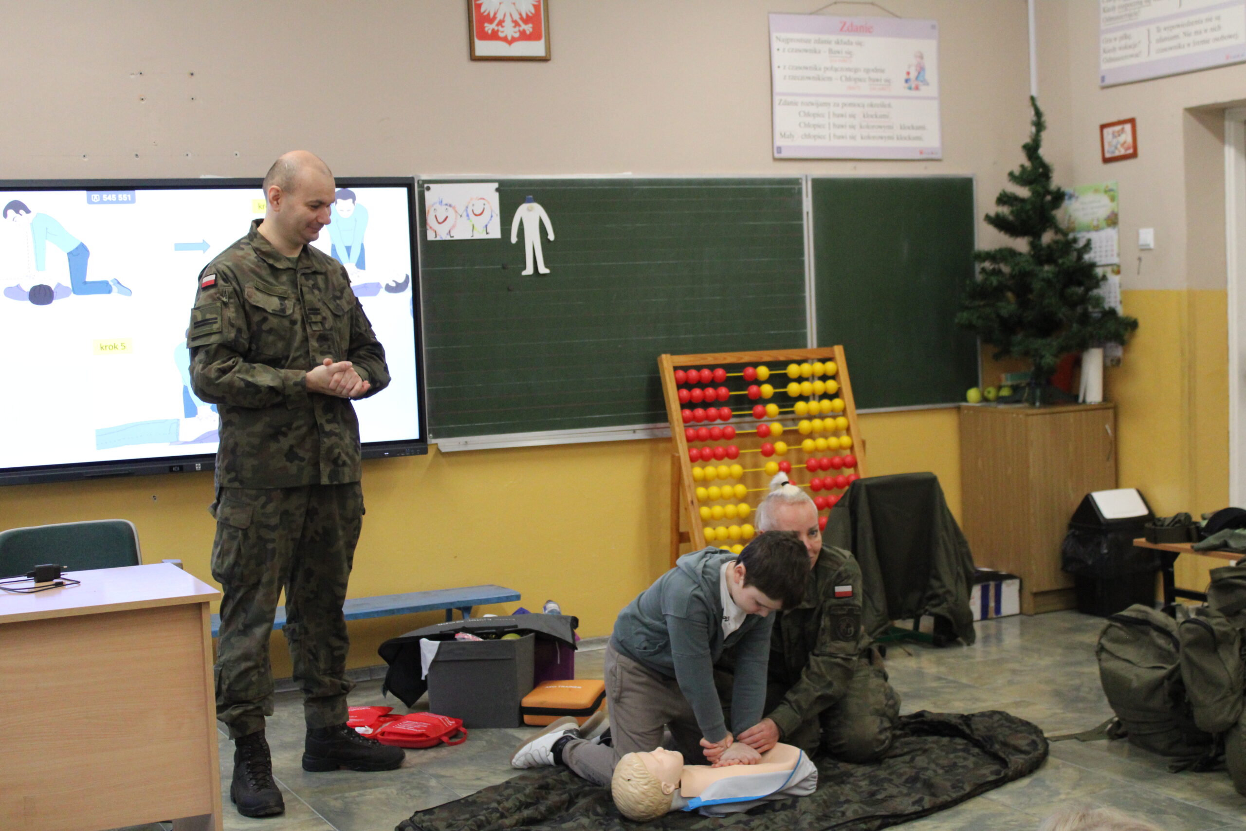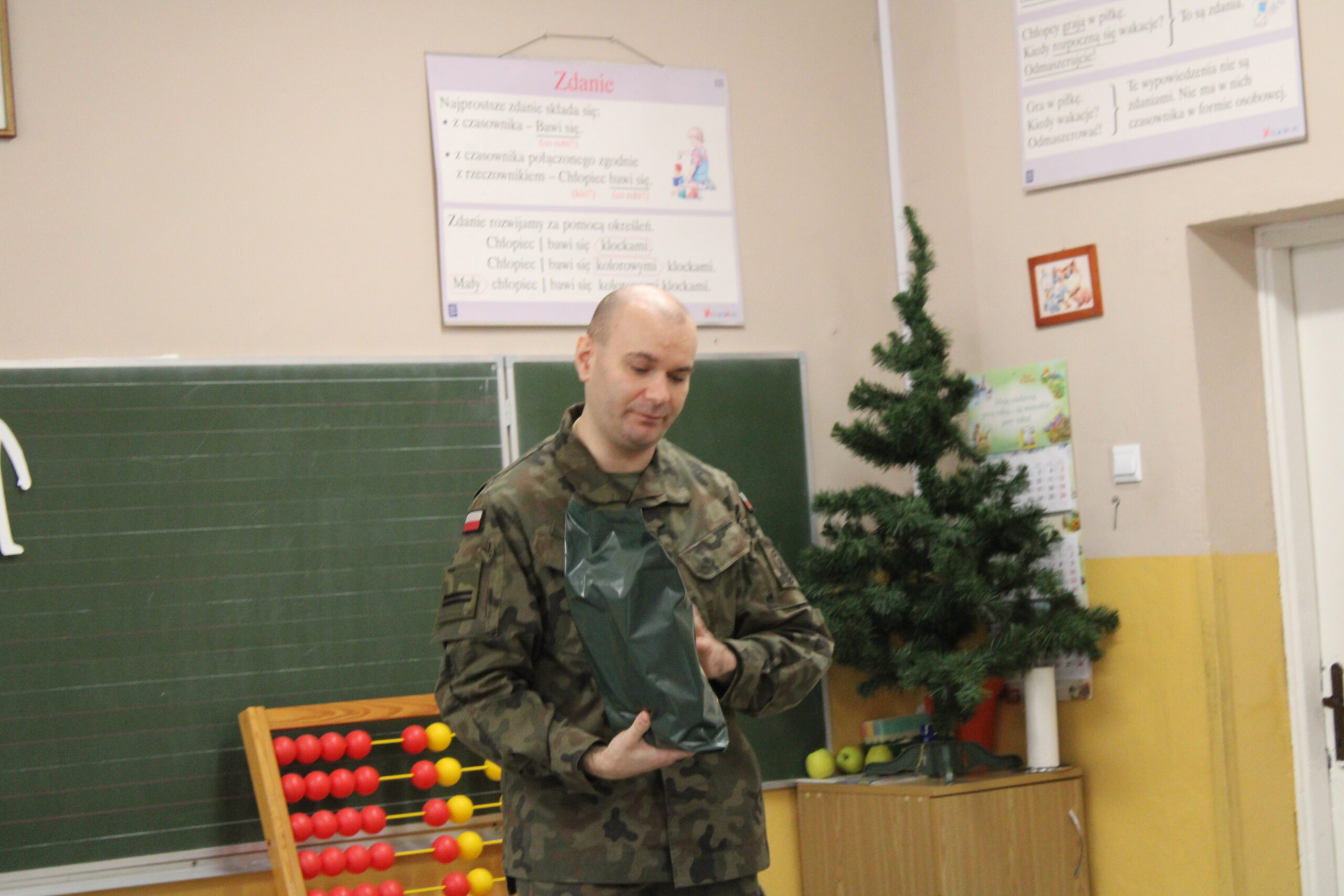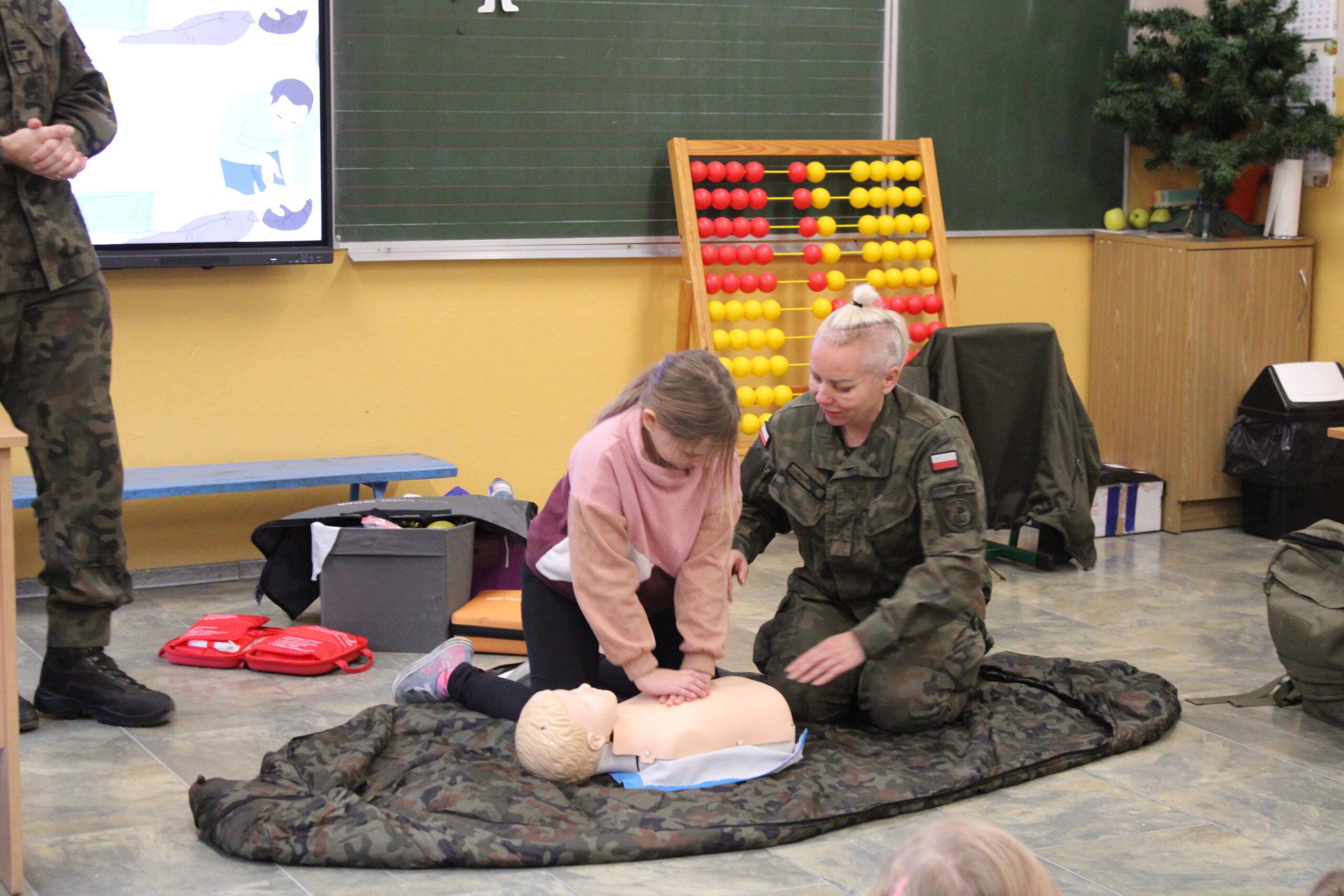 „Edukacja z wojskiem” to ogólnopolski program realizowany przez Ministerstwo Edukacji Narodowej we współpracy z Ministerstwem Obrony Narodowej. W ramach realizacji programu dziś naszą szkołę odwiedzili żołnierze 64 Batalionu Lekkiej Piechoty w Pomiechówku , kpr. Sylwester Pamięta i szer. Jolanta Kęsicka. Żołnierze przeprowadzili z uczniami klas 0-III zajęcia połączone z ćwiczeniami praktycznymi na temat alarmowania służb ratunkowych, bezpiecznego zachowania się w sytuacjach zagrożenia, udzielania pierwszej pomocy. Wszyscy uczniowie brali aktywny udział w zajęciach ucząc się prawidłowych reakcji w sytuacjach zagrożenia życia swojego i innych. Dużą ciekawość wzbudziło wyposażenie plecaka wojskowego, którego waga przekracza niekiedy 40 kg. Dzieci zobaczyły w nim min. tzw. czekoladki czyli ochraniacze na kolana i łokcie, słuchawki chroniące uszy przed hałasem, opaskę z czerwonym światełkiem, pelerynę maskującą, rękawiczki do strzelania . Nie mniejszą ciekawość wzbudziły tzw. eski czyli racje żywnościowe składające się z trzech posiłków, mających zapewnić żołnierzom dobowe wyżywienie. Dzieci podziękowały żołnierzom oklaskami , zrobiliśmy też wspólne zdjęcie. To było dla nas wyjątkowe spotkanie , spotkanie z polskim mundurem !