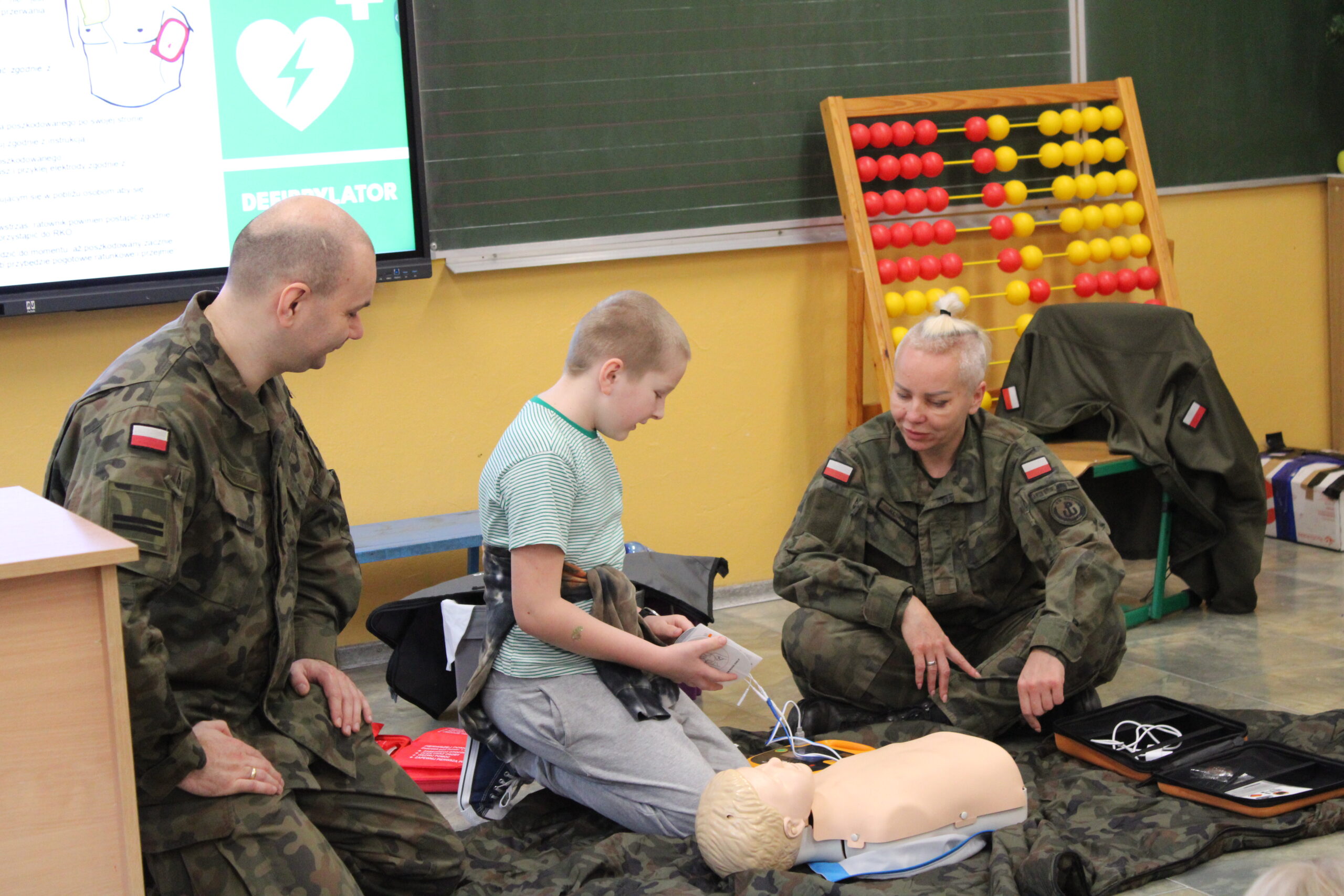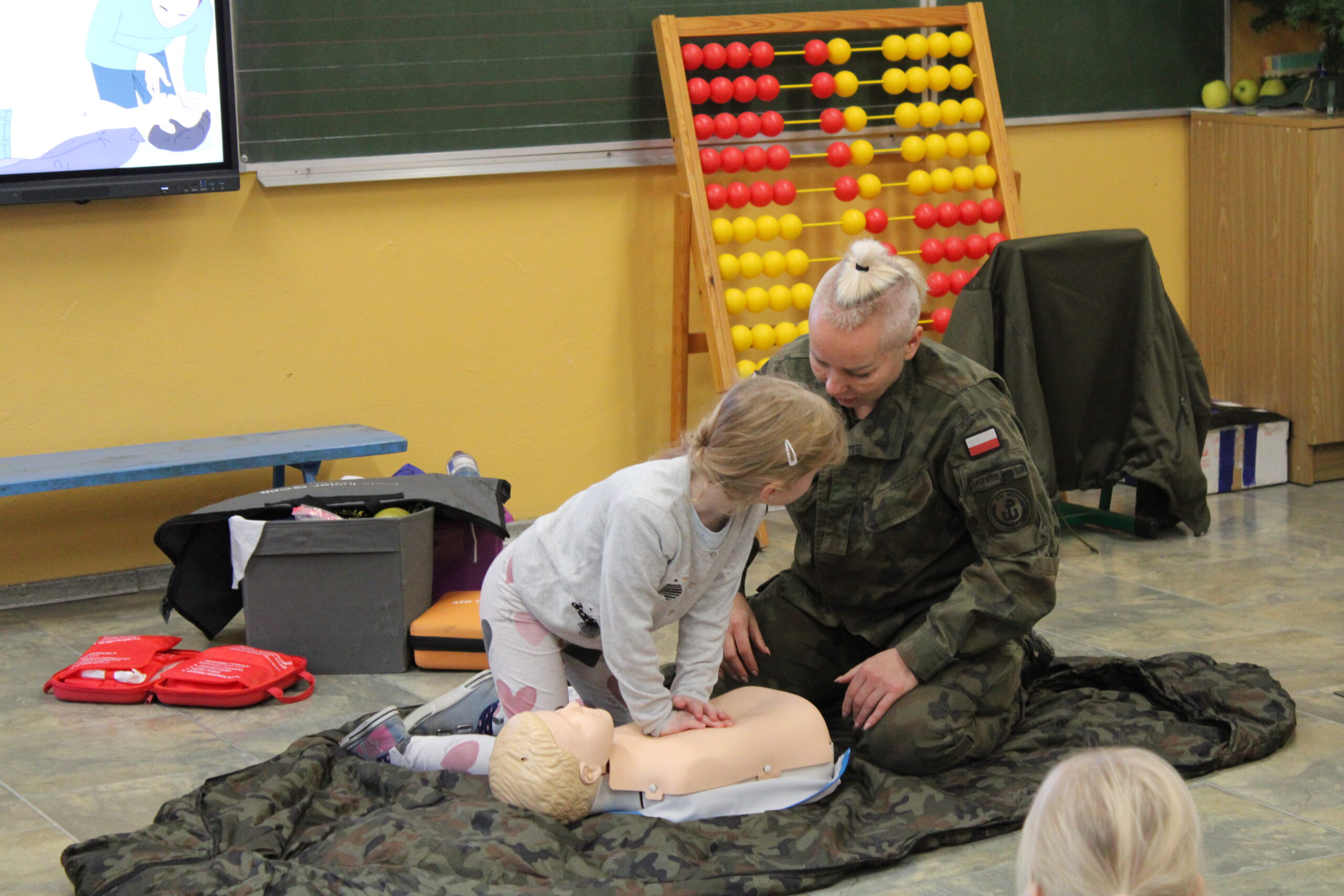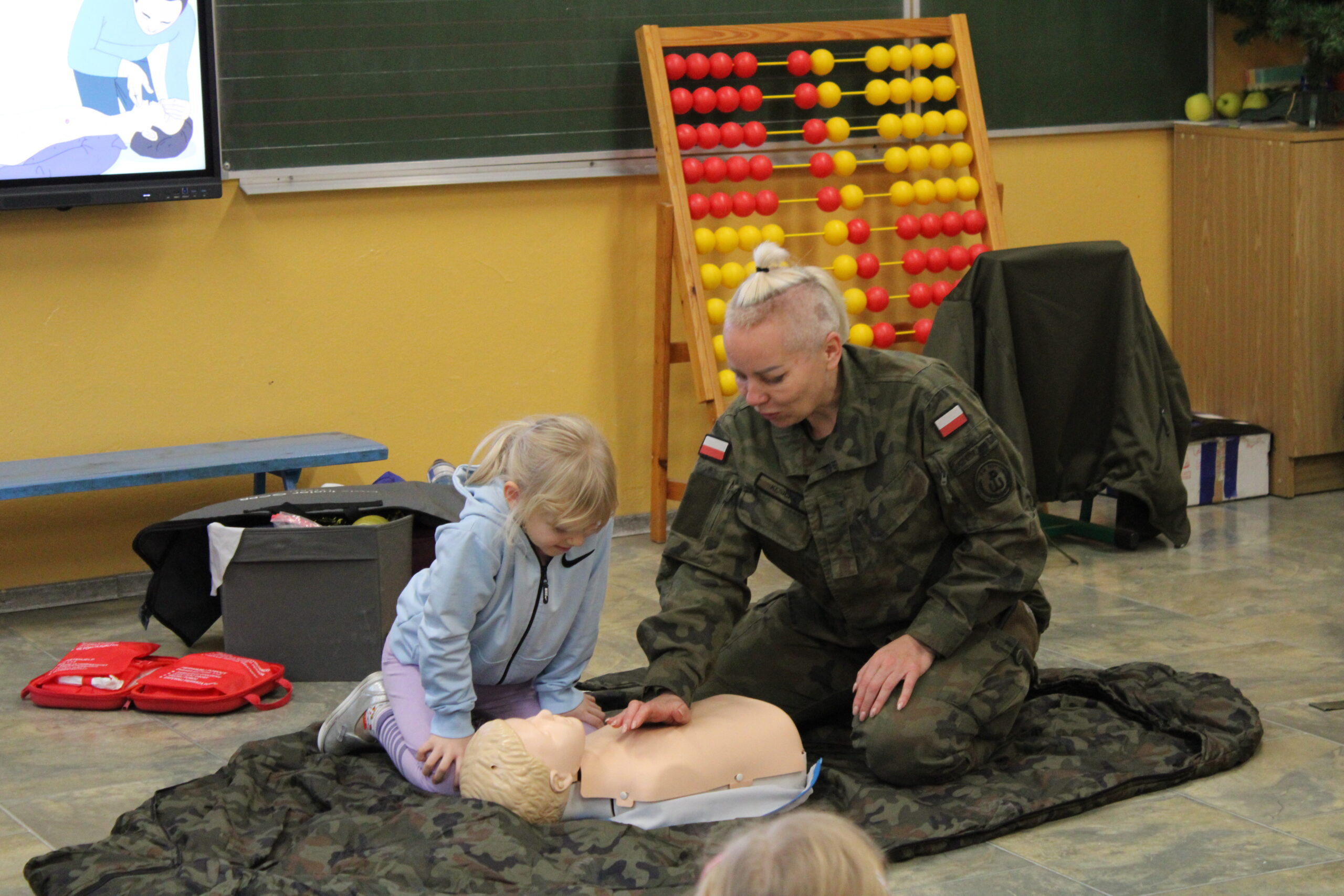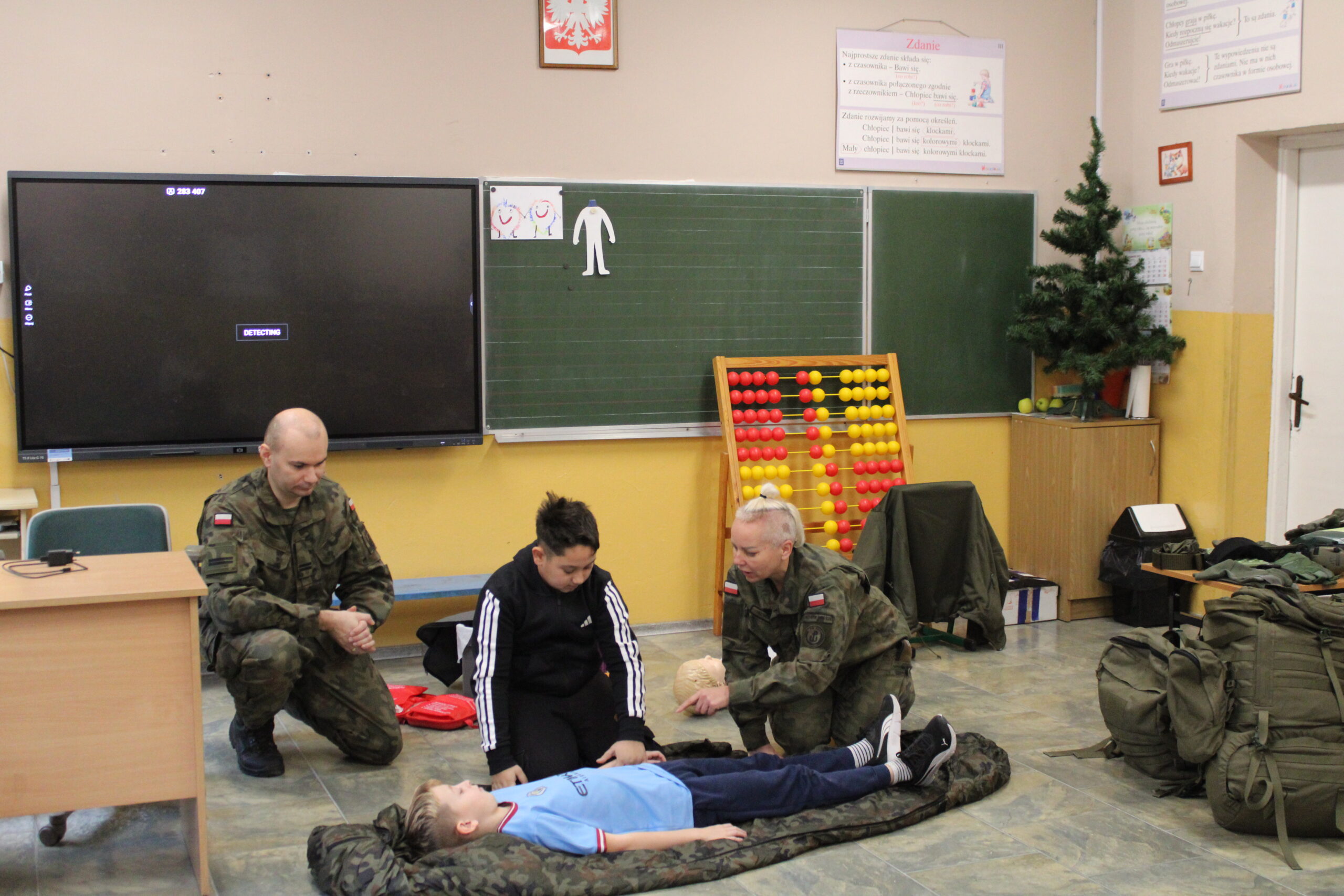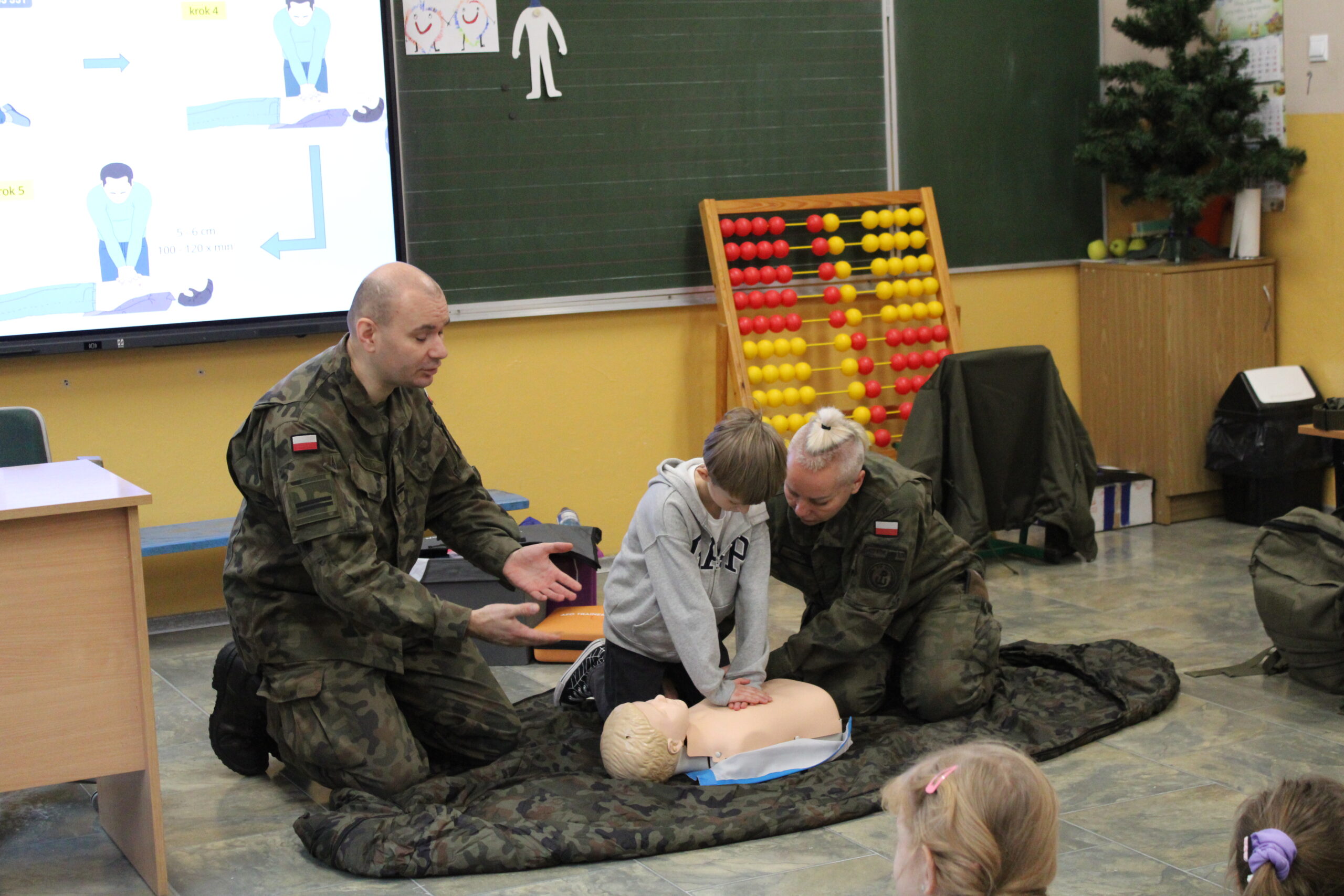 „Edukacja z wojskiem” to ogólnopolski program realizowany przez Ministerstwo Edukacji Narodowej we współpracy z Ministerstwem Obrony Narodowej. W ramach realizacji programu dziś naszą szkołę odwiedzili żołnierze 64 Batalionu Lekkiej Piechoty w Pomiechówku , kpr. Sylwester Pamięta i szer. Jolanta Kęsicka. Żołnierze przeprowadzili z uczniami klas 0-III zajęcia połączone z ćwiczeniami praktycznymi na temat alarmowania służb ratunkowych, bezpiecznego zachowania się w sytuacjach zagrożenia, udzielania pierwszej pomocy. Wszyscy uczniowie brali aktywny udział w zajęciach ucząc się prawidłowych reakcji w sytuacjach zagrożenia życia swojego i innych. Dużą ciekawość wzbudziło wyposażenie plecaka wojskowego, którego waga przekracza niekiedy 40 kg. Dzieci zobaczyły w nim min. tzw. czekoladki czyli ochraniacze na kolana i łokcie, słuchawki chroniące uszy przed hałasem, opaskę z czerwonym światełkiem, pelerynę maskującą, rękawiczki do strzelania . Nie mniejszą ciekawość wzbudziły tzw. eski czyli racje żywnościowe składające się z trzech posiłków, mających zapewnić żołnierzom dobowe wyżywienie. Dzieci podziękowały żołnierzom oklaskami , zrobiliśmy też wspólne zdjęcie. To było dla nas wyjątkowe spotkanie , spotkanie z polskim mundurem !