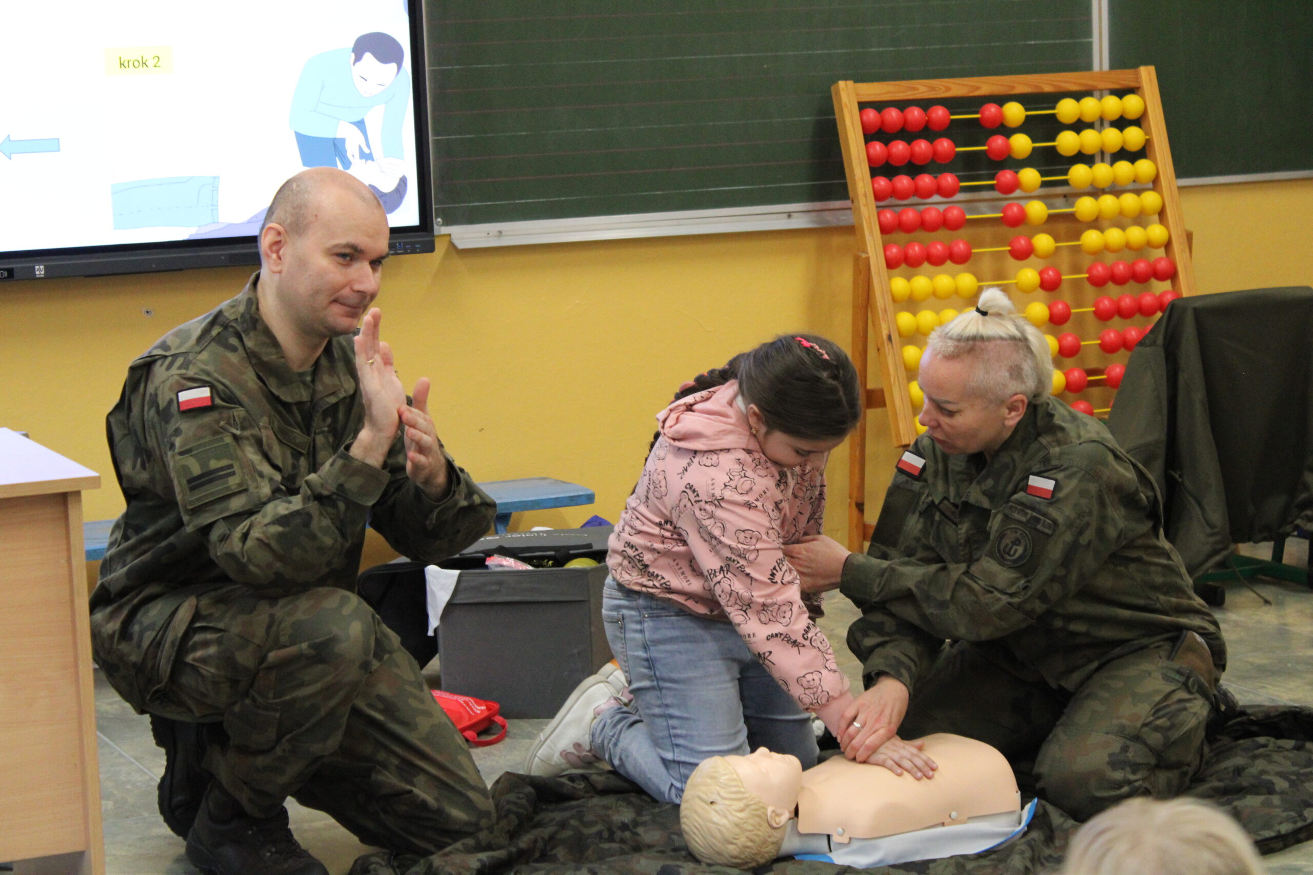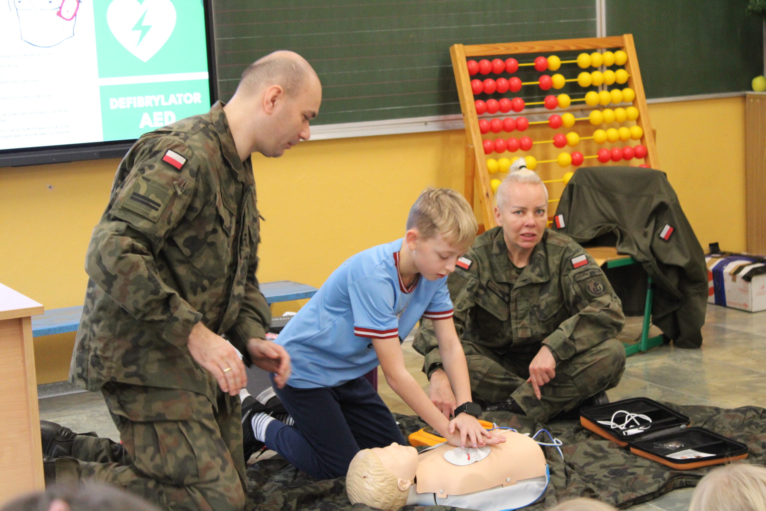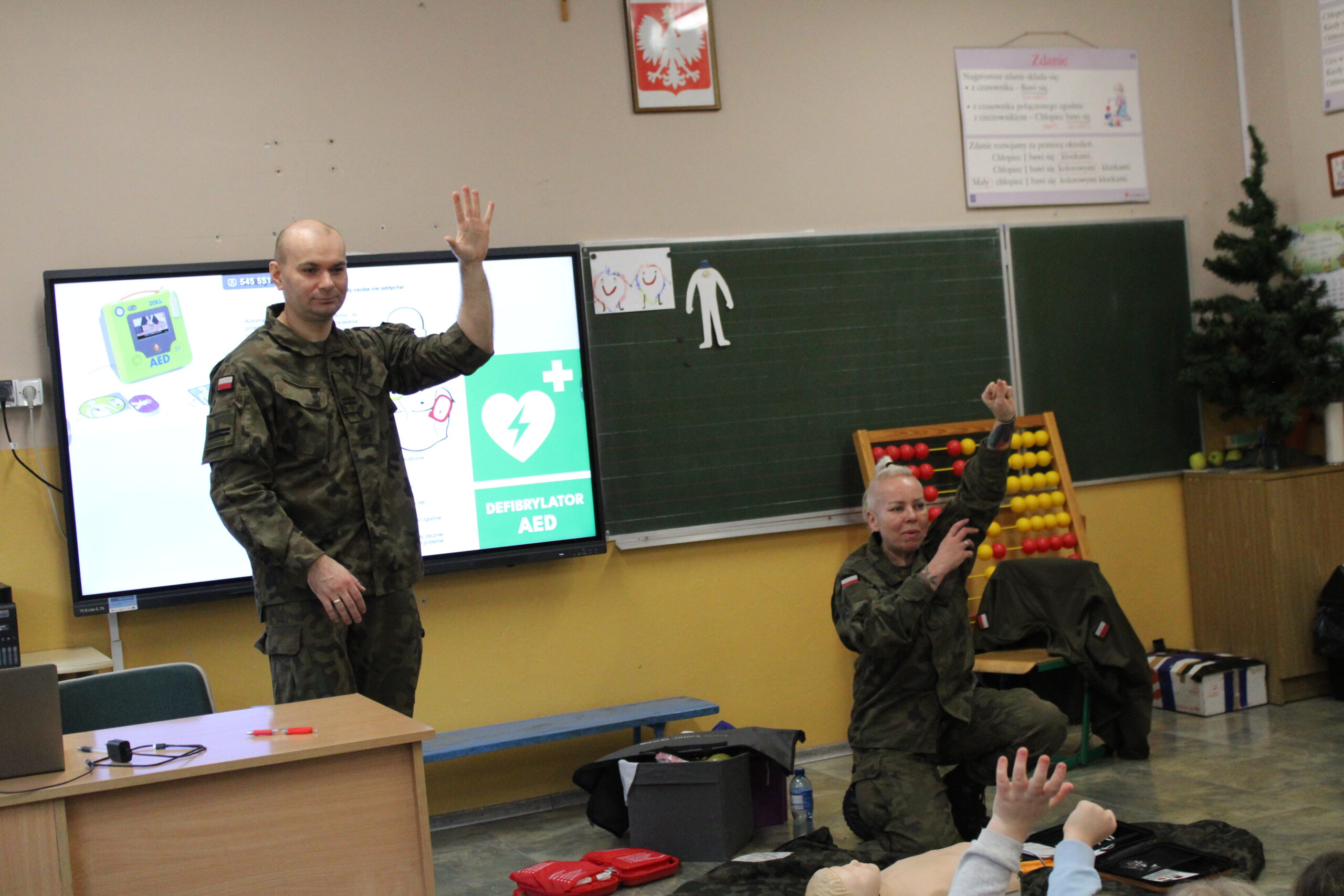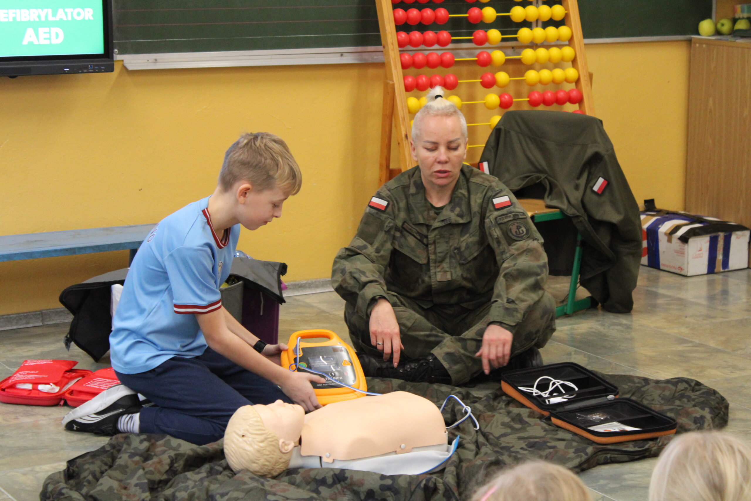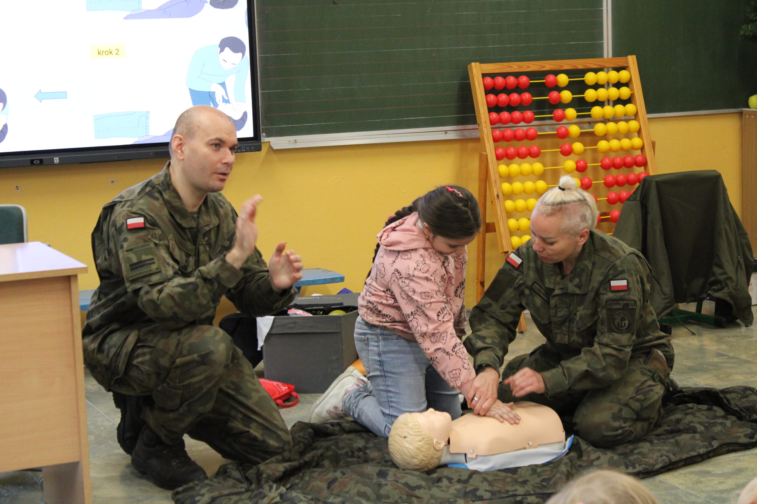 „Edukacja z wojskiem” to ogólnopolski program realizowany przez Ministerstwo Edukacji Narodowej we współpracy z Ministerstwem Obrony Narodowej. W ramach realizacji programu dziś naszą szkołę odwiedzili żołnierze 64 Batalionu Lekkiej Piechoty w Pomiechówku , kpr. Sylwester Pamięta i szer. Jolanta Kęsicka. Żołnierze przeprowadzili z uczniami klas 0-III zajęcia połączone z ćwiczeniami praktycznymi na temat alarmowania służb ratunkowych, bezpiecznego zachowania się w sytuacjach zagrożenia, udzielania pierwszej pomocy. Wszyscy uczniowie brali aktywny udział w zajęciach ucząc się prawidłowych reakcji w sytuacjach zagrożenia życia swojego i innych. Dużą ciekawość wzbudziło wyposażenie plecaka wojskowego, którego waga przekracza niekiedy 40 kg. Dzieci zobaczyły w nim min. tzw. czekoladki czyli ochraniacze na kolana i łokcie, słuchawki chroniące uszy przed hałasem, opaskę z czerwonym światełkiem, pelerynę maskującą, rękawiczki do strzelania . Nie mniejszą ciekawość wzbudziły tzw. eski czyli racje żywnościowe składające się z trzech posiłków, mających zapewnić żołnierzom dobowe wyżywienie. Dzieci podziękowały żołnierzom oklaskami , zrobiliśmy też wspólne zdjęcie. To było dla nas wyjątkowe spotkanie , spotkanie z polskim mundurem !