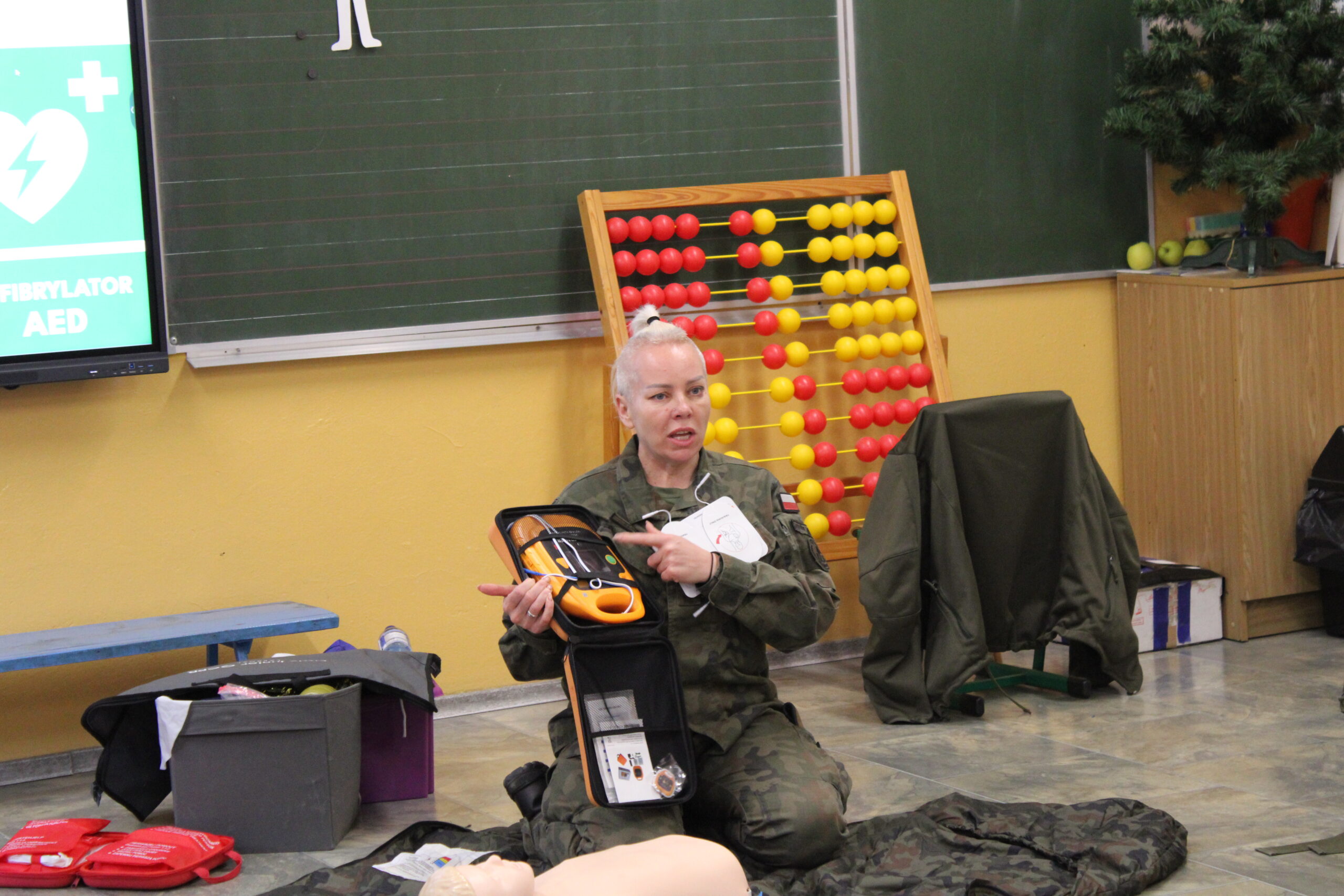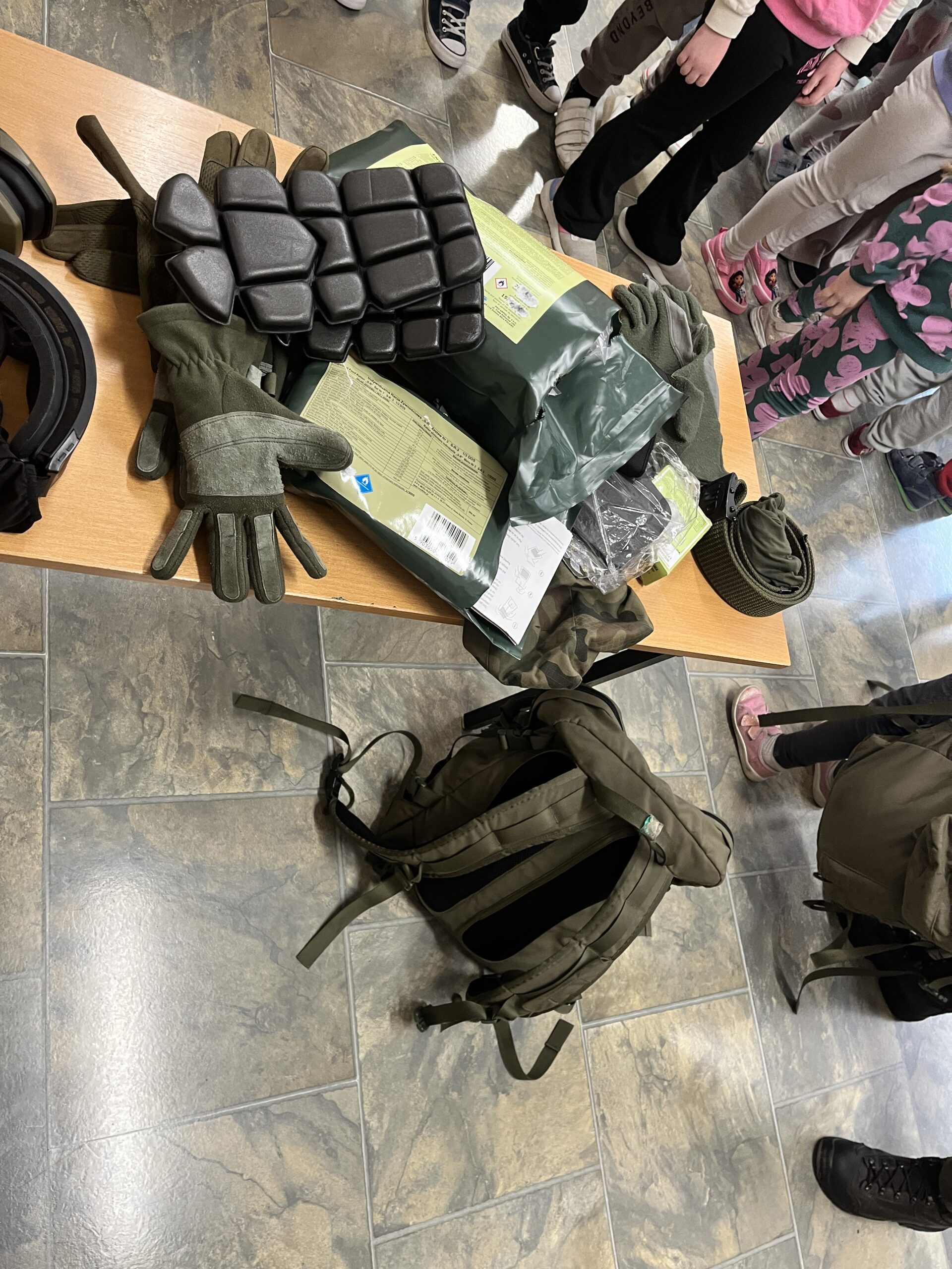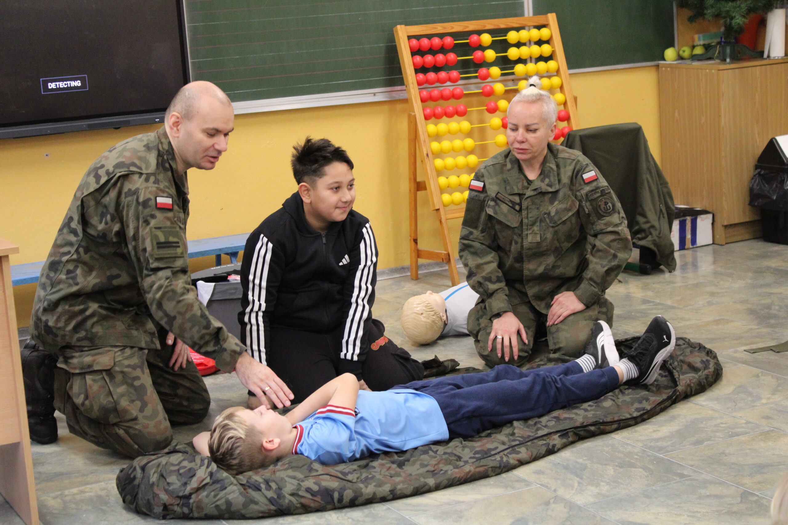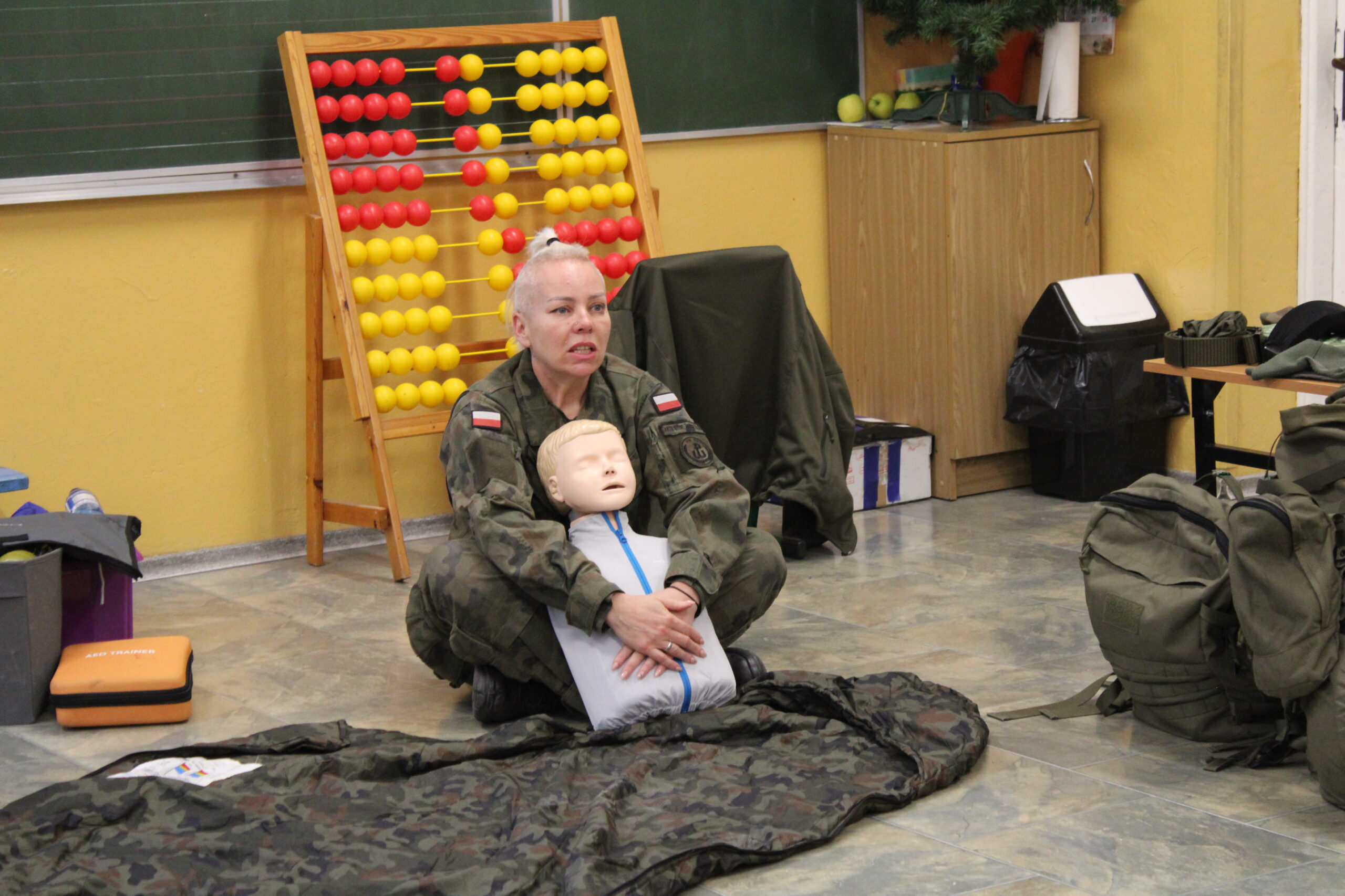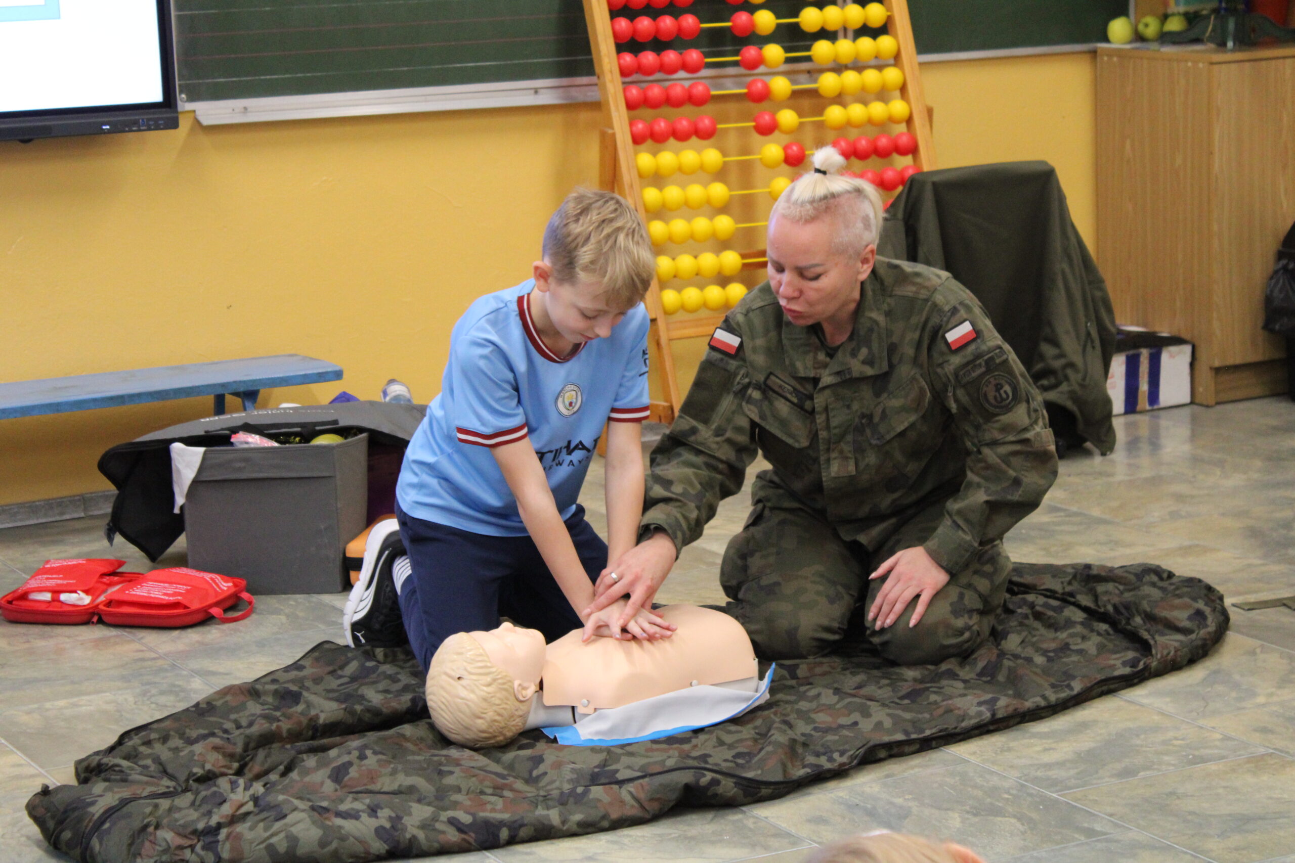 „Edukacja z wojskiem” to ogólnopolski program realizowany przez Ministerstwo Edukacji Narodowej we współpracy z Ministerstwem Obrony Narodowej. W ramach realizacji programu dziś naszą szkołę odwiedzili żołnierze 64 Batalionu Lekkiej Piechoty w Pomiechówku , kpr. Sylwester Pamięta i szer. Jolanta Kęsicka. Żołnierze przeprowadzili z uczniami klas 0-III zajęcia połączone z ćwiczeniami praktycznymi na temat alarmowania służb ratunkowych, bezpiecznego zachowania się w sytuacjach zagrożenia, udzielania pierwszej pomocy. Wszyscy uczniowie brali aktywny udział w zajęciach ucząc się prawidłowych reakcji w sytuacjach zagrożenia życia swojego i innych. Dużą ciekawość wzbudziło wyposażenie plecaka wojskowego, którego waga przekracza niekiedy 40 kg. Dzieci zobaczyły w nim min. tzw. czekoladki czyli ochraniacze na kolana i łokcie, słuchawki chroniące uszy przed hałasem, opaskę z czerwonym światełkiem, pelerynę maskującą, rękawiczki do strzelania . Nie mniejszą ciekawość wzbudziły tzw. eski czyli racje żywnościowe składające się z trzech posiłków, mających zapewnić żołnierzom dobowe wyżywienie. Dzieci podziękowały żołnierzom oklaskami , zrobiliśmy też wspólne zdjęcie. To było dla nas wyjątkowe spotkanie , spotkanie z polskim mundurem !