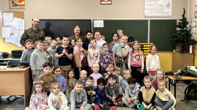 „Edukacja z wojskiem” to ogólnopolski program realizowany przez Ministerstwo Edukacji Narodowej we współpracy z Ministerstwem Obrony Narodowej. W ramach realizacji programu dziś naszą szkołę odwiedzili żołnierze 64 Batalionu Lekkiej Piechoty w Pomiechówku , kpr. Sylwester Pamięta i szer. Jolanta Kęsicka. Żołnierze przeprowadzili z uczniami klas 0-III zajęcia połączone z ćwiczeniami praktycznymi na temat alarmowania służb ratunkowych, bezpiecznego zachowania się w sytuacjach zagrożenia, udzielania pierwszej pomocy. Wszyscy uczniowie brali aktywny udział w zajęciach ucząc się prawidłowych reakcji w sytuacjach zagrożenia życia swojego i innych. Dużą ciekawość wzbudziło wyposażenie plecaka wojskowego, którego waga przekracza niekiedy 40 kg. Dzieci zobaczyły w nim min. tzw. czekoladki czyli ochraniacze na kolana i łokcie, słuchawki chroniące uszy przed hałasem, opaskę z czerwonym światełkiem, pelerynę maskującą, rękawiczki do strzelania . Nie mniejszą ciekawość wzbudziły tzw. eski czyli racje żywnościowe składające się z trzech posiłków, mających zapewnić żołnierzom dobowe wyżywienie. Dzieci podziękowały żołnierzom oklaskami , zrobiliśmy też wspólne zdjęcie. To było dla nas wyjątkowe spotkanie , spotkanie z polskim mundurem !