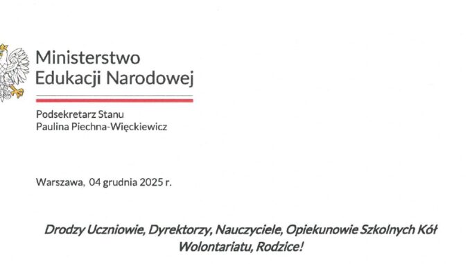 List Pani Pauliny Piechny-Więckiewicz, Podsekretarz Stanu w Ministerstwie Edukacji Narodowej z okazji Międzynarodowego Dnia Wolontariusza